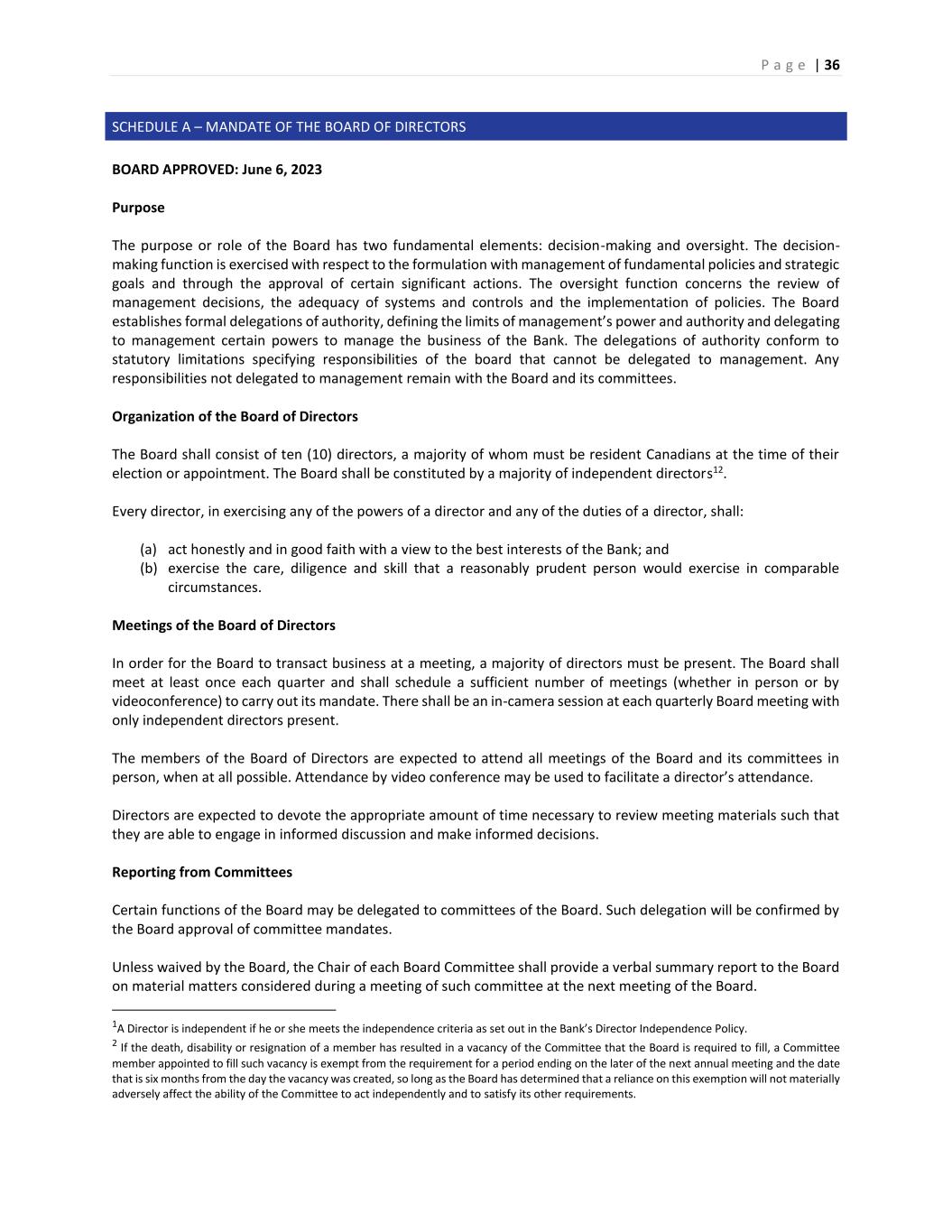 P a g e | 36 SCHEDULE A – MANDATE OF THE BOARD OF DIRECTORS BOARD APPROVED: June 6, 2023 Purpose The purpose or role of the Board has two fundamental elements: decision-making and oversight. The decision- making function is exercised with respect to the formulation with management of fundamental policies and strategic goals and through the approval of certain significant actions. The oversight function concerns the review of management decisions, the adequacy of systems and controls and the implementation of policies. The Board establishes formal delegations of authority, defining the limits of management’s power and authority and delegating to management certain powers to manage the business of the Bank. The delegations of authority conform to statutory limitations specifying responsibilities of the board that cannot be delegated to management. Any responsibilities not delegated to management remain with the Board and its committees. Organization of the Board of Directors The Board shall consist of ten (10) directors, a majority of whom must be resident Canadians at the time of their election or appointment. The Board shall be constituted by a majority of independent directors12. Every director, in exercising any of the powers of a director and any of the duties of a director, shall: (a) act honestly and in good faith with a view to the best interests of the Bank; and (b) exercise the care, diligence and skill that a reasonably prudent person would exercise in comparable circumstances. Meetings of the Board of Directors In order for the Board to transact business at a meeting, a majority of directors must be present. The Board shall meet at least once each quarter and shall schedule a sufficient number of meetings (whether in person or by videoconference) to carry out its mandate. There shall be an in-camera session at each quarterly Board meeting with only independent directors present. The members of the Board of Directors are expected to attend all meetings of the Board and its committees in person, when at all possible. Attendance by video conference may be used to facilitate a director’s attendance. Directors are expected to devote the appropriate amount of time necessary to review meeting materials such that they are able to engage in informed discussion and make informed decisions. Reporting from Committees Certain functions of the Board may be delegated to committees of the Board. Such delegation will be confirmed by the Board approval of committee mandates. Unless waived by the Board, the Chair of each Board Committee shall provide a verbal summary report to the Board on material matters considered during a meeting of such committee at the next meeting of the Board. 1A Director is independent if he or she meets the independence criteria as set out in the Bank’s Director Independence Policy. 2 If the death, disability or resignation of a member has resulted in a vacancy of the Committee that the Board is required to fill, a Committee member appointed to fill such vacancy is exempt from the requirement for a period ending on the later of the next annual meeting and the date that is six months from the day the vacancy was created, so long as the Board has determined that a reliance on this exemption will not materially adversely affect the ability of the Committee to act independently and to satisfy its other requirements.