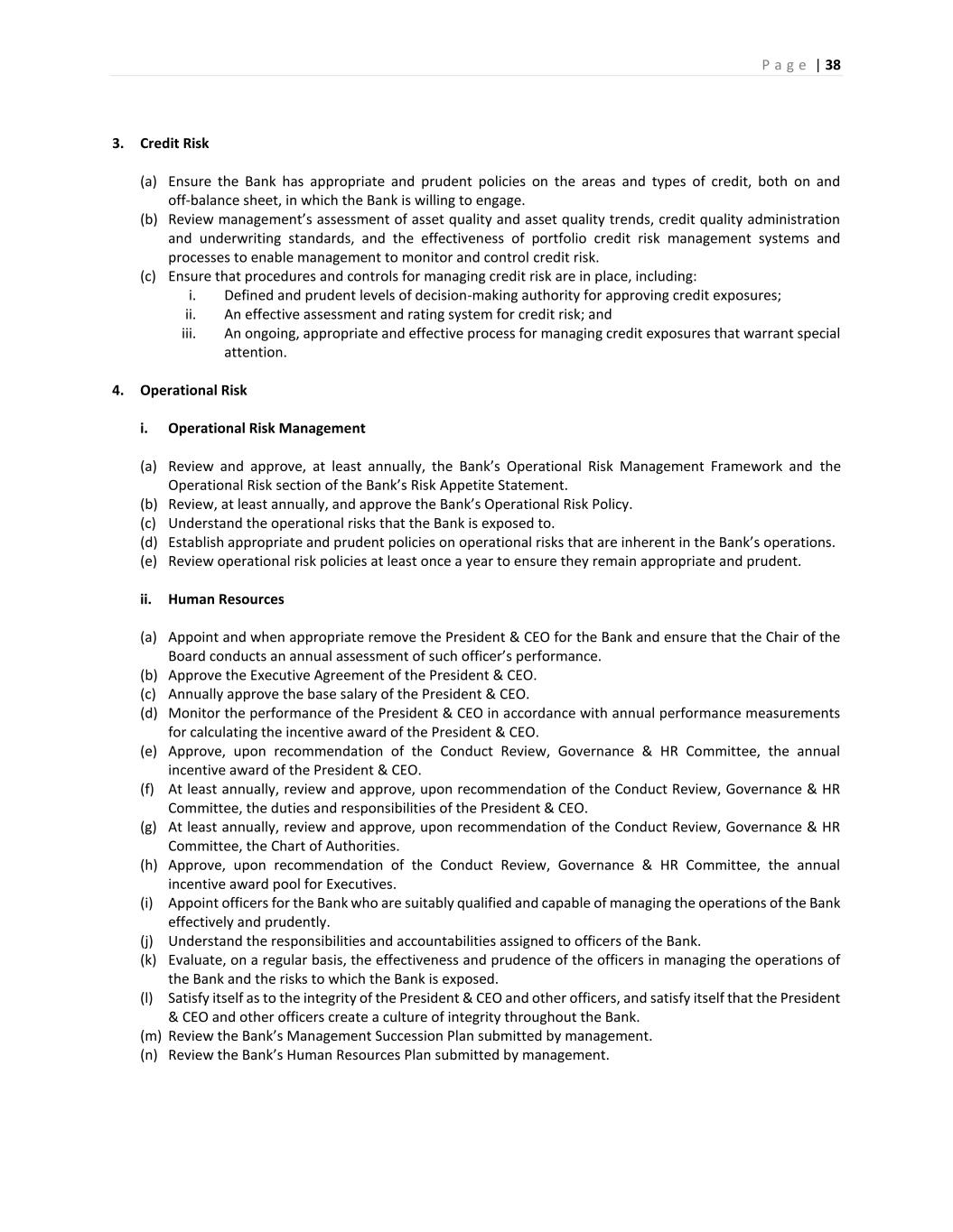 P a g e | 38 3. Credit Risk (a) Ensure the Bank has appropriate and prudent policies on the areas and types of credit, both on and off-balance sheet, in which the Bank is willing to engage. (b) Review management’s assessment of asset quality and asset quality trends, credit quality administration and underwriting standards, and the effectiveness of portfolio credit risk management systems and processes to enable management to monitor and control credit risk. (c) Ensure that procedures and controls for managing credit risk are in place, including: i. Defined and prudent levels of decision-making authority for approving credit exposures; ii. An effective assessment and rating system for credit risk; and iii. An ongoing, appropriate and effective process for managing credit exposures that warrant special attention. 4. Operational Risk i. Operational Risk Management (a) Review and approve, at least annually, the Bank’s Operational Risk Management Framework and the Operational Risk section of the Bank’s Risk Appetite Statement. (b) Review, at least annually, and approve the Bank’s Operational Risk Policy. (c) Understand the operational risks that the Bank is exposed to. (d) Establish appropriate and prudent policies on operational risks that are inherent in the Bank’s operations. (e) Review operational risk policies at least once a year to ensure they remain appropriate and prudent. ii. Human Resources (a) Appoint and when appropriate remove the President & CEO for the Bank and ensure that the Chair of the Board conducts an annual assessment of such officer’s performance. (b) Approve the Executive Agreement of the President & CEO. (c) Annually approve the base salary of the President & CEO. (d) Monitor the performance of the President & CEO in accordance with annual performance measurements for calculating the incentive award of the President & CEO. (e) Approve, upon recommendation of the Conduct Review, Governance & HR Committee, the annual incentive award of the President & CEO. (f) At least annually, review and approve, upon recommendation of the Conduct Review, Governance & HR Committee, the duties and responsibilities of the President & CEO. (g) At least annually, review and approve, upon recommendation of the Conduct Review, Governance & HR Committee, the Chart of Authorities. (h) Approve, upon recommendation of the Conduct Review, Governance & HR Committee, the annual incentive award pool for Executives. (i) Appoint officers for the Bank who are suitably qualified and capable of managing the operations of the Bank effectively and prudently. (j) Understand the responsibilities and accountabilities assigned to officers of the Bank. (k) Evaluate, on a regular basis, the effectiveness and prudence of the officers in managing the operations of the Bank and the risks to which the Bank is exposed. (l) Satisfy itself as to the integrity of the President & CEO and other officers, and satisfy itself that the President & CEO and other officers create a culture of integrity throughout the Bank. (m) Review the Bank’s Management Succession Plan submitted by management. (n) Review the Bank’s Human Resources Plan submitted by management.