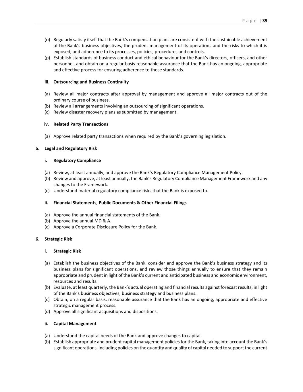P a g e | 39 (o) Regularly satisfy itself that the Bank’s compensation plans are consistent with the sustainable achievement of the Bank’s business objectives, the prudent management of its operations and the risks to which it is exposed, and adherence to its processes, policies, procedures and controls. (p) Establish standards of business conduct and ethical behaviour for the Bank’s directors, officers, and other personnel, and obtain on a regular basis reasonable assurance that the Bank has an ongoing, appropriate and effective process for ensuring adherence to those standards. iii. Outsourcing and Business Continuity (a) Review all major contracts after approval by management and approve all major contracts out of the ordinary course of business. (b) Review all arrangements involving an outsourcing of significant operations. (c) Review disaster recovery plans as submitted by management. iv. Related Party Transactions (a) Approve related party transactions when required by the Bank’s governing legislation. 5. Legal and Regulatory Risk i. Regulatory Compliance (a) Review, at least annually, and approve the Bank’s Regulatory Compliance Management Policy. (b) Review and approve, at least annually, the Bank’s Regulatory Compliance Management Framework and any changes to the Framework. (c) Understand material regulatory compliance risks that the Bank is exposed to. ii. Financial Statements, Public Documents & Other Financial Filings (a) Approve the annual financial statements of the Bank. (b) Approve the annual MD & A. (c) Approve a Corporate Disclosure Policy for the Bank. 6. Strategic Risk i. Strategic Risk (a) Establish the business objectives of the Bank, consider and approve the Bank’s business strategy and its business plans for significant operations, and review those things annually to ensure that they remain appropriate and prudent in light of the Bank’s current and anticipated business and economic environment, resources and results. (b) Evaluate, at least quarterly, the Bank’s actual operating and financial results against forecast results, in light of the Bank’s business objectives, business strategy and business plans. (c) Obtain, on a regular basis, reasonable assurance that the Bank has an ongoing, appropriate and effective strategic management process. (d) Approve all significant acquisitions and dispositions. ii. Capital Management (a) Understand the capital needs of the Bank and approve changes to capital. (b) Establish appropriate and prudent capital management policies for the Bank, taking into account the Bank’s significant operations, including policies on the quantity and quality of capital needed to support the current