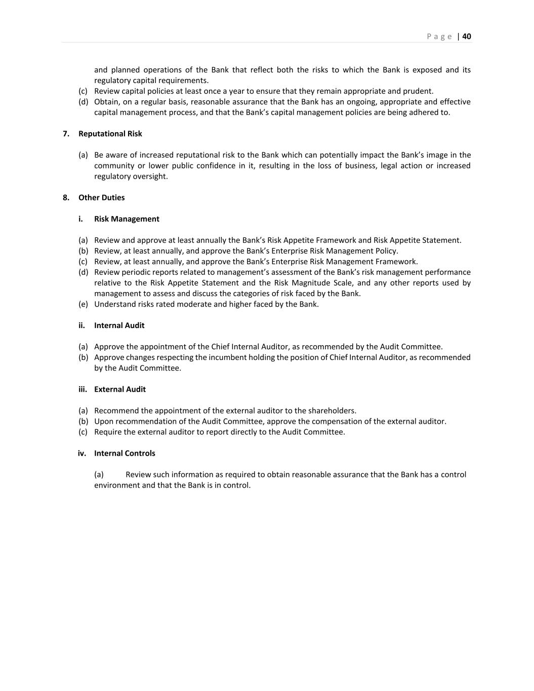 P a g e | 40 and planned operations of the Bank that reflect both the risks to which the Bank is exposed and its regulatory capital requirements. (c) Review capital policies at least once a year to ensure that they remain appropriate and prudent. (d) Obtain, on a regular basis, reasonable assurance that the Bank has an ongoing, appropriate and effective capital management process, and that the Bank’s capital management policies are being adhered to. 7. Reputational Risk (a) Be aware of increased reputational risk to the Bank which can potentially impact the Bank’s image in the community or lower public confidence in it, resulting in the loss of business, legal action or increased regulatory oversight. 8. Other Duties i. Risk Management (a) Review and approve at least annually the Bank’s Risk Appetite Framework and Risk Appetite Statement. (b) Review, at least annually, and approve the Bank’s Enterprise Risk Management Policy. (c) Review, at least annually, and approve the Bank’s Enterprise Risk Management Framework. (d) Review periodic reports related to management’s assessment of the Bank’s risk management performance relative to the Risk Appetite Statement and the Risk Magnitude Scale, and any other reports used by management to assess and discuss the categories of risk faced by the Bank. (e) Understand risks rated moderate and higher faced by the Bank. ii. Internal Audit (a) Approve the appointment of the Chief Internal Auditor, as recommended by the Audit Committee. (b) Approve changes respecting the incumbent holding the position of Chief Internal Auditor, as recommended by the Audit Committee. iii. External Audit (a) Recommend the appointment of the external auditor to the shareholders. (b) Upon recommendation of the Audit Committee, approve the compensation of the external auditor. (c) Require the external auditor to report directly to the Audit Committee. iv. Internal Controls (a) Review such information as required to obtain reasonable assurance that the Bank has a control environment and that the Bank is in control.