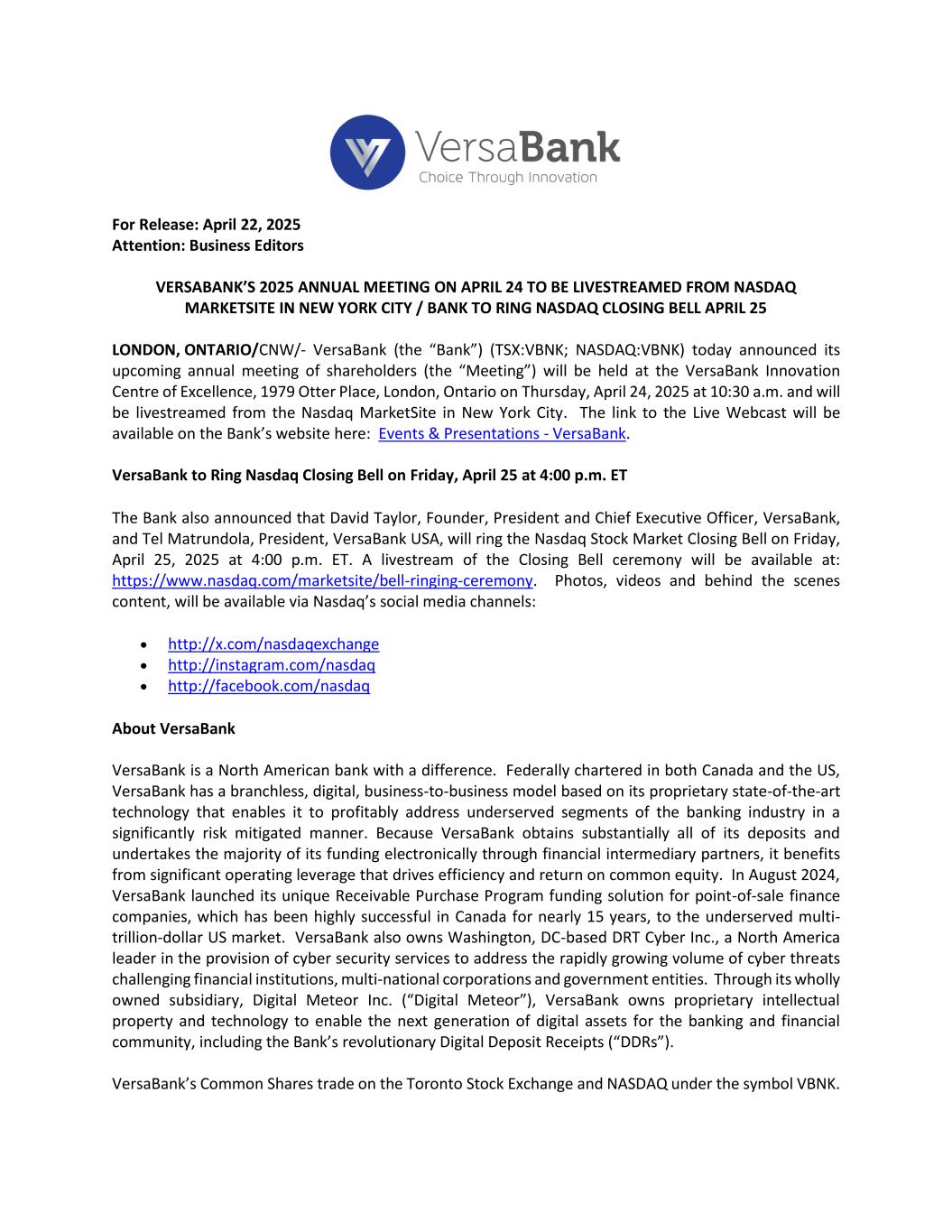 For Release: April 22, 2025 Attention: Business Editors VERSABANK’S 2025 ANNUAL MEETING ON APRIL 24 TO BE LIVESTREAMED FROM NASDAQ MARKETSITE IN NEW YORK CITY / BANK TO RING NASDAQ CLOSING BELL APRIL 25 LONDON, ONTARIO/CNW/- VersaBank (the “Bank”) (TSX:VBNK; NASDAQ:VBNK) today announced its upcoming annual meeting of shareholders (the “Meeting”) will be held at the VersaBank Innovation Centre of Excellence, 1979 Otter Place, London, Ontario on Thursday, April 24, 2025 at 10:30 a.m. and will be livestreamed from the Nasdaq MarketSite in New York City. The link to the Live Webcast will be available on the Bank’s website here: Events & Presentations - VersaBank. VersaBank to Ring Nasdaq Closing Bell on Friday, April 25 at 4:00 p.m. ET The Bank also announced that David Taylor, Founder, President and Chief Executive Officer, VersaBank, and Tel Matrundola, President, VersaBank USA, will ring the Nasdaq Stock Market Closing Bell on Friday, April 25, 2025 at 4:00 p.m. ET. A livestream of the Closing Bell ceremony will be available at: https://www.nasdaq.com/marketsite/bell-ringing-ceremony. Photos, videos and behind the scenes content, will be available via Nasdaq’s social media channels: • http://x.com/nasdaqexchange • http://instagram.com/nasdaq • http://facebook.com/nasdaq About VersaBank VersaBank is a North American bank with a difference. Federally chartered in both Canada and the US, VersaBank has a branchless, digital, business-to-business model based on its proprietary state-of-the-art technology that enables it to profitably address underserved segments of the banking industry in a significantly risk mitigated manner. Because VersaBank obtains substantially all of its deposits and undertakes the majority of its funding electronically through financial intermediary partners, it benefits from significant operating leverage that drives efficiency and return on common equity. In August 2024, VersaBank launched its unique Receivable Purchase Program funding solution for point-of-sale finance companies, which has been highly successful in Canada for nearly 15 years, to the underserved multi- trillion-dollar US market. VersaBank also owns Washington, DC-based DRT Cyber Inc., a North America leader in the provision of cyber security services to address the rapidly growing volume of cyber threats challenging financial institutions, multi-national corporations and government entities. Through its wholly owned subsidiary, Digital Meteor Inc. (“Digital Meteor”), VersaBank owns proprietary intellectual property and technology to enable the next generation of digital assets for the banking and financial community, including the Bank’s revolutionary Digital Deposit Receipts (“DDRs”). VersaBank’s Common Shares trade on the Toronto Stock Exchange and NASDAQ under the symbol VBNK.