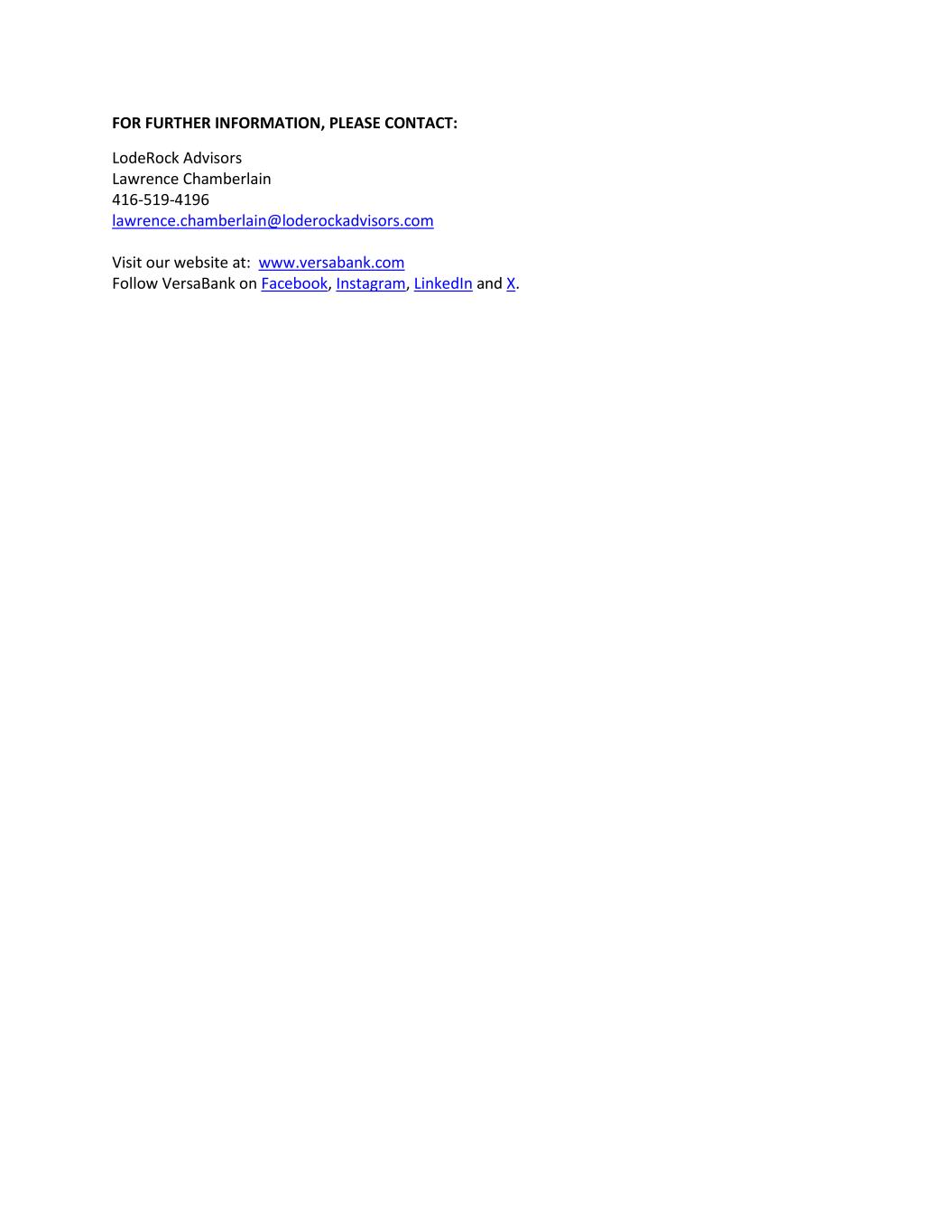 FOR FURTHER INFORMATION, PLEASE CONTACT: LodeRock Advisors Lawrence Chamberlain 416-519-4196 lawrence.chamberlain@loderockadvisors.com Visit our website at: www.versabank.com Follow VersaBank on Facebook, Instagram, LinkedIn and X.
