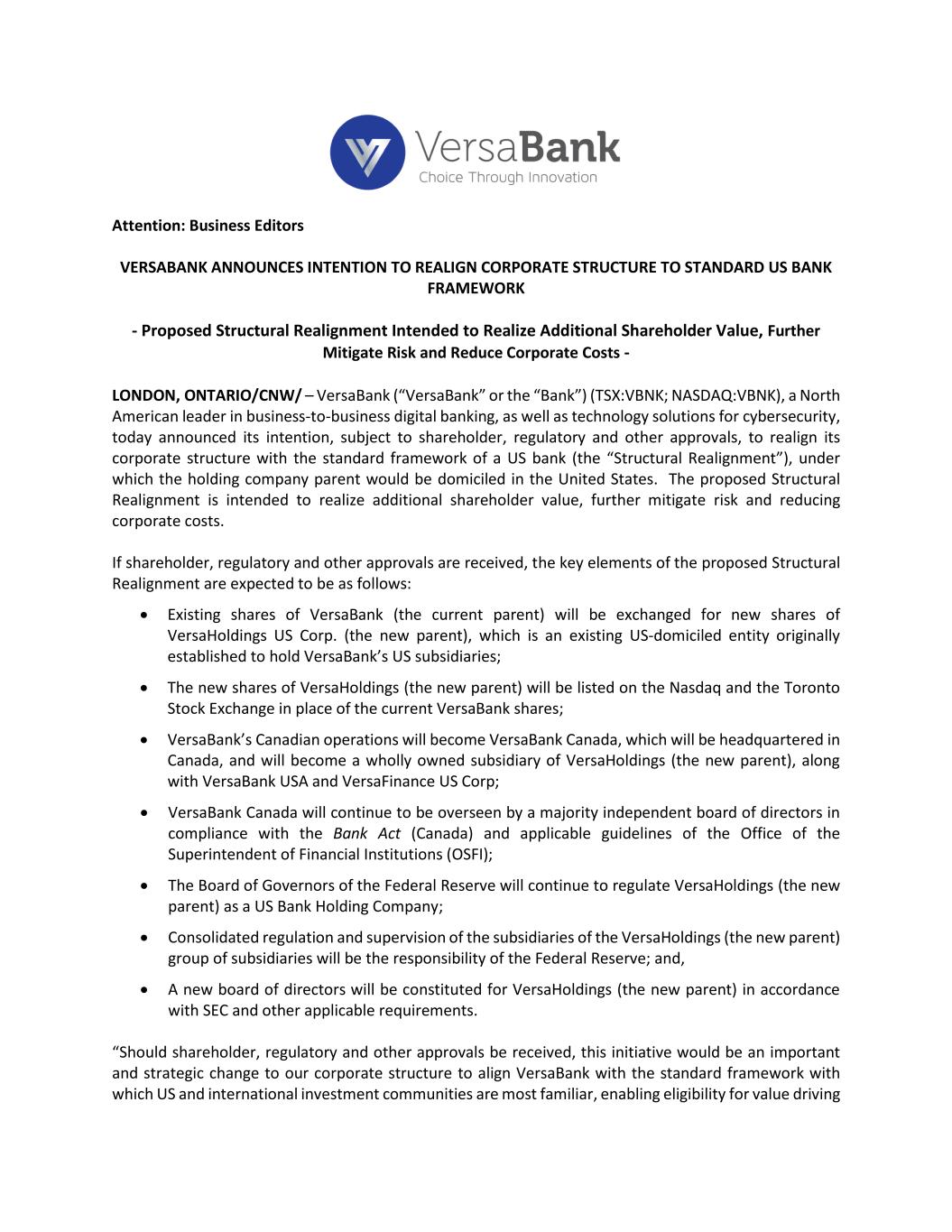 Attention: Business Editors VERSABANK ANNOUNCES INTENTION TO REALIGN CORPORATE STRUCTURE TO STANDARD US BANK FRAMEWORK - Proposed Structural Realignment Intended to Realize Additional Shareholder Value, Further Mitigate Risk and Reduce Corporate Costs - LONDON, ONTARIO/CNW/ – VersaBank (“VersaBank” or the “Bank”) (TSX:VBNK; NASDAQ:VBNK), a North American leader in business-to-business digital banking, as well as technology solutions for cybersecurity, today announced its intention, subject to shareholder, regulatory and other approvals, to realign its corporate structure with the standard framework of a US bank (the “Structural Realignment”), under which the holding company parent would be domiciled in the United States. The proposed Structural Realignment is intended to realize additional shareholder value, further mitigate risk and reducing corporate costs. If shareholder, regulatory and other approvals are received, the key elements of the proposed Structural Realignment are expected to be as follows: • Existing shares of VersaBank (the current parent) will be exchanged for new shares of VersaHoldings US Corp. (the new parent), which is an existing US-domiciled entity originally established to hold VersaBank’s US subsidiaries; • The new shares of VersaHoldings (the new parent) will be listed on the Nasdaq and the Toronto Stock Exchange in place of the current VersaBank shares; • VersaBank’s Canadian operations will become VersaBank Canada, which will be headquartered in Canada, and will become a wholly owned subsidiary of VersaHoldings (the new parent), along with VersaBank USA and VersaFinance US Corp; • VersaBank Canada will continue to be overseen by a majority independent board of directors in compliance with the Bank Act (Canada) and applicable guidelines of the Office of the Superintendent of Financial Institutions (OSFI); • The Board of Governors of the Federal Reserve will continue to regulate VersaHoldings (the new parent) as a US Bank Holding Company; • Consolidated regulation and supervision of the subsidiaries of the VersaHoldings (the new parent) group of subsidiaries will be the responsibility of the Federal Reserve; and, • A new board of directors will be constituted for VersaHoldings (the new parent) in accordance with SEC and other applicable requirements. “Should shareholder, regulatory and other approvals be received, this initiative would be an important and strategic change to our corporate structure to align VersaBank with the standard framework with which US and international investment communities are most familiar, enabling eligibility for value driving
