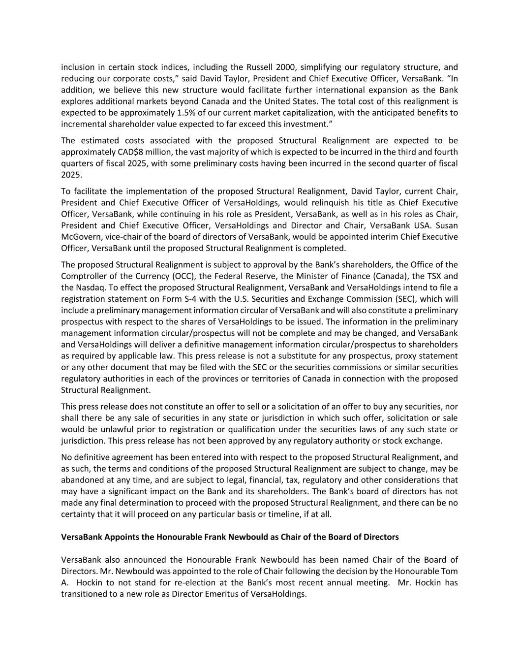 inclusion in certain stock indices, including the Russell 2000, simplifying our regulatory structure, and reducing our corporate costs,” said David Taylor, President and Chief Executive Officer, VersaBank. “In addition, we believe this new structure would facilitate further international expansion as the Bank explores additional markets beyond Canada and the United States. The total cost of this realignment is expected to be approximately 1.5% of our current market capitalization, with the anticipated benefits to incremental shareholder value expected to far exceed this investment.” The estimated costs associated with the proposed Structural Realignment are expected to be approximately CAD$8 million, the vast majority of which is expected to be incurred in the third and fourth quarters of fiscal 2025, with some preliminary costs having been incurred in the second quarter of fiscal 2025. To facilitate the implementation of the proposed Structural Realignment, David Taylor, current Chair, President and Chief Executive Officer of VersaHoldings, would relinquish his title as Chief Executive Officer, VersaBank, while continuing in his role as President, VersaBank, as well as in his roles as Chair, President and Chief Executive Officer, VersaHoldings and Director and Chair, VersaBank USA. Susan McGovern, vice-chair of the board of directors of VersaBank, would be appointed interim Chief Executive Officer, VersaBank until the proposed Structural Realignment is completed. The proposed Structural Realignment is subject to approval by the Bank’s shareholders, the Office of the Comptroller of the Currency (OCC), the Federal Reserve, the Minister of Finance (Canada), the TSX and the Nasdaq. To effect the proposed Structural Realignment, VersaBank and VersaHoldings intend to file a registration statement on Form S-4 with the U.S. Securities and Exchange Commission (SEC), which will include a preliminary management information circular of VersaBank and will also constitute a preliminary prospectus with respect to the shares of VersaHoldings to be issued. The information in the preliminary management information circular/prospectus will not be complete and may be changed, and VersaBank and VersaHoldings will deliver a definitive management information circular/prospectus to shareholders as required by applicable law. This press release is not a substitute for any prospectus, proxy statement or any other document that may be filed with the SEC or the securities commissions or similar securities regulatory authorities in each of the provinces or territories of Canada in connection with the proposed Structural Realignment. This press release does not constitute an offer to sell or a solicitation of an offer to buy any securities, nor shall there be any sale of securities in any state or jurisdiction in which such offer, solicitation or sale would be unlawful prior to registration or qualification under the securities laws of any such state or jurisdiction. This press release has not been approved by any regulatory authority or stock exchange. No definitive agreement has been entered into with respect to the proposed Structural Realignment, and as such, the terms and conditions of the proposed Structural Realignment are subject to change, may be abandoned at any time, and are subject to legal, financial, tax, regulatory and other considerations that may have a significant impact on the Bank and its shareholders. The Bank’s board of directors has not made any final determination to proceed with the proposed Structural Realignment, and there can be no certainty that it will proceed on any particular basis or timeline, if at all. VersaBank Appoints the Honourable Frank Newbould as Chair of the Board of Directors VersaBank also announced the Honourable Frank Newbould has been named Chair of the Board of Directors. Mr. Newbould was appointed to the role of Chair following the decision by the Honourable Tom A. Hockin to not stand for re-election at the Bank’s most recent annual meeting. Mr. Hockin has transitioned to a new role as Director Emeritus of VersaHoldings.