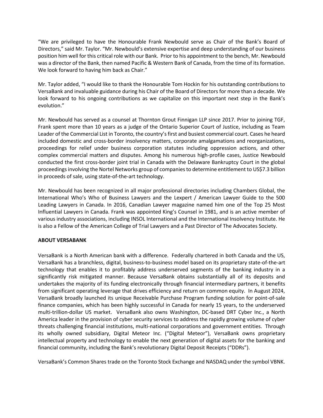 “We are privileged to have the Honourable Frank Newbould serve as Chair of the Bank’s Board of Directors,” said Mr. Taylor. “Mr. Newbould’s extensive expertise and deep understanding of our business position him well for this critical role with our Bank. Prior to his appointment to the bench, Mr. Newbould was a director of the Bank, then named Pacific & Western Bank of Canada, from the time of its formation. We look forward to having him back as Chair.” Mr. Taylor added, “I would like to thank the Honourable Tom Hockin for his outstanding contributions to VersaBank and invaluable guidance during his Chair of the Board of Directors for more than a decade. We look forward to his ongoing contributions as we capitalize on this important next step in the Bank’s evolution.” Mr. Newbould has served as a counsel at Thornton Grout Finnigan LLP since 2017. Prior to joining TGF, Frank spent more than 10 years as a judge of the Ontario Superior Court of Justice, including as Team Leader of the Commercial List in Toronto, the country’s first and busiest commercial court. Cases he heard included domestic and cross-border insolvency matters, corporate amalgamations and reorganizations, proceedings for relief under business corporation statutes including oppression actions, and other complex commercial matters and disputes. Among his numerous high-profile cases, Justice Newbould conducted the first cross-border joint trial in Canada with the Delaware Bankruptcy Court in the global proceedings involving the Nortel Networks group of companies to determine entitlement to US$7.3 billion in proceeds of sale, using state-of-the-art technology. Mr. Newbould has been recognized in all major professional directories including Chambers Global, the International Who’s Who of Business Lawyers and the Lexpert / American Lawyer Guide to the 500 Leading Lawyers in Canada. In 2016, Canadian Lawyer magazine named him one of the Top 25 Most Influential Lawyers in Canada. Frank was appointed King’s Counsel in 1981, and is an active member of various industry associations, including INSOL International and the International Insolvency Institute. He is also a Fellow of the American College of Trial Lawyers and a Past Director of The Advocates Society. ABOUT VERSABANK VersaBank is a North American bank with a difference. Federally chartered in both Canada and the US, VersaBank has a branchless, digital, business-to-business model based on its proprietary state-of-the-art technology that enables it to profitably address underserved segments of the banking industry in a significantly risk mitigated manner. Because VersaBank obtains substantially all of its deposits and undertakes the majority of its funding electronically through financial intermediary partners, it benefits from significant operating leverage that drives efficiency and return on common equity. In August 2024, VersaBank broadly launched its unique Receivable Purchase Program funding solution for point-of-sale finance companies, which has been highly successful in Canada for nearly 15 years, to the underserved multi-trillion-dollar US market. VersaBank also owns Washington, DC-based DRT Cyber Inc., a North America leader in the provision of cyber security services to address the rapidly growing volume of cyber threats challenging financial institutions, multi-national corporations and government entities. Through its wholly owned subsidiary, Digital Meteor Inc. (“Digital Meteor”), VersaBank owns proprietary intellectual property and technology to enable the next generation of digital assets for the banking and financial community, including the Bank’s revolutionary Digital Deposit Receipts (“DDRs”). VersaBank’s Common Shares trade on the Toronto Stock Exchange and NASDAQ under the symbol VBNK.