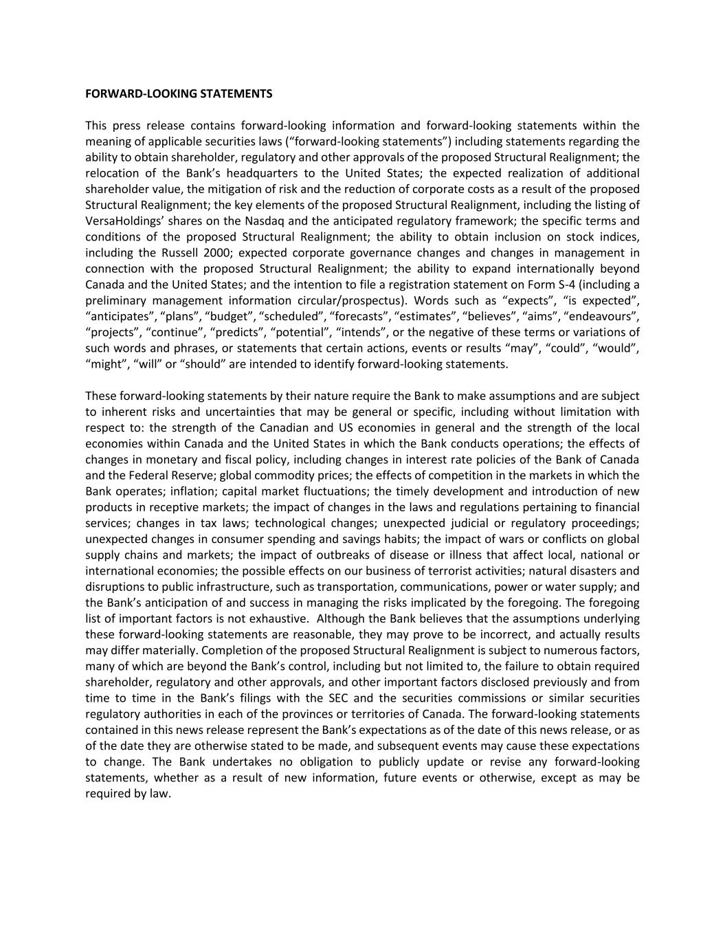 FORWARD-LOOKING STATEMENTS This press release contains forward-looking information and forward-looking statements within the meaning of applicable securities laws (“forward-looking statements”) including statements regarding the ability to obtain shareholder, regulatory and other approvals of the proposed Structural Realignment; the relocation of the Bank’s headquarters to the United States; the expected realization of additional shareholder value, the mitigation of risk and the reduction of corporate costs as a result of the proposed Structural Realignment; the key elements of the proposed Structural Realignment, including the listing of VersaHoldings’ shares on the Nasdaq and the anticipated regulatory framework; the specific terms and conditions of the proposed Structural Realignment; the ability to obtain inclusion on stock indices, including the Russell 2000; expected corporate governance changes and changes in management in connection with the proposed Structural Realignment; the ability to expand internationally beyond Canada and the United States; and the intention to file a registration statement on Form S-4 (including a preliminary management information circular/prospectus). Words such as “expects”, “is expected”, “anticipates”, “plans”, “budget”, “scheduled”, “forecasts”, “estimates”, “believes”, “aims”, “endeavours”, “projects”, “continue”, “predicts”, “potential”, “intends”, or the negative of these terms or variations of such words and phrases, or statements that certain actions, events or results “may”, “could”, “would”, “might”, “will” or “should” are intended to identify forward-looking statements. These forward-looking statements by their nature require the Bank to make assumptions and are subject to inherent risks and uncertainties that may be general or specific, including without limitation with respect to: the strength of the Canadian and US economies in general and the strength of the local economies within Canada and the United States in which the Bank conducts operations; the effects of changes in monetary and fiscal policy, including changes in interest rate policies of the Bank of Canada and the Federal Reserve; global commodity prices; the effects of competition in the markets in which the Bank operates; inflation; capital market fluctuations; the timely development and introduction of new products in receptive markets; the impact of changes in the laws and regulations pertaining to financial services; changes in tax laws; technological changes; unexpected judicial or regulatory proceedings; unexpected changes in consumer spending and savings habits; the impact of wars or conflicts on global supply chains and markets; the impact of outbreaks of disease or illness that affect local, national or international economies; the possible effects on our business of terrorist activities; natural disasters and disruptions to public infrastructure, such as transportation, communications, power or water supply; and the Bank’s anticipation of and success in managing the risks implicated by the foregoing. The foregoing list of important factors is not exhaustive. Although the Bank believes that the assumptions underlying these forward-looking statements are reasonable, they may prove to be incorrect, and actually results may differ materially. Completion of the proposed Structural Realignment is subject to numerous factors, many of which are beyond the Bank’s control, including but not limited to, the failure to obtain required shareholder, regulatory and other approvals, and other important factors disclosed previously and from time to time in the Bank’s filings with the SEC and the securities commissions or similar securities regulatory authorities in each of the provinces or territories of Canada. The forward-looking statements contained in this news release represent the Bank’s expectations as of the date of this news release, or as of the date they are otherwise stated to be made, and subsequent events may cause these expectations to change. The Bank undertakes no obligation to publicly update or revise any forward-looking statements, whether as a result of new information, future events or otherwise, except as may be required by law.