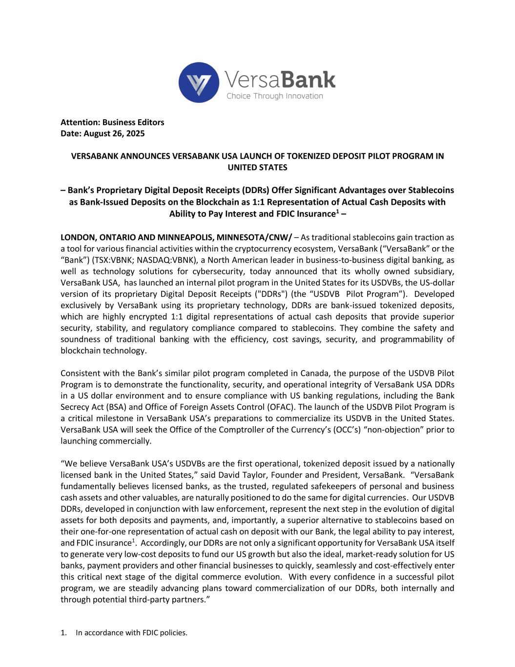 1. In accordance with FDIC policies. Attention: Business Editors Date: August 26, 2025 VERSABANK ANNOUNCES VERSABANK USA LAUNCH OF TOKENIZED DEPOSIT PILOT PROGRAM IN UNITED STATES – Bank’s Proprietary Digital Deposit Receipts (DDRs) Offer Significant Advantages over Stablecoins as Bank-Issued Deposits on the Blockchain as 1:1 Representation of Actual Cash Deposits with Ability to Pay Interest and FDIC Insurance1 – LONDON, ONTARIO AND MINNEAPOLIS, MINNESOTA/CNW/ – As traditional stablecoins gain traction as a tool for various financial activities within the cryptocurrency ecosystem, VersaBank (“VersaBank” or the “Bank”) (TSX:VBNK; NASDAQ:VBNK), a North American leader in business-to-business digital banking, as well as technology solutions for cybersecurity, today announced that its wholly owned subsidiary, VersaBank USA, has launched an internal pilot program in the United States for its USDVBs, the US-dollar version of its proprietary Digital Deposit Receipts ("DDRs") (the “USDVB Pilot Program”). Developed exclusively by VersaBank using its proprietary technology, DDRs are bank-issued tokenized deposits, which are highly encrypted 1:1 digital representations of actual cash deposits that provide superior security, stability, and regulatory compliance compared to stablecoins. They combine the safety and soundness of traditional banking with the efficiency, cost savings, security, and programmability of blockchain technology. Consistent with the Bank’s similar pilot program completed in Canada, the purpose of the USDVB Pilot Program is to demonstrate the functionality, security, and operational integrity of VersaBank USA DDRs in a US dollar environment and to ensure compliance with US banking regulations, including the Bank Secrecy Act (BSA) and Office of Foreign Assets Control (OFAC). The launch of the USDVB Pilot Program is a critical milestone in VersaBank USA’s preparations to commercialize its USDVB in the United States. VersaBank USA will seek the Office of the Comptroller of the Currency’s (OCC’s) “non-objection” prior to launching commercially. “We believe VersaBank USA’s USDVBs are the first operational, tokenized deposit issued by a nationally licensed bank in the United States,” said David Taylor, Founder and President, VersaBank. “VersaBank fundamentally believes licensed banks, as the trusted, regulated safekeepers of personal and business cash assets and other valuables, are naturally positioned to do the same for digital currencies. Our USDVB DDRs, developed in conjunction with law enforcement, represent the next step in the evolution of digital assets for both deposits and payments, and, importantly, a superior alternative to stablecoins based on their one-for-one representation of actual cash on deposit with our Bank, the legal ability to pay interest, and FDIC insurance1. Accordingly, our DDRs are not only a significant opportunity for VersaBank USA itself to generate very low-cost deposits to fund our US growth but also the ideal, market-ready solution for US banks, payment providers and other financial businesses to quickly, seamlessly and cost-effectively enter this critical next stage of the digital commerce evolution. With every confidence in a successful pilot program, we are steadily advancing plans toward commercialization of our DDRs, both internally and through potential third-party partners.”