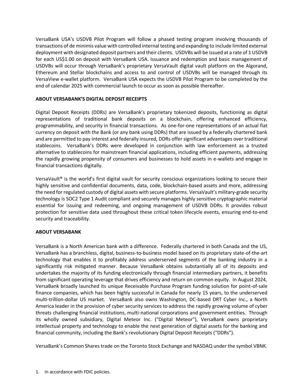 1. In accordance with FDIC policies. VersaBank USA’s USDVB Pilot Program will follow a phased testing program involving thousands of transactions of de minimis value with controlled internal testing and expanding to include limited external deployment with designated deposit partners and their clients. USDVBs will be issued at a rate of 1 USDVB for each US$1.00 on deposit with VersaBank USA. Issuance and redemption and basic management of USDVBs will occur through VersaBank’s proprietary VersaVault digital vault platform on the Algorand, Ethereum and Stellar blockchains and access to and control of USDVBs will be managed through its VersaView e-wallet platform. VersaBank USA expects the USDVB Pilot Program to be completed by the end of calendar 2025 with commercial launch to occur as soon as possible thereafter. ABOUT VERSABANK’S DIGITAL DEPOSIT RECEIPTS Digital Deposit Receipts (DDRs) are VersaBank’s proprietary tokenized deposits, functioning as digital representations of traditional bank deposits on a blockchain, offering enhanced efficiency, programmability, and security in financial transactions. As one-for-one representations of an actual fiat currency on deposit with the Bank (or any bank using DDRs) that are issued by a federally chartered bank and are permitted to pay interest and federally insured, DDRs offer significant advantages over traditional stablecoins. VersaBank’s DDRs were developed in conjunction with law enforcement as a trusted alternative to stablecoins for mainstream financial applications, including efficient payments, addressing the rapidly growing propensity of consumers and businesses to hold assets in e-wallets and engage in financial transactions digitally. VersaVault® is the world’s first digital vault for security conscious organizations looking to secure their highly sensitive and confidential documents, data, code, blockchain-based assets and more, addressing the need for regulated custody of digital assets with secure platforms. VersaVault’s military-grade security technology is SOC2 Type 1 Audit compliant and securely manages highly sensitive cryptographic material essential for issuing and redeeming, and ongoing management of USDVB DDRs. It provides robust protection for sensitive data used throughout these critical token lifecycle events, ensuring end-to-end security and traceability. ABOUT VERSABANK VersaBank is a North American bank with a difference. Federally chartered in both Canada and the US, VersaBank has a branchless, digital, business-to-business model based on its proprietary state-of-the-art technology that enables it to profitably address underserved segments of the banking industry in a significantly risk mitigated manner. Because VersaBank obtains substantially all of its deposits and undertakes the majority of its funding electronically through financial intermediary partners, it benefits from significant operating leverage that drives efficiency and return on common equity. In August 2024, VersaBank broadly launched its unique Receivable Purchase Program funding solution for point-of-sale finance companies, which has been highly successful in Canada for nearly 15 years, to the underserved multi-trillion-dollar US market. VersaBank also owns Washington, DC-based DRT Cyber Inc., a North America leader in the provision of cyber security services to address the rapidly growing volume of cyber threats challenging financial institutions, multi-national corporations and government entities. Through its wholly owned subsidiary, Digital Meteor Inc. (“Digital Meteor”), VersaBank owns proprietary intellectual property and technology to enable the next generation of digital assets for the banking and financial community, including the Bank’s revolutionary Digital Deposit Receipts (“DDRs”). VersaBank’s Common Shares trade on the Toronto Stock Exchange and NASDAQ under the symbol VBNK.