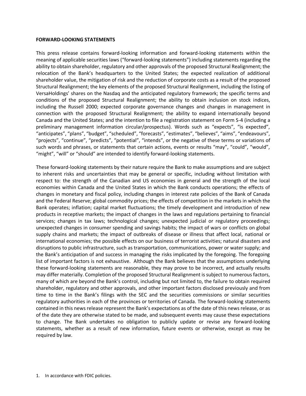 1. In accordance with FDIC policies. FORWARD-LOOKING STATEMENTS This press release contains forward-looking information and forward-looking statements within the meaning of applicable securities laws (“forward-looking statements”) including statements regarding the ability to obtain shareholder, regulatory and other approvals of the proposed Structural Realignment; the relocation of the Bank’s headquarters to the United States; the expected realization of additional shareholder value, the mitigation of risk and the reduction of corporate costs as a result of the proposed Structural Realignment; the key elements of the proposed Structural Realignment, including the listing of VersaHoldings’ shares on the Nasdaq and the anticipated regulatory framework; the specific terms and conditions of the proposed Structural Realignment; the ability to obtain inclusion on stock indices, including the Russell 2000; expected corporate governance changes and changes in management in connection with the proposed Structural Realignment; the ability to expand internationally beyond Canada and the United States; and the intention to file a registration statement on Form S-4 (including a preliminary management information circular/prospectus). Words such as “expects”, “is expected”, “anticipates”, “plans”, “budget”, “scheduled”, “forecasts”, “estimates”, “believes”, “aims”, “endeavours”, “projects”, “continue”, “predicts”, “potential”, “intends”, or the negative of these terms or variations of such words and phrases, or statements that certain actions, events or results “may”, “could”, “would”, “might”, “will” or “should” are intended to identify forward-looking statements. These forward-looking statements by their nature require the Bank to make assumptions and are subject to inherent risks and uncertainties that may be general or specific, including without limitation with respect to: the strength of the Canadian and US economies in general and the strength of the local economies within Canada and the United States in which the Bank conducts operations; the effects of changes in monetary and fiscal policy, including changes in interest rate policies of the Bank of Canada and the Federal Reserve; global commodity prices; the effects of competition in the markets in which the Bank operates; inflation; capital market fluctuations; the timely development and introduction of new products in receptive markets; the impact of changes in the laws and regulations pertaining to financial services; changes in tax laws; technological changes; unexpected judicial or regulatory proceedings; unexpected changes in consumer spending and savings habits; the impact of wars or conflicts on global supply chains and markets; the impact of outbreaks of disease or illness that affect local, national or international economies; the possible effects on our business of terrorist activities; natural disasters and disruptions to public infrastructure, such as transportation, communications, power or water supply; and the Bank’s anticipation of and success in managing the risks implicated by the foregoing. The foregoing list of important factors is not exhaustive. Although the Bank believes that the assumptions underlying these forward-looking statements are reasonable, they may prove to be incorrect, and actually results may differ materially. Completion of the proposed Structural Realignment is subject to numerous factors, many of which are beyond the Bank’s control, including but not limited to, the failure to obtain required shareholder, regulatory and other approvals, and other important factors disclosed previously and from time to time in the Bank’s filings with the SEC and the securities commissions or similar securities regulatory authorities in each of the provinces or territories of Canada. The forward-looking statements contained in this news release represent the Bank’s expectations as of the date of this news release, or as of the date they are otherwise stated to be made, and subsequent events may cause these expectations to change. The Bank undertakes no obligation to publicly update or revise any forward-looking statements, whether as a result of new information, future events or otherwise, except as may be required by law.