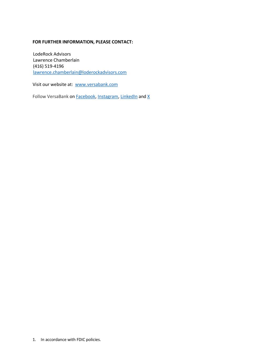 1. In accordance with FDIC policies. FOR FURTHER INFORMATION, PLEASE CONTACT: LodeRock Advisors Lawrence Chamberlain (416) 519-4196 lawrence.chamberlain@loderockadvisors.com Visit our website at: www.versabank.com Follow VersaBank on Facebook, Instagram, LinkedIn and X