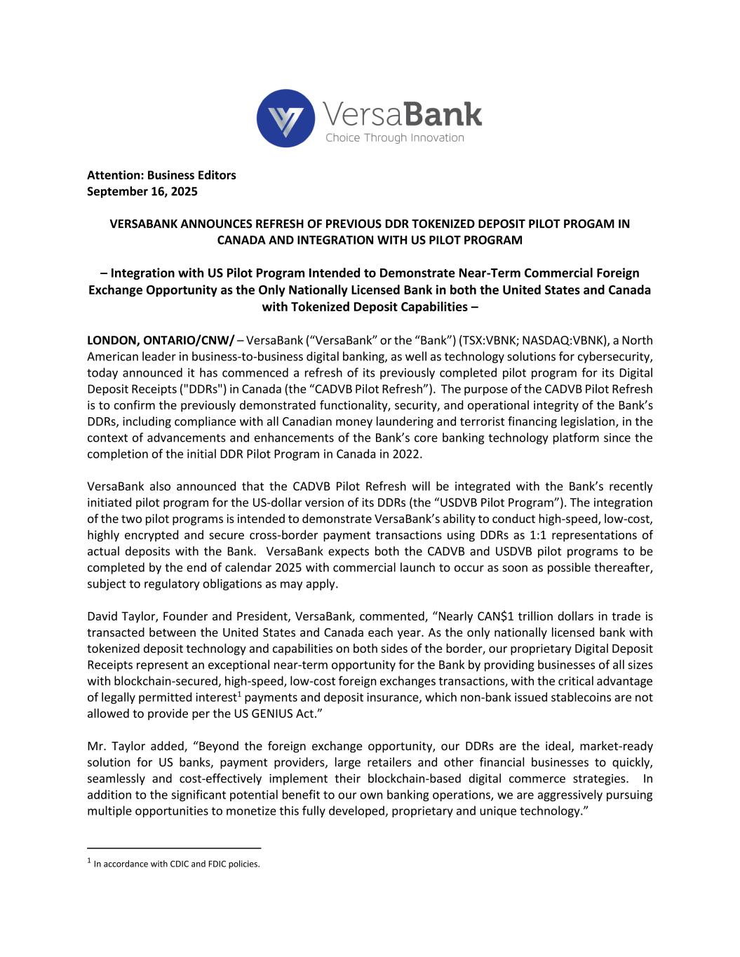 Attention: Business Editors September 16, 2025 VERSABANK ANNOUNCES REFRESH OF PREVIOUS DDR TOKENIZED DEPOSIT PILOT PROGAM IN CANADA AND INTEGRATION WITH US PILOT PROGRAM – Integration with US Pilot Program Intended to Demonstrate Near-Term Commercial Foreign Exchange Opportunity as the Only Nationally Licensed Bank in both the United States and Canada with Tokenized Deposit Capabilities – LONDON, ONTARIO/CNW/ – VersaBank (“VersaBank” or the “Bank”) (TSX:VBNK; NASDAQ:VBNK), a North American leader in business-to-business digital banking, as well as technology solutions for cybersecurity, today announced it has commenced a refresh of its previously completed pilot program for its Digital Deposit Receipts ("DDRs") in Canada (the “CADVB Pilot Refresh”). The purpose of the CADVB Pilot Refresh is to confirm the previously demonstrated functionality, security, and operational integrity of the Bank’s DDRs, including compliance with all Canadian money laundering and terrorist financing legislation, in the context of advancements and enhancements of the Bank’s core banking technology platform since the completion of the initial DDR Pilot Program in Canada in 2022. VersaBank also announced that the CADVB Pilot Refresh will be integrated with the Bank’s recently initiated pilot program for the US-dollar version of its DDRs (the “USDVB Pilot Program”). The integration of the two pilot programs is intended to demonstrate VersaBank’s ability to conduct high-speed, low-cost, highly encrypted and secure cross-border payment transactions using DDRs as 1:1 representations of actual deposits with the Bank. VersaBank expects both the CADVB and USDVB pilot programs to be completed by the end of calendar 2025 with commercial launch to occur as soon as possible thereafter, subject to regulatory obligations as may apply. David Taylor, Founder and President, VersaBank, commented, “Nearly CAN$1 trillion dollars in trade is transacted between the United States and Canada each year. As the only nationally licensed bank with tokenized deposit technology and capabilities on both sides of the border, our proprietary Digital Deposit Receipts represent an exceptional near-term opportunity for the Bank by providing businesses of all sizes with blockchain-secured, high-speed, low-cost foreign exchanges transactions, with the critical advantage of legally permitted interest1 payments and deposit insurance, which non-bank issued stablecoins are not allowed to provide per the US GENIUS Act.” Mr. Taylor added, “Beyond the foreign exchange opportunity, our DDRs are the ideal, market-ready solution for US banks, payment providers, large retailers and other financial businesses to quickly, seamlessly and cost-effectively implement their blockchain-based digital commerce strategies. In addition to the significant potential benefit to our own banking operations, we are aggressively pursuing multiple opportunities to monetize this fully developed, proprietary and unique technology.” 1 In accordance with CDIC and FDIC policies.