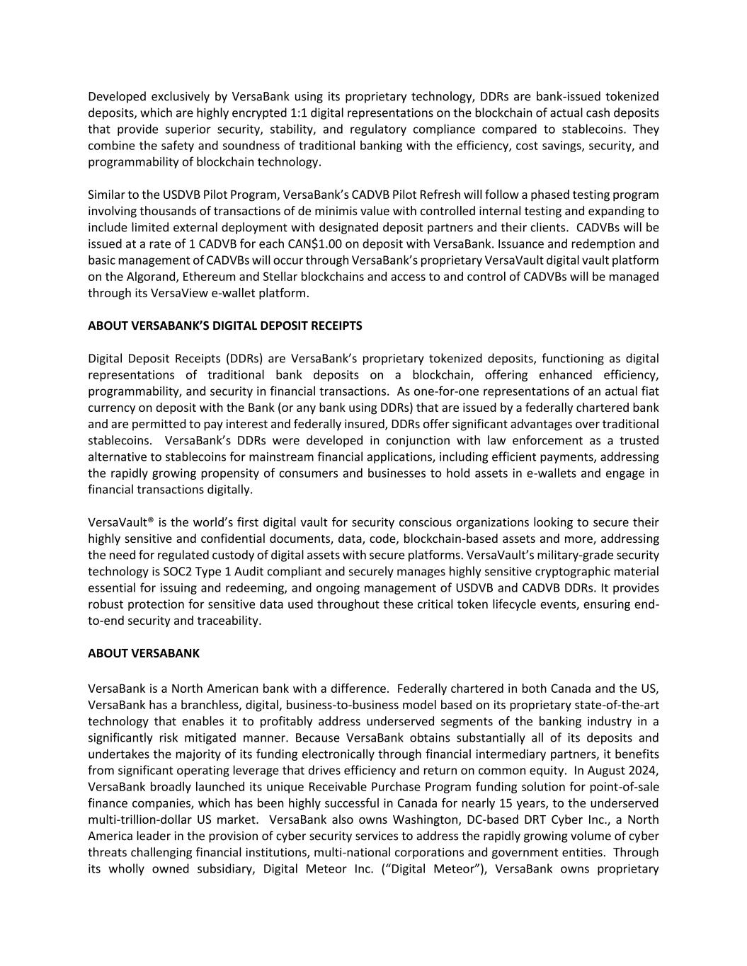 Developed exclusively by VersaBank using its proprietary technology, DDRs are bank-issued tokenized deposits, which are highly encrypted 1:1 digital representations on the blockchain of actual cash deposits that provide superior security, stability, and regulatory compliance compared to stablecoins. They combine the safety and soundness of traditional banking with the efficiency, cost savings, security, and programmability of blockchain technology. Similar to the USDVB Pilot Program, VersaBank’s CADVB Pilot Refresh will follow a phased testing program involving thousands of transactions of de minimis value with controlled internal testing and expanding to include limited external deployment with designated deposit partners and their clients. CADVBs will be issued at a rate of 1 CADVB for each CAN$1.00 on deposit with VersaBank. Issuance and redemption and basic management of CADVBs will occur through VersaBank’s proprietary VersaVault digital vault platform on the Algorand, Ethereum and Stellar blockchains and access to and control of CADVBs will be managed through its VersaView e-wallet platform. ABOUT VERSABANK’S DIGITAL DEPOSIT RECEIPTS Digital Deposit Receipts (DDRs) are VersaBank’s proprietary tokenized deposits, functioning as digital representations of traditional bank deposits on a blockchain, offering enhanced efficiency, programmability, and security in financial transactions. As one-for-one representations of an actual fiat currency on deposit with the Bank (or any bank using DDRs) that are issued by a federally chartered bank and are permitted to pay interest and federally insured, DDRs offer significant advantages over traditional stablecoins. VersaBank’s DDRs were developed in conjunction with law enforcement as a trusted alternative to stablecoins for mainstream financial applications, including efficient payments, addressing the rapidly growing propensity of consumers and businesses to hold assets in e-wallets and engage in financial transactions digitally. VersaVault® is the world’s first digital vault for security conscious organizations looking to secure their highly sensitive and confidential documents, data, code, blockchain-based assets and more, addressing the need for regulated custody of digital assets with secure platforms. VersaVault’s military-grade security technology is SOC2 Type 1 Audit compliant and securely manages highly sensitive cryptographic material essential for issuing and redeeming, and ongoing management of USDVB and CADVB DDRs. It provides robust protection for sensitive data used throughout these critical token lifecycle events, ensuring end- to-end security and traceability. ABOUT VERSABANK VersaBank is a North American bank with a difference. Federally chartered in both Canada and the US, VersaBank has a branchless, digital, business-to-business model based on its proprietary state-of-the-art technology that enables it to profitably address underserved segments of the banking industry in a significantly risk mitigated manner. Because VersaBank obtains substantially all of its deposits and undertakes the majority of its funding electronically through financial intermediary partners, it benefits from significant operating leverage that drives efficiency and return on common equity. In August 2024, VersaBank broadly launched its unique Receivable Purchase Program funding solution for point-of-sale finance companies, which has been highly successful in Canada for nearly 15 years, to the underserved multi-trillion-dollar US market. VersaBank also owns Washington, DC-based DRT Cyber Inc., a North America leader in the provision of cyber security services to address the rapidly growing volume of cyber threats challenging financial institutions, multi-national corporations and government entities. Through its wholly owned subsidiary, Digital Meteor Inc. (“Digital Meteor”), VersaBank owns proprietary