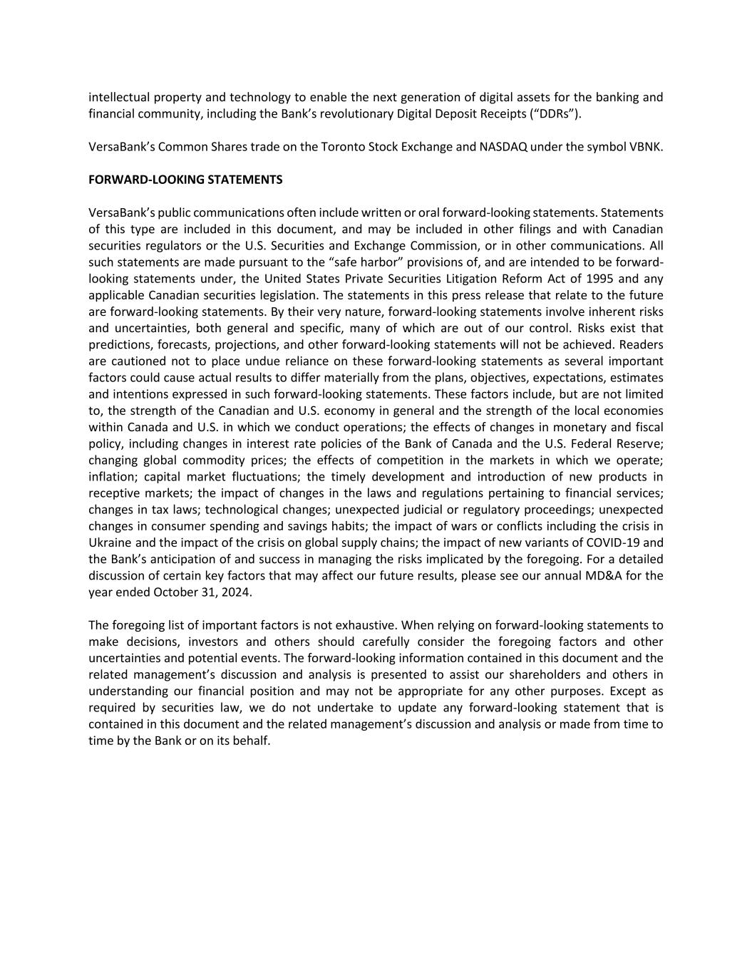 intellectual property and technology to enable the next generation of digital assets for the banking and financial community, including the Bank’s revolutionary Digital Deposit Receipts (“DDRs”). VersaBank’s Common Shares trade on the Toronto Stock Exchange and NASDAQ under the symbol VBNK. FORWARD-LOOKING STATEMENTS VersaBank’s public communications often include written or oral forward-looking statements. Statements of this type are included in this document, and may be included in other filings and with Canadian securities regulators or the U.S. Securities and Exchange Commission, or in other communications. All such statements are made pursuant to the “safe harbor” provisions of, and are intended to be forward- looking statements under, the United States Private Securities Litigation Reform Act of 1995 and any applicable Canadian securities legislation. The statements in this press release that relate to the future are forward-looking statements. By their very nature, forward-looking statements involve inherent risks and uncertainties, both general and specific, many of which are out of our control. Risks exist that predictions, forecasts, projections, and other forward-looking statements will not be achieved. Readers are cautioned not to place undue reliance on these forward-looking statements as several important factors could cause actual results to differ materially from the plans, objectives, expectations, estimates and intentions expressed in such forward-looking statements. These factors include, but are not limited to, the strength of the Canadian and U.S. economy in general and the strength of the local economies within Canada and U.S. in which we conduct operations; the effects of changes in monetary and fiscal policy, including changes in interest rate policies of the Bank of Canada and the U.S. Federal Reserve; changing global commodity prices; the effects of competition in the markets in which we operate; inflation; capital market fluctuations; the timely development and introduction of new products in receptive markets; the impact of changes in the laws and regulations pertaining to financial services; changes in tax laws; technological changes; unexpected judicial or regulatory proceedings; unexpected changes in consumer spending and savings habits; the impact of wars or conflicts including the crisis in Ukraine and the impact of the crisis on global supply chains; the impact of new variants of COVID-19 and the Bank’s anticipation of and success in managing the risks implicated by the foregoing. For a detailed discussion of certain key factors that may affect our future results, please see our annual MD&A for the year ended October 31, 2024. The foregoing list of important factors is not exhaustive. When relying on forward-looking statements to make decisions, investors and others should carefully consider the foregoing factors and other uncertainties and potential events. The forward-looking information contained in this document and the related management’s discussion and analysis is presented to assist our shareholders and others in understanding our financial position and may not be appropriate for any other purposes. Except as required by securities law, we do not undertake to update any forward-looking statement that is contained in this document and the related management’s discussion and analysis or made from time to time by the Bank or on its behalf.