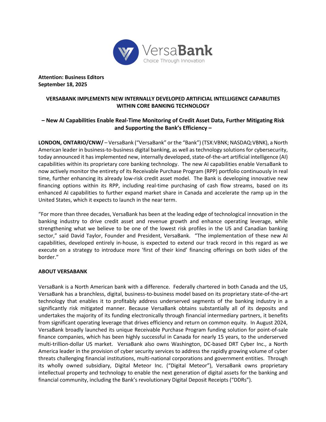 Attention: Business Editors September 18, 2025 VERSABANK IMPLEMENTS NEW INTERNALLY DEVELOPED ARTIFICIAL INTELLIGENCE CAPABLITIES WITHIN CORE BANKING TECHNOLOGY – New AI Capabilities Enable Real-Time Monitoring of Credit Asset Data, Further Mitigating Risk and Supporting the Bank’s Efficiency – LONDON, ONTARIO/CNW/ – VersaBank (“VersaBank” or the “Bank”) (TSX:VBNK; NASDAQ:VBNK), a North American leader in business-to-business digital banking, as well as technology solutions for cybersecurity, today announced it has implemented new, internally developed, state-of-the-art artificial intelligence (AI) capabilities within its proprietary core banking technology. The new AI capabilities enable VersaBank to now actively monitor the entirety of its Receivable Purchase Program (RPP) portfolio continuously in real time, further enhancing its already low-risk credit asset model. The Bank is developing innovative new financing options within its RPP, including real-time purchasing of cash flow streams, based on its enhanced AI capabilities to further expand market share in Canada and accelerate the ramp up in the United States, which it expects to launch in the near term. “For more than three decades, VersaBank has been at the leading edge of technological innovation in the banking industry to drive credit asset and revenue growth and enhance operating leverage, while strengthening what we believe to be one of the lowest risk profiles in the US and Canadian banking sector,” said David Taylor, Founder and President, VersaBank. “The implementation of these new AI capabilities, developed entirely in-house, is expected to extend our track record in this regard as we execute on a strategy to introduce more ‘first of their kind’ financing offerings on both sides of the border.” ABOUT VERSABANK VersaBank is a North American bank with a difference. Federally chartered in both Canada and the US, VersaBank has a branchless, digital, business-to-business model based on its proprietary state-of-the-art technology that enables it to profitably address underserved segments of the banking industry in a significantly risk mitigated manner. Because VersaBank obtains substantially all of its deposits and undertakes the majority of its funding electronically through financial intermediary partners, it benefits from significant operating leverage that drives efficiency and return on common equity. In August 2024, VersaBank broadly launched its unique Receivable Purchase Program funding solution for point-of-sale finance companies, which has been highly successful in Canada for nearly 15 years, to the underserved multi-trillion-dollar US market. VersaBank also owns Washington, DC-based DRT Cyber Inc., a North America leader in the provision of cyber security services to address the rapidly growing volume of cyber threats challenging financial institutions, multi-national corporations and government entities. Through its wholly owned subsidiary, Digital Meteor Inc. (“Digital Meteor”), VersaBank owns proprietary intellectual property and technology to enable the next generation of digital assets for the banking and financial community, including the Bank’s revolutionary Digital Deposit Receipts (“DDRs”).