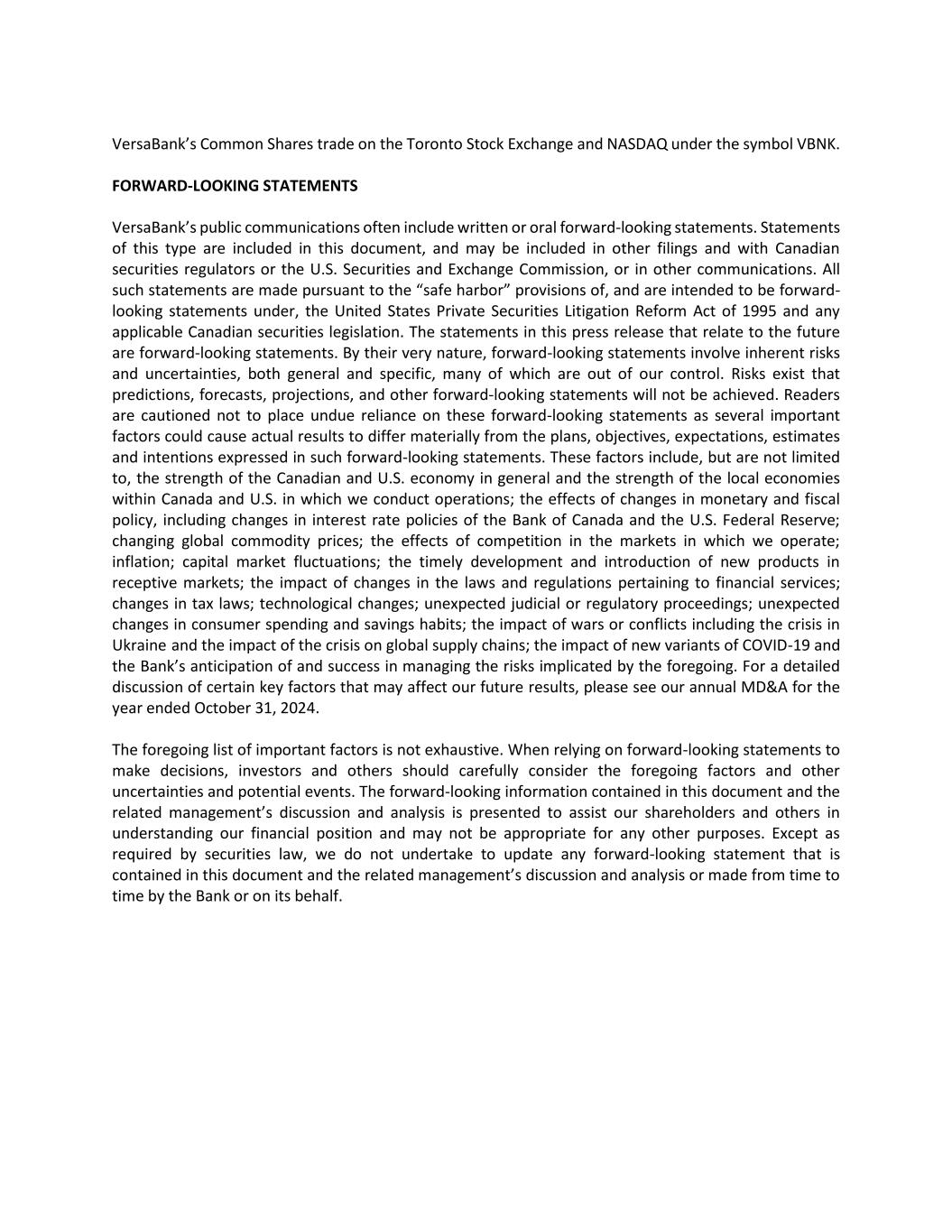 VersaBank’s Common Shares trade on the Toronto Stock Exchange and NASDAQ under the symbol VBNK. FORWARD-LOOKING STATEMENTS VersaBank’s public communications often include written or oral forward-looking statements. Statements of this type are included in this document, and may be included in other filings and with Canadian securities regulators or the U.S. Securities and Exchange Commission, or in other communications. All such statements are made pursuant to the “safe harbor” provisions of, and are intended to be forward- looking statements under, the United States Private Securities Litigation Reform Act of 1995 and any applicable Canadian securities legislation. The statements in this press release that relate to the future are forward-looking statements. By their very nature, forward-looking statements involve inherent risks and uncertainties, both general and specific, many of which are out of our control. Risks exist that predictions, forecasts, projections, and other forward-looking statements will not be achieved. Readers are cautioned not to place undue reliance on these forward-looking statements as several important factors could cause actual results to differ materially from the plans, objectives, expectations, estimates and intentions expressed in such forward-looking statements. These factors include, but are not limited to, the strength of the Canadian and U.S. economy in general and the strength of the local economies within Canada and U.S. in which we conduct operations; the effects of changes in monetary and fiscal policy, including changes in interest rate policies of the Bank of Canada and the U.S. Federal Reserve; changing global commodity prices; the effects of competition in the markets in which we operate; inflation; capital market fluctuations; the timely development and introduction of new products in receptive markets; the impact of changes in the laws and regulations pertaining to financial services; changes in tax laws; technological changes; unexpected judicial or regulatory proceedings; unexpected changes in consumer spending and savings habits; the impact of wars or conflicts including the crisis in Ukraine and the impact of the crisis on global supply chains; the impact of new variants of COVID-19 and the Bank’s anticipation of and success in managing the risks implicated by the foregoing. For a detailed discussion of certain key factors that may affect our future results, please see our annual MD&A for the year ended October 31, 2024. The foregoing list of important factors is not exhaustive. When relying on forward-looking statements to make decisions, investors and others should carefully consider the foregoing factors and other uncertainties and potential events. The forward-looking information contained in this document and the related management’s discussion and analysis is presented to assist our shareholders and others in understanding our financial position and may not be appropriate for any other purposes. Except as required by securities law, we do not undertake to update any forward-looking statement that is contained in this document and the related management’s discussion and analysis or made from time to time by the Bank or on its behalf.