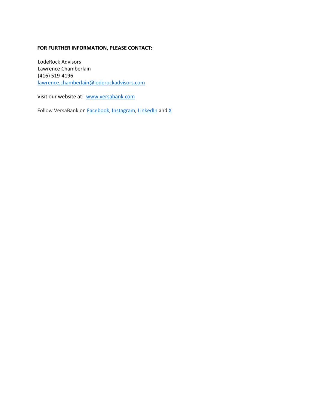 FOR FURTHER INFORMATION, PLEASE CONTACT: LodeRock Advisors Lawrence Chamberlain (416) 519-4196 lawrence.chamberlain@loderockadvisors.com Visit our website at: www.versabank.com Follow VersaBank on Facebook, Instagram, LinkedIn and X