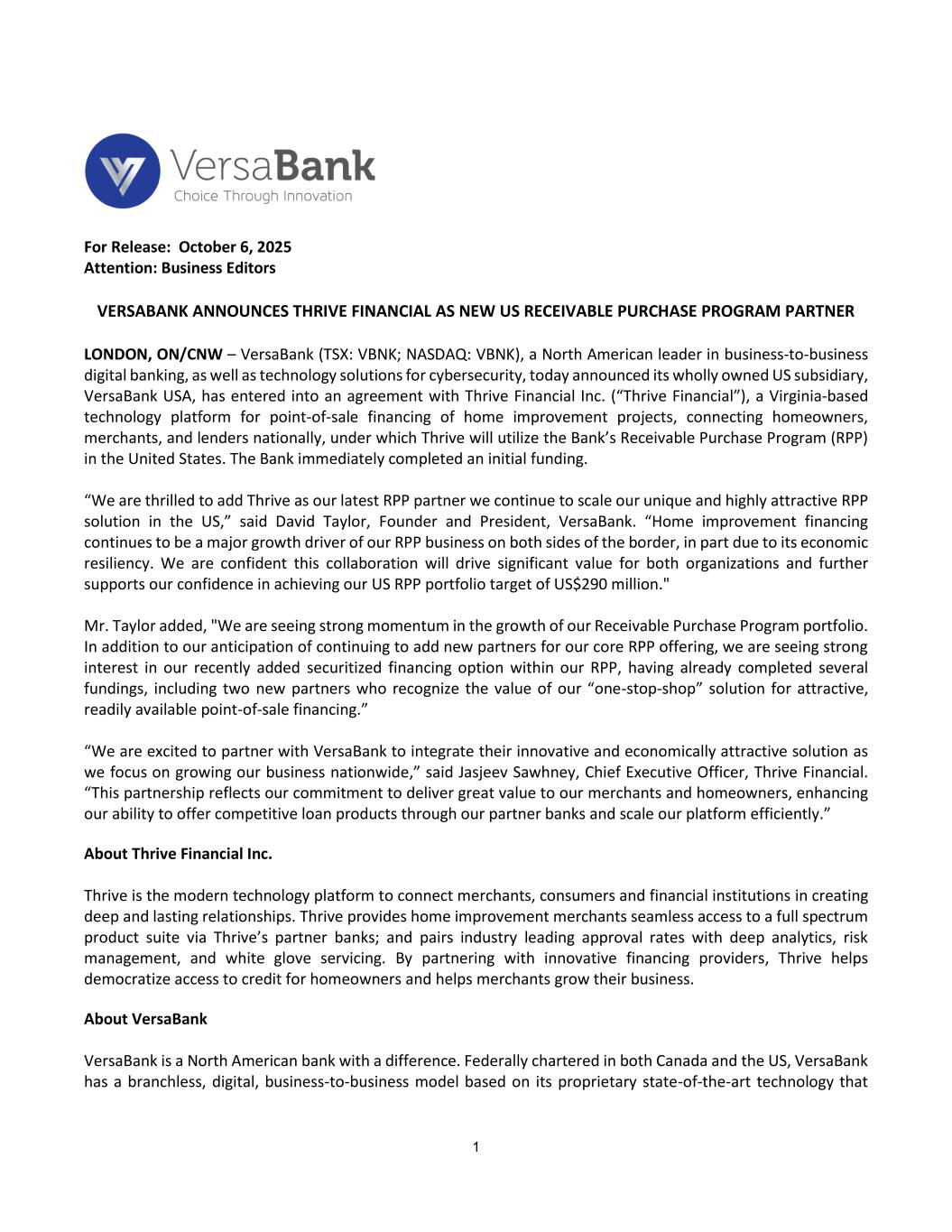 1 For Release: October 6, 2025 Attention: Business Editors VERSABANK ANNOUNCES THRIVE FINANCIAL AS NEW US RECEIVABLE PURCHASE PROGRAM PARTNER LONDON, ON/CNW – VersaBank (TSX: VBNK; NASDAQ: VBNK), a North American leader in business-to-business digital banking, as well as technology solutions for cybersecurity, today announced its wholly owned US subsidiary, VersaBank USA, has entered into an agreement with Thrive Financial Inc. (“Thrive Financial”), a Virginia-based technology platform for point-of-sale financing of home improvement projects, connecting homeowners, merchants, and lenders nationally, under which Thrive will utilize the Bank’s Receivable Purchase Program (RPP) in the United States. The Bank immediately completed an initial funding. “We are thrilled to add Thrive as our latest RPP partner we continue to scale our unique and highly attractive RPP solution in the US,” said David Taylor, Founder and President, VersaBank. “Home improvement financing continues to be a major growth driver of our RPP business on both sides of the border, in part due to its economic resiliency. We are confident this collaboration will drive significant value for both organizations and further supports our confidence in achieving our US RPP portfolio target of US$290 million." Mr. Taylor added, "We are seeing strong momentum in the growth of our Receivable Purchase Program portfolio. In addition to our anticipation of continuing to add new partners for our core RPP offering, we are seeing strong interest in our recently added securitized financing option within our RPP, having already completed several fundings, including two new partners who recognize the value of our “one-stop-shop” solution for attractive, readily available point-of-sale financing.” “We are excited to partner with VersaBank to integrate their innovative and economically attractive solution as we focus on growing our business nationwide,” said Jasjeev Sawhney, Chief Executive Officer, Thrive Financial. “This partnership reflects our commitment to deliver great value to our merchants and homeowners, enhancing our ability to offer competitive loan products through our partner banks and scale our platform efficiently.” About Thrive Financial Inc. Thrive is the modern technology platform to connect merchants, consumers and financial institutions in creating deep and lasting relationships. Thrive provides home improvement merchants seamless access to a full spectrum product suite via Thrive’s partner banks; and pairs industry leading approval rates with deep analytics, risk management, and white glove servicing. By partnering with innovative financing providers, Thrive helps democratize access to credit for homeowners and helps merchants grow their business. About VersaBank VersaBank is a North American bank with a difference. Federally chartered in both Canada and the US, VersaBank has a branchless, digital, business-to-business model based on its proprietary state-of-the-art technology that
