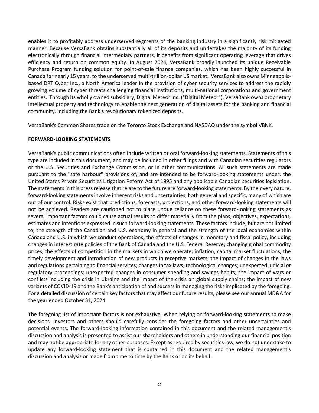 2 enables it to profitably address underserved segments of the banking industry in a significantly risk mitigated manner. Because VersaBank obtains substantially all of its deposits and undertakes the majority of its funding electronically through financial intermediary partners, it benefits from significant operating leverage that drives efficiency and return on common equity. In August 2024, VersaBank broadly launched its unique Receivable Purchase Program funding solution for point-of-sale finance companies, which has been highly successful in Canada for nearly 15 years, to the underserved multi-trillion-dollar US market. VersaBank also owns Minneapolis- based DRT Cyber Inc., a North America leader in the provision of cyber security services to address the rapidly growing volume of cyber threats challenging financial institutions, multi-national corporations and government entities. Through its wholly owned subsidiary, Digital Meteor Inc. ("Digital Meteor"), VersaBank owns proprietary intellectual property and technology to enable the next generation of digital assets for the banking and financial community, including the Bank's revolutionary tokenized deposits. VersaBank's Common Shares trade on the Toronto Stock Exchange and NASDAQ under the symbol VBNK. FORWARD-LOOKING STATEMENTS VersaBank's public communications often include written or oral forward-looking statements. Statements of this type are included in this document, and may be included in other filings and with Canadian securities regulators or the U.S. Securities and Exchange Commission, or in other communications. All such statements are made pursuant to the "safe harbour" provisions of, and are intended to be forward-looking statements under, the United States Private Securities Litigation Reform Act of 1995 and any applicable Canadian securities legislation. The statements in this press release that relate to the future are forward-looking statements. By their very nature, forward-looking statements involve inherent risks and uncertainties, both general and specific, many of which are out of our control. Risks exist that predictions, forecasts, projections, and other forward-looking statements will not be achieved. Readers are cautioned not to place undue reliance on these forward-looking statements as several important factors could cause actual results to differ materially from the plans, objectives, expectations, estimates and intentions expressed in such forward-looking statements. These factors include, but are not limited to, the strength of the Canadian and U.S. economy in general and the strength of the local economies within Canada and U.S. in which we conduct operations; the effects of changes in monetary and fiscal policy, including changes in interest rate policies of the Bank of Canada and the U.S. Federal Reserve; changing global commodity prices; the effects of competition in the markets in which we operate; inflation; capital market fluctuations; the timely development and introduction of new products in receptive markets; the impact of changes in the laws and regulations pertaining to financial services; changes in tax laws; technological changes; unexpected judicial or regulatory proceedings; unexpected changes in consumer spending and savings habits; the impact of wars or conflicts including the crisis in Ukraine and the impact of the crisis on global supply chains; the impact of new variants of COVID-19 and the Bank's anticipation of and success in managing the risks implicated by the foregoing. For a detailed discussion of certain key factors that may affect our future results, please see our annual MD&A for the year ended October 31, 2024. The foregoing list of important factors is not exhaustive. When relying on forward-looking statements to make decisions, investors and others should carefully consider the foregoing factors and other uncertainties and potential events. The forward-looking information contained in this document and the related management's discussion and analysis is presented to assist our shareholders and others in understanding our financial position and may not be appropriate for any other purposes. Except as required by securities law, we do not undertake to update any forward-looking statement that is contained in this document and the related management's discussion and analysis or made from time to time by the Bank or on its behalf.