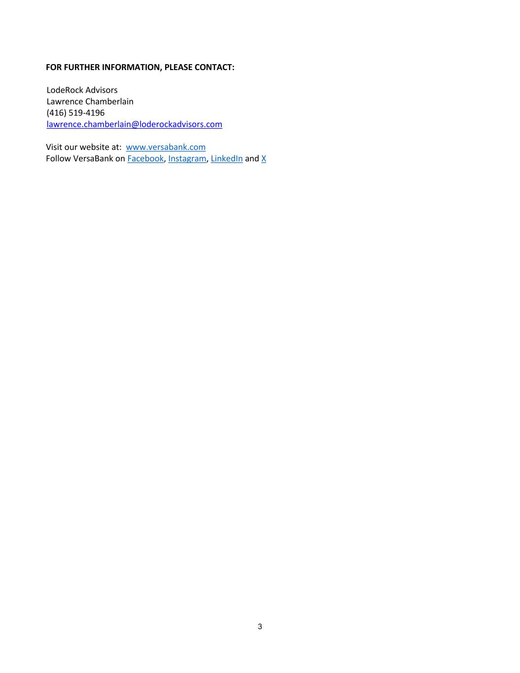 3 FOR FURTHER INFORMATION, PLEASE CONTACT: LodeRock Advisors Lawrence Chamberlain (416) 519-4196 lawrence.chamberlain@loderockadvisors.com Visit our website at: www.versabank.com Follow VersaBank on Facebook, Instagram, LinkedIn and X