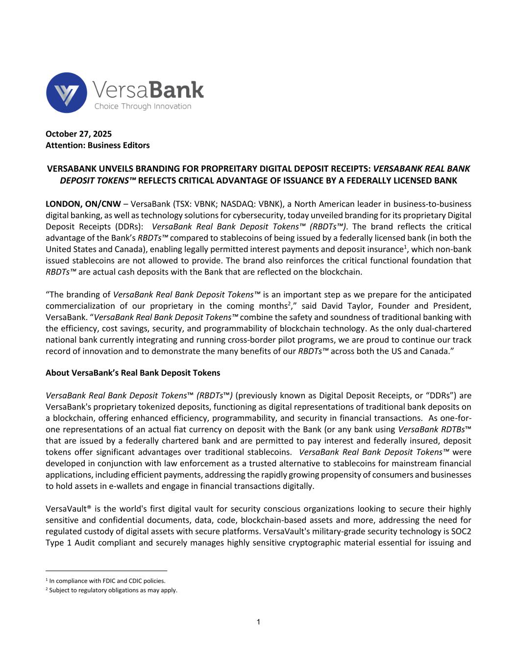 1 October 27, 2025 Attention: Business Editors VERSABANK UNVEILS BRANDING FOR PROPREITARY DIGITAL DEPOSIT RECEIPTS: VERSABANK REAL BANK DEPOSIT TOKENS™ REFLECTS CRITICAL ADVANTAGE OF ISSUANCE BY A FEDERALLY LICENSED BANK LONDON, ON/CNW – VersaBank (TSX: VBNK; NASDAQ: VBNK), a North American leader in business-to-business digital banking, as well as technology solutions for cybersecurity, today unveiled branding for its proprietary Digital Deposit Receipts (DDRs): VersaBank Real Bank Deposit Tokens™ (RBDTs™). The brand reflects the critical advantage of the Bank’s RBDTs™ compared to stablecoins of being issued by a federally licensed bank (in both the United States and Canada), enabling legally permitted interest payments and deposit insurance1, which non-bank issued stablecoins are not allowed to provide. The brand also reinforces the critical functional foundation that RBDTs™ are actual cash deposits with the Bank that are reflected on the blockchain. “The branding of VersaBank Real Bank Deposit Tokens™ is an important step as we prepare for the anticipated commercialization of our proprietary in the coming months2,” said David Taylor, Founder and President, VersaBank. “VersaBank Real Bank Deposit Tokens™ combine the safety and soundness of traditional banking with the efficiency, cost savings, security, and programmability of blockchain technology. As the only dual-chartered national bank currently integrating and running cross-border pilot programs, we are proud to continue our track record of innovation and to demonstrate the many benefits of our RBDTs™ across both the US and Canada.” About VersaBank’s Real Bank Deposit Tokens VersaBank Real Bank Deposit Tokens™ (RBDTs™) (previously known as Digital Deposit Receipts, or “DDRs”) are VersaBank's proprietary tokenized deposits, functioning as digital representations of traditional bank deposits on a blockchain, offering enhanced efficiency, programmability, and security in financial transactions. As one-for- one representations of an actual fiat currency on deposit with the Bank (or any bank using VersaBank RDTBs™ that are issued by a federally chartered bank and are permitted to pay interest and federally insured, deposit tokens offer significant advantages over traditional stablecoins. VersaBank Real Bank Deposit Tokens™ were developed in conjunction with law enforcement as a trusted alternative to stablecoins for mainstream financial applications, including efficient payments, addressing the rapidly growing propensity of consumers and businesses to hold assets in e-wallets and engage in financial transactions digitally. VersaVault® is the world's first digital vault for security conscious organizations looking to secure their highly sensitive and confidential documents, data, code, blockchain-based assets and more, addressing the need for regulated custody of digital assets with secure platforms. VersaVault's military-grade security technology is SOC2 Type 1 Audit compliant and securely manages highly sensitive cryptographic material essential for issuing and 1 In compliance with FDIC and CDIC policies. 2 Subject to regulatory obligations as may apply.