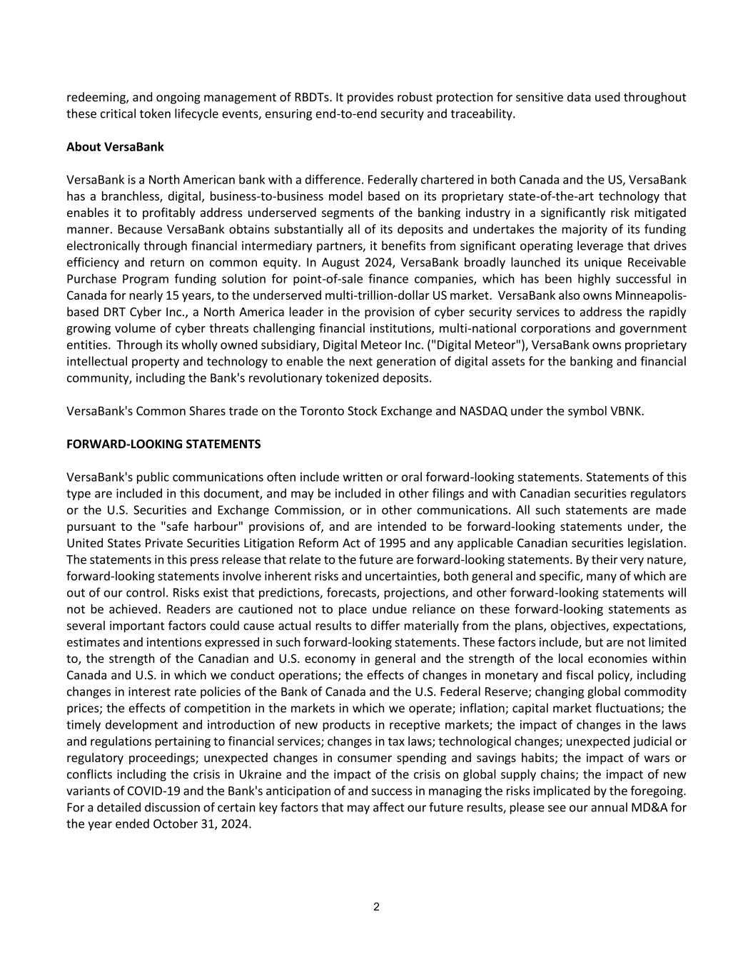2 redeeming, and ongoing management of RBDTs. It provides robust protection for sensitive data used throughout these critical token lifecycle events, ensuring end-to-end security and traceability. About VersaBank VersaBank is a North American bank with a difference. Federally chartered in both Canada and the US, VersaBank has a branchless, digital, business-to-business model based on its proprietary state-of-the-art technology that enables it to profitably address underserved segments of the banking industry in a significantly risk mitigated manner. Because VersaBank obtains substantially all of its deposits and undertakes the majority of its funding electronically through financial intermediary partners, it benefits from significant operating leverage that drives efficiency and return on common equity. In August 2024, VersaBank broadly launched its unique Receivable Purchase Program funding solution for point-of-sale finance companies, which has been highly successful in Canada for nearly 15 years, to the underserved multi-trillion-dollar US market. VersaBank also owns Minneapolis- based DRT Cyber Inc., a North America leader in the provision of cyber security services to address the rapidly growing volume of cyber threats challenging financial institutions, multi-national corporations and government entities. Through its wholly owned subsidiary, Digital Meteor Inc. ("Digital Meteor"), VersaBank owns proprietary intellectual property and technology to enable the next generation of digital assets for the banking and financial community, including the Bank's revolutionary tokenized deposits. VersaBank's Common Shares trade on the Toronto Stock Exchange and NASDAQ under the symbol VBNK. FORWARD-LOOKING STATEMENTS VersaBank's public communications often include written or oral forward-looking statements. Statements of this type are included in this document, and may be included in other filings and with Canadian securities regulators or the U.S. Securities and Exchange Commission, or in other communications. All such statements are made pursuant to the "safe harbour" provisions of, and are intended to be forward-looking statements under, the United States Private Securities Litigation Reform Act of 1995 and any applicable Canadian securities legislation. The statements in this press release that relate to the future are forward-looking statements. By their very nature, forward-looking statements involve inherent risks and uncertainties, both general and specific, many of which are out of our control. Risks exist that predictions, forecasts, projections, and other forward-looking statements will not be achieved. Readers are cautioned not to place undue reliance on these forward-looking statements as several important factors could cause actual results to differ materially from the plans, objectives, expectations, estimates and intentions expressed in such forward-looking statements. These factors include, but are not limited to, the strength of the Canadian and U.S. economy in general and the strength of the local economies within Canada and U.S. in which we conduct operations; the effects of changes in monetary and fiscal policy, including changes in interest rate policies of the Bank of Canada and the U.S. Federal Reserve; changing global commodity prices; the effects of competition in the markets in which we operate; inflation; capital market fluctuations; the timely development and introduction of new products in receptive markets; the impact of changes in the laws and regulations pertaining to financial services; changes in tax laws; technological changes; unexpected judicial or regulatory proceedings; unexpected changes in consumer spending and savings habits; the impact of wars or conflicts including the crisis in Ukraine and the impact of the crisis on global supply chains; the impact of new variants of COVID-19 and the Bank's anticipation of and success in managing the risks implicated by the foregoing. For a detailed discussion of certain key factors that may affect our future results, please see our annual MD&A for the year ended October 31, 2024.