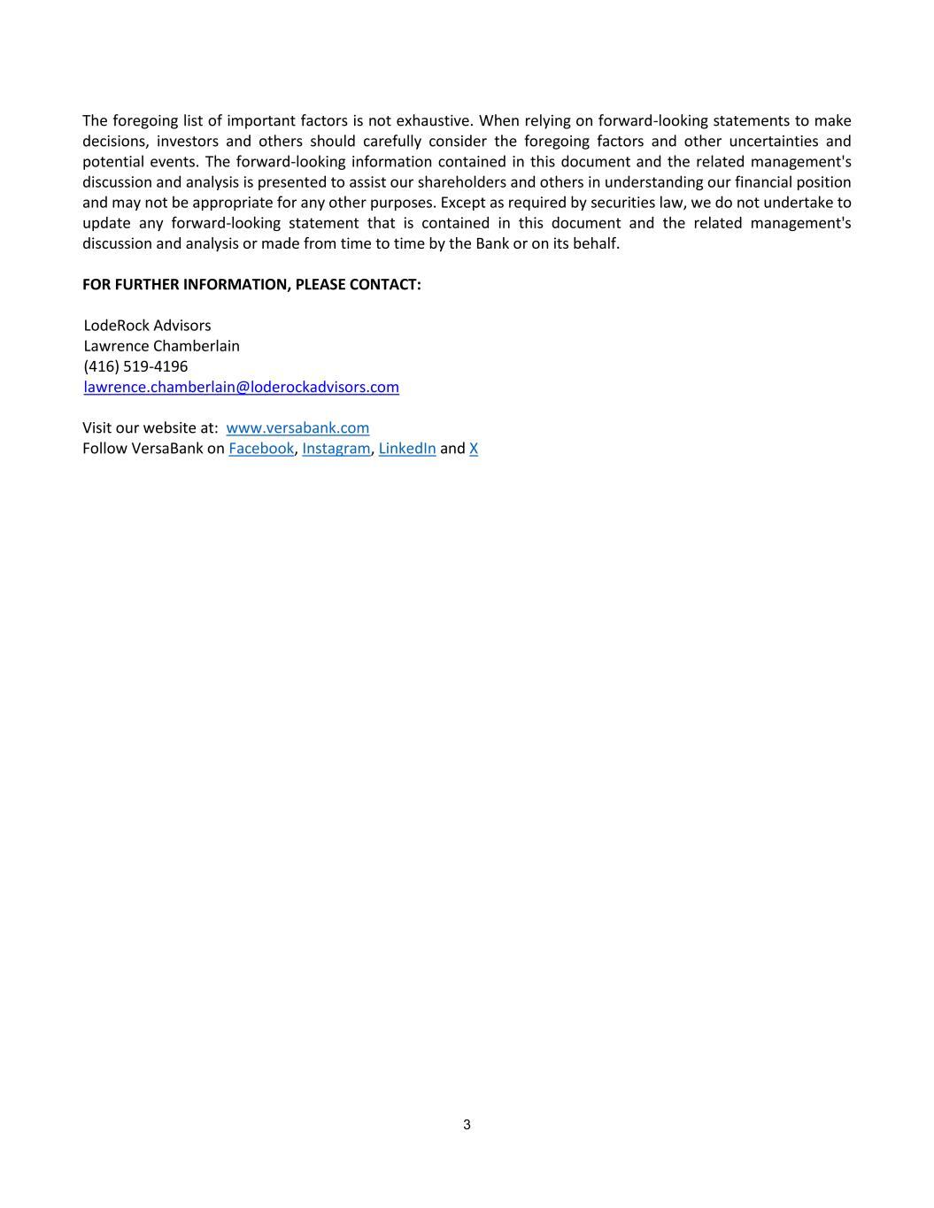 3 The foregoing list of important factors is not exhaustive. When relying on forward-looking statements to make decisions, investors and others should carefully consider the foregoing factors and other uncertainties and potential events. The forward-looking information contained in this document and the related management's discussion and analysis is presented to assist our shareholders and others in understanding our financial position and may not be appropriate for any other purposes. Except as required by securities law, we do not undertake to update any forward-looking statement that is contained in this document and the related management's discussion and analysis or made from time to time by the Bank or on its behalf. FOR FURTHER INFORMATION, PLEASE CONTACT: LodeRock Advisors Lawrence Chamberlain (416) 519-4196 lawrence.chamberlain@loderockadvisors.com Visit our website at: www.versabank.com Follow VersaBank on Facebook, Instagram, LinkedIn and X