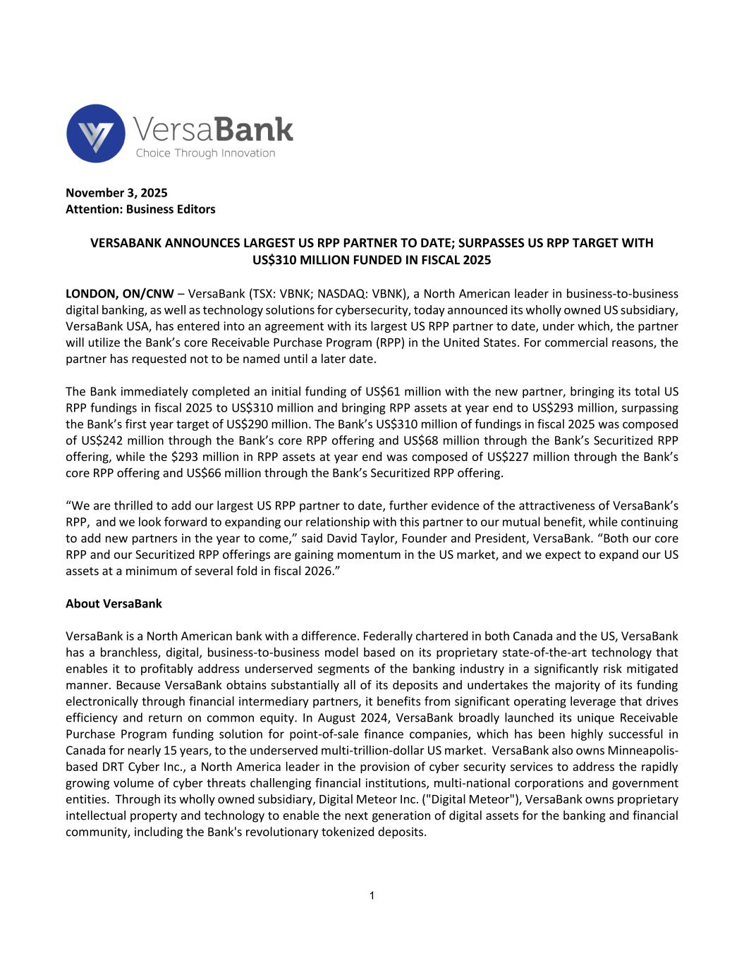 1 November 3, 2025 Attention: Business Editors VERSABANK ANNOUNCES LARGEST US RPP PARTNER TO DATE; SURPASSES US RPP TARGET WITH US$310 MILLION FUNDED IN FISCAL 2025 LONDON, ON/CNW – VersaBank (TSX: VBNK; NASDAQ: VBNK), a North American leader in business-to-business digital banking, as well as technology solutions for cybersecurity, today announced its wholly owned US subsidiary, VersaBank USA, has entered into an agreement with its largest US RPP partner to date, under which, the partner will utilize the Bank’s core Receivable Purchase Program (RPP) in the United States. For commercial reasons, the partner has requested not to be named until a later date. The Bank immediately completed an initial funding of US$61 million with the new partner, bringing its total US RPP fundings in fiscal 2025 to US$310 million and bringing RPP assets at year end to US$293 million, surpassing the Bank’s first year target of US$290 million. The Bank’s US$310 million of fundings in fiscal 2025 was composed of US$242 million through the Bank’s core RPP offering and US$68 million through the Bank’s Securitized RPP offering, while the $293 million in RPP assets at year end was composed of US$227 million through the Bank’s core RPP offering and US$66 million through the Bank’s Securitized RPP offering. “We are thrilled to add our largest US RPP partner to date, further evidence of the attractiveness of VersaBank’s RPP, and we look forward to expanding our relationship with this partner to our mutual benefit, while continuing to add new partners in the year to come,” said David Taylor, Founder and President, VersaBank. “Both our core RPP and our Securitized RPP offerings are gaining momentum in the US market, and we expect to expand our US assets at a minimum of several fold in fiscal 2026.” About VersaBank VersaBank is a North American bank with a difference. Federally chartered in both Canada and the US, VersaBank has a branchless, digital, business-to-business model based on its proprietary state-of-the-art technology that enables it to profitably address underserved segments of the banking industry in a significantly risk mitigated manner. Because VersaBank obtains substantially all of its deposits and undertakes the majority of its funding electronically through financial intermediary partners, it benefits from significant operating leverage that drives efficiency and return on common equity. In August 2024, VersaBank broadly launched its unique Receivable Purchase Program funding solution for point-of-sale finance companies, which has been highly successful in Canada for nearly 15 years, to the underserved multi-trillion-dollar US market. VersaBank also owns Minneapolis- based DRT Cyber Inc., a North America leader in the provision of cyber security services to address the rapidly growing volume of cyber threats challenging financial institutions, multi-national corporations and government entities. Through its wholly owned subsidiary, Digital Meteor Inc. ("Digital Meteor"), VersaBank owns proprietary intellectual property and technology to enable the next generation of digital assets for the banking and financial community, including the Bank's revolutionary tokenized deposits.