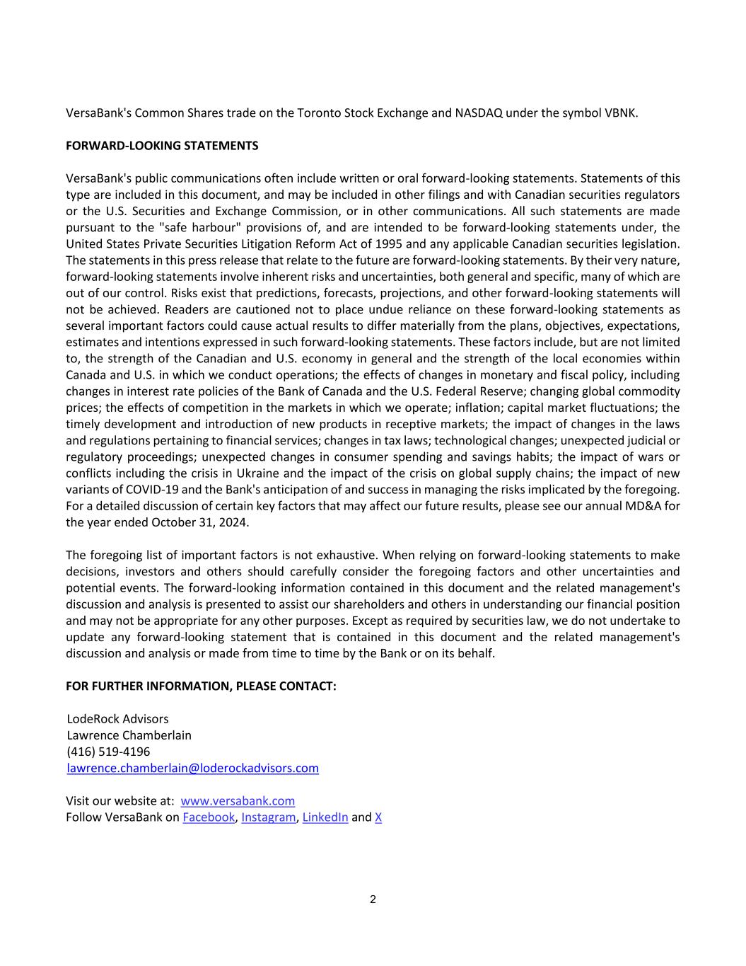 2 VersaBank's Common Shares trade on the Toronto Stock Exchange and NASDAQ under the symbol VBNK. FORWARD-LOOKING STATEMENTS VersaBank's public communications often include written or oral forward-looking statements. Statements of this type are included in this document, and may be included in other filings and with Canadian securities regulators or the U.S. Securities and Exchange Commission, or in other communications. All such statements are made pursuant to the "safe harbour" provisions of, and are intended to be forward-looking statements under, the United States Private Securities Litigation Reform Act of 1995 and any applicable Canadian securities legislation. The statements in this press release that relate to the future are forward-looking statements. By their very nature, forward-looking statements involve inherent risks and uncertainties, both general and specific, many of which are out of our control. Risks exist that predictions, forecasts, projections, and other forward-looking statements will not be achieved. Readers are cautioned not to place undue reliance on these forward-looking statements as several important factors could cause actual results to differ materially from the plans, objectives, expectations, estimates and intentions expressed in such forward-looking statements. These factors include, but are not limited to, the strength of the Canadian and U.S. economy in general and the strength of the local economies within Canada and U.S. in which we conduct operations; the effects of changes in monetary and fiscal policy, including changes in interest rate policies of the Bank of Canada and the U.S. Federal Reserve; changing global commodity prices; the effects of competition in the markets in which we operate; inflation; capital market fluctuations; the timely development and introduction of new products in receptive markets; the impact of changes in the laws and regulations pertaining to financial services; changes in tax laws; technological changes; unexpected judicial or regulatory proceedings; unexpected changes in consumer spending and savings habits; the impact of wars or conflicts including the crisis in Ukraine and the impact of the crisis on global supply chains; the impact of new variants of COVID-19 and the Bank's anticipation of and success in managing the risks implicated by the foregoing. For a detailed discussion of certain key factors that may affect our future results, please see our annual MD&A for the year ended October 31, 2024. The foregoing list of important factors is not exhaustive. When relying on forward-looking statements to make decisions, investors and others should carefully consider the foregoing factors and other uncertainties and potential events. The forward-looking information contained in this document and the related management's discussion and analysis is presented to assist our shareholders and others in understanding our financial position and may not be appropriate for any other purposes. Except as required by securities law, we do not undertake to update any forward-looking statement that is contained in this document and the related management's discussion and analysis or made from time to time by the Bank or on its behalf. FOR FURTHER INFORMATION, PLEASE CONTACT: LodeRock Advisors Lawrence Chamberlain (416) 519-4196 lawrence.chamberlain@loderockadvisors.com Visit our website at: www.versabank.com Follow VersaBank on Facebook, Instagram, LinkedIn and X