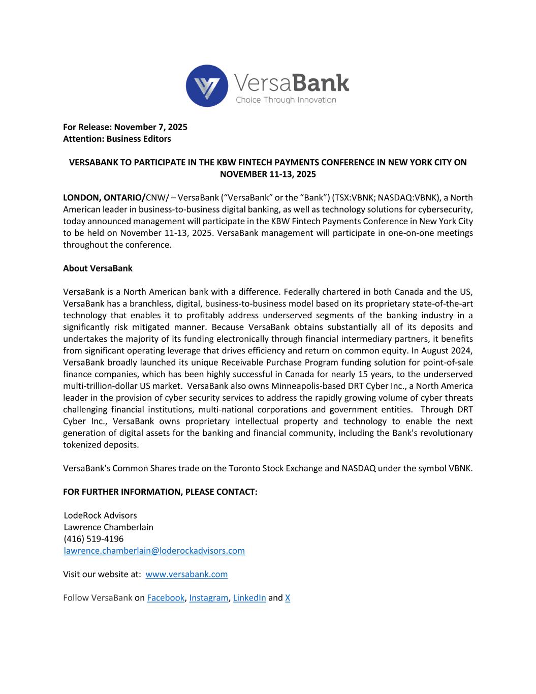 For Release: November 7, 2025 Attention: Business Editors VERSABANK TO PARTICIPATE IN THE KBW FINTECH PAYMENTS CONFERENCE IN NEW YORK CITY ON NOVEMBER 11-13, 2025 LONDON, ONTARIO/CNW/ – VersaBank (“VersaBank” or the “Bank”) (TSX:VBNK; NASDAQ:VBNK), a North American leader in business-to-business digital banking, as well as technology solutions for cybersecurity, today announced management will participate in the KBW Fintech Payments Conference in New York City to be held on November 11-13, 2025. VersaBank management will participate in one-on-one meetings throughout the conference. About VersaBank VersaBank is a North American bank with a difference. Federally chartered in both Canada and the US, VersaBank has a branchless, digital, business-to-business model based on its proprietary state-of-the-art technology that enables it to profitably address underserved segments of the banking industry in a significantly risk mitigated manner. Because VersaBank obtains substantially all of its deposits and undertakes the majority of its funding electronically through financial intermediary partners, it benefits from significant operating leverage that drives efficiency and return on common equity. In August 2024, VersaBank broadly launched its unique Receivable Purchase Program funding solution for point-of-sale finance companies, which has been highly successful in Canada for nearly 15 years, to the underserved multi-trillion-dollar US market. VersaBank also owns Minneapolis-based DRT Cyber Inc., a North America leader in the provision of cyber security services to address the rapidly growing volume of cyber threats challenging financial institutions, multi-national corporations and government entities. Through DRT Cyber Inc., VersaBank owns proprietary intellectual property and technology to enable the next generation of digital assets for the banking and financial community, including the Bank's revolutionary tokenized deposits. VersaBank's Common Shares trade on the Toronto Stock Exchange and NASDAQ under the symbol VBNK. FOR FURTHER INFORMATION, PLEASE CONTACT: LodeRock Advisors Lawrence Chamberlain (416) 519-4196 lawrence.chamberlain@loderockadvisors.com Visit our website at: www.versabank.com Follow VersaBank on Facebook, Instagram, LinkedIn and X
