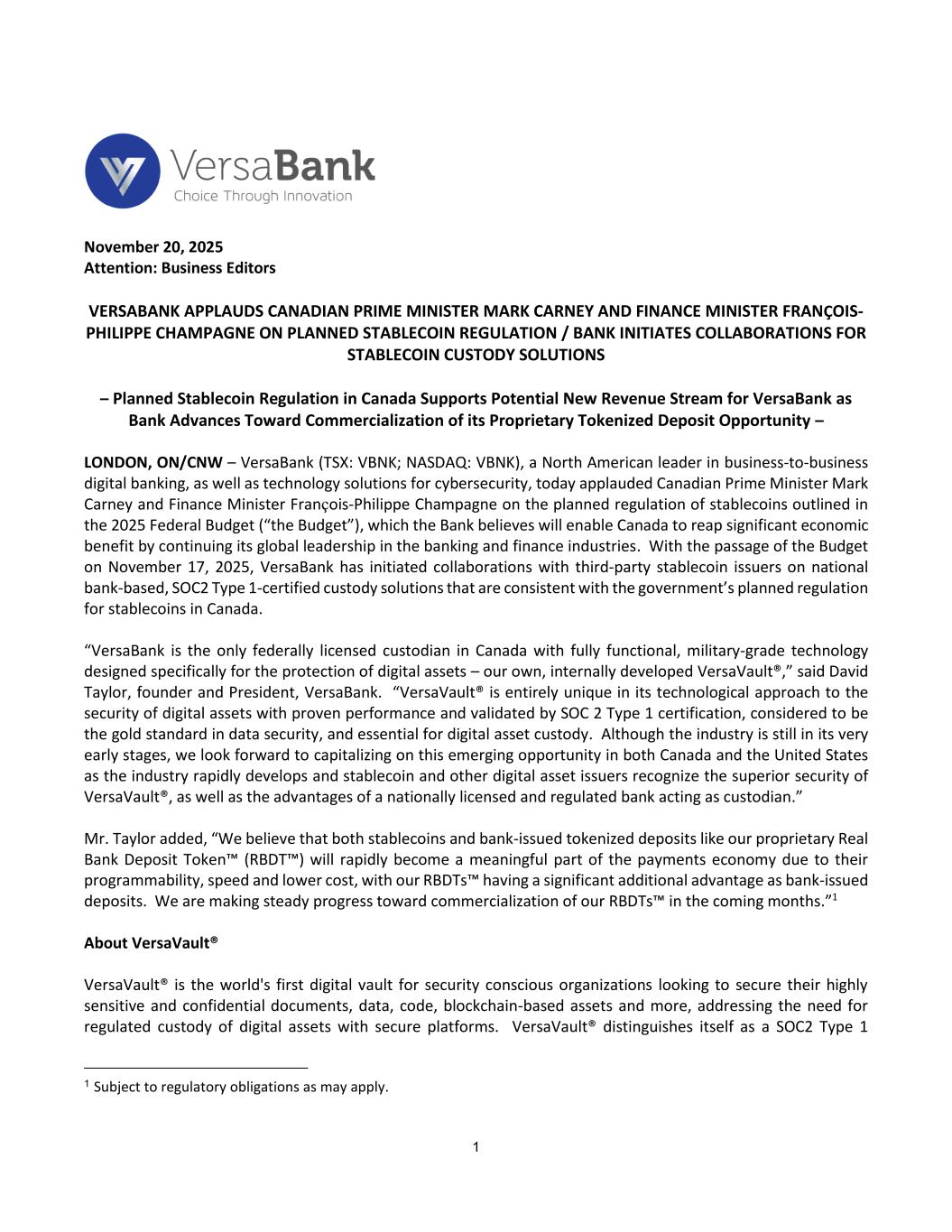 1 November 20, 2025 Attention: Business Editors VERSABANK APPLAUDS CANADIAN PRIME MINISTER MARK CARNEY AND FINANCE MINISTER FRANÇOIS- PHILIPPE CHAMPAGNE ON PLANNED STABLECOIN REGULATION / BANK INITIATES COLLABORATIONS FOR STABLECOIN CUSTODY SOLUTIONS – Planned Stablecoin Regulation in Canada Supports Potential New Revenue Stream for VersaBank as Bank Advances Toward Commercialization of its Proprietary Tokenized Deposit Opportunity – LONDON, ON/CNW – VersaBank (TSX: VBNK; NASDAQ: VBNK), a North American leader in business-to-business digital banking, as well as technology solutions for cybersecurity, today applauded Canadian Prime Minister Mark Carney and Finance Minister François-Philippe Champagne on the planned regulation of stablecoins outlined in the 2025 Federal Budget (“the Budget”), which the Bank believes will enable Canada to reap significant economic benefit by continuing its global leadership in the banking and finance industries. With the passage of the Budget on November 17, 2025, VersaBank has initiated collaborations with third-party stablecoin issuers on national bank-based, SOC2 Type 1-certified custody solutions that are consistent with the government’s planned regulation for stablecoins in Canada. “VersaBank is the only federally licensed custodian in Canada with fully functional, military-grade technology designed specifically for the protection of digital assets – our own, internally developed VersaVault®,” said David Taylor, founder and President, VersaBank. “VersaVault® is entirely unique in its technological approach to the security of digital assets with proven performance and validated by SOC 2 Type 1 certification, considered to be the gold standard in data security, and essential for digital asset custody. Although the industry is still in its very early stages, we look forward to capitalizing on this emerging opportunity in both Canada and the United States as the industry rapidly develops and stablecoin and other digital asset issuers recognize the superior security of VersaVault®, as well as the advantages of a nationally licensed and regulated bank acting as custodian.” Mr. Taylor added, “We believe that both stablecoins and bank-issued tokenized deposits like our proprietary Real Bank Deposit Token™ (RBDT™) will rapidly become a meaningful part of the payments economy due to their programmability, speed and lower cost, with our RBDTs™ having a significant additional advantage as bank-issued deposits. We are making steady progress toward commercialization of our RBDTs™ in the coming months.”1 About VersaVault® VersaVault® is the world's first digital vault for security conscious organizations looking to secure their highly sensitive and confidential documents, data, code, blockchain-based assets and more, addressing the need for regulated custody of digital assets with secure platforms. VersaVault® distinguishes itself as a SOC2 Type 1 1 Subject to regulatory obligations as may apply.