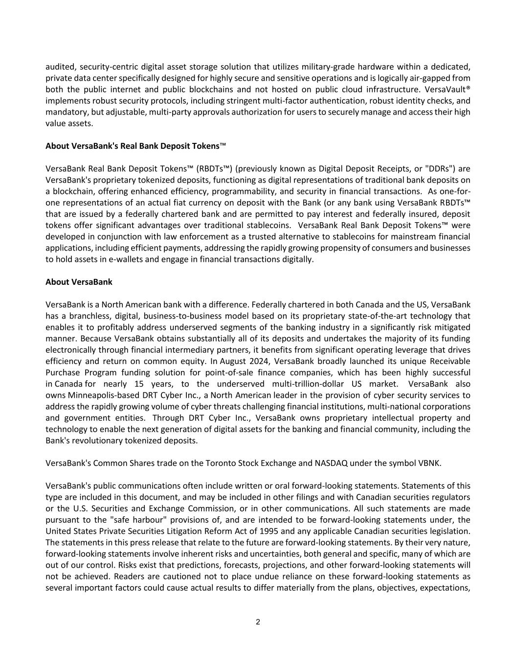 2 audited, security-centric digital asset storage solution that utilizes military-grade hardware within a dedicated, private data center specifically designed for highly secure and sensitive operations and is logically air-gapped from both the public internet and public blockchains and not hosted on public cloud infrastructure. VersaVault® implements robust security protocols, including stringent multi-factor authentication, robust identity checks, and mandatory, but adjustable, multi-party approvals authorization for users to securely manage and access their high value assets. About VersaBank's Real Bank Deposit Tokens™ VersaBank Real Bank Deposit Tokens™ (RBDTs™) (previously known as Digital Deposit Receipts, or "DDRs") are VersaBank's proprietary tokenized deposits, functioning as digital representations of traditional bank deposits on a blockchain, offering enhanced efficiency, programmability, and security in financial transactions. As one-for- one representations of an actual fiat currency on deposit with the Bank (or any bank using VersaBank RBDTs™ that are issued by a federally chartered bank and are permitted to pay interest and federally insured, deposit tokens offer significant advantages over traditional stablecoins. VersaBank Real Bank Deposit Tokens™ were developed in conjunction with law enforcement as a trusted alternative to stablecoins for mainstream financial applications, including efficient payments, addressing the rapidly growing propensity of consumers and businesses to hold assets in e-wallets and engage in financial transactions digitally. About VersaBank VersaBank is a North American bank with a difference. Federally chartered in both Canada and the US, VersaBank has a branchless, digital, business-to-business model based on its proprietary state-of-the-art technology that enables it to profitably address underserved segments of the banking industry in a significantly risk mitigated manner. Because VersaBank obtains substantially all of its deposits and undertakes the majority of its funding electronically through financial intermediary partners, it benefits from significant operating leverage that drives efficiency and return on common equity. In August 2024, VersaBank broadly launched its unique Receivable Purchase Program funding solution for point-of-sale finance companies, which has been highly successful in Canada for nearly 15 years, to the underserved multi-trillion-dollar US market. VersaBank also owns Minneapolis-based DRT Cyber Inc., a North American leader in the provision of cyber security services to address the rapidly growing volume of cyber threats challenging financial institutions, multi-national corporations and government entities. Through DRT Cyber Inc., VersaBank owns proprietary intellectual property and technology to enable the next generation of digital assets for the banking and financial community, including the Bank's revolutionary tokenized deposits. VersaBank's Common Shares trade on the Toronto Stock Exchange and NASDAQ under the symbol VBNK. VersaBank's public communications often include written or oral forward-looking statements. Statements of this type are included in this document, and may be included in other filings and with Canadian securities regulators or the U.S. Securities and Exchange Commission, or in other communications. All such statements are made pursuant to the "safe harbour" provisions of, and are intended to be forward-looking statements under, the United States Private Securities Litigation Reform Act of 1995 and any applicable Canadian securities legislation. The statements in this press release that relate to the future are forward-looking statements. By their very nature, forward-looking statements involve inherent risks and uncertainties, both general and specific, many of which are out of our control. Risks exist that predictions, forecasts, projections, and other forward-looking statements will not be achieved. Readers are cautioned not to place undue reliance on these forward-looking statements as several important factors could cause actual results to differ materially from the plans, objectives, expectations,