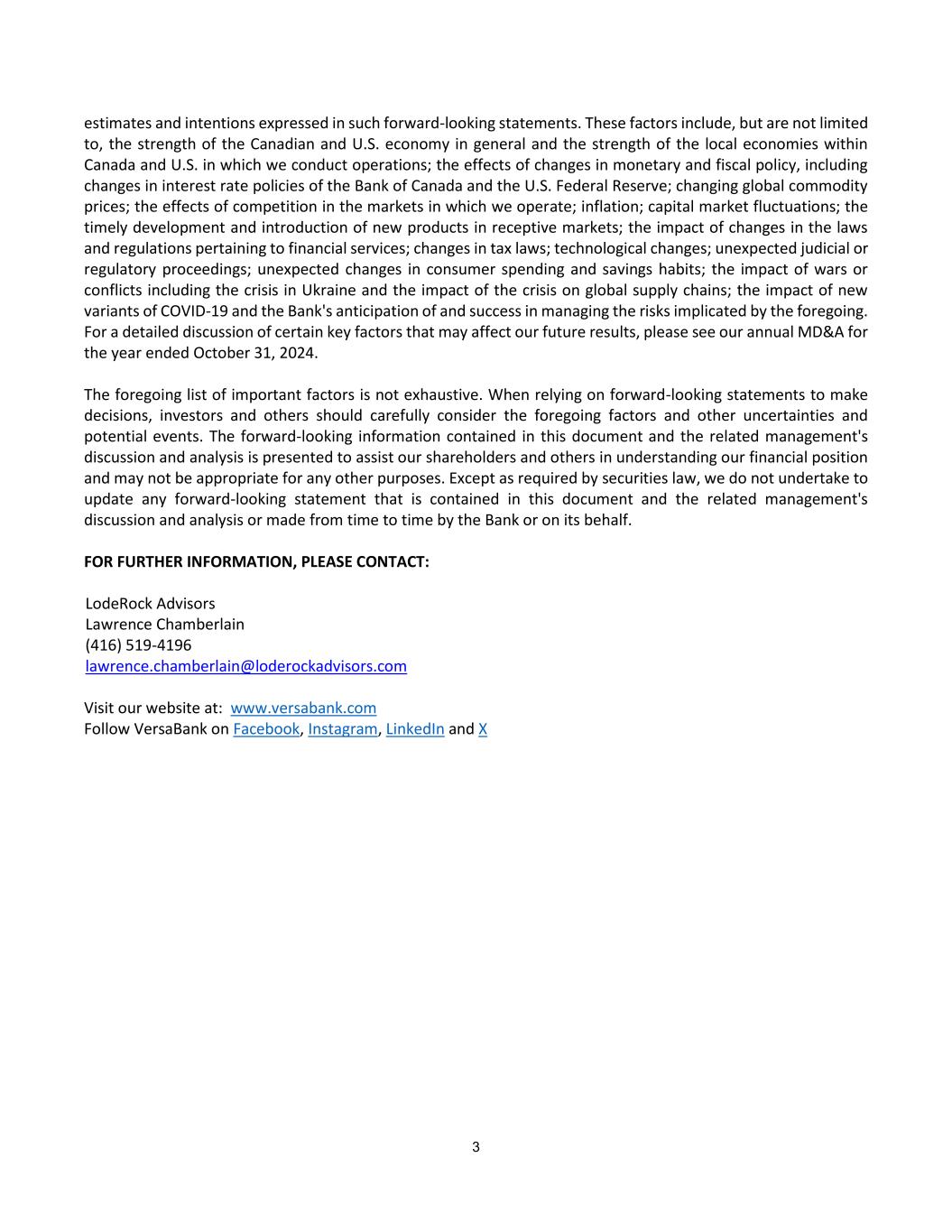 3 estimates and intentions expressed in such forward-looking statements. These factors include, but are not limited to, the strength of the Canadian and U.S. economy in general and the strength of the local economies within Canada and U.S. in which we conduct operations; the effects of changes in monetary and fiscal policy, including changes in interest rate policies of the Bank of Canada and the U.S. Federal Reserve; changing global commodity prices; the effects of competition in the markets in which we operate; inflation; capital market fluctuations; the timely development and introduction of new products in receptive markets; the impact of changes in the laws and regulations pertaining to financial services; changes in tax laws; technological changes; unexpected judicial or regulatory proceedings; unexpected changes in consumer spending and savings habits; the impact of wars or conflicts including the crisis in Ukraine and the impact of the crisis on global supply chains; the impact of new variants of COVID-19 and the Bank's anticipation of and success in managing the risks implicated by the foregoing. For a detailed discussion of certain key factors that may affect our future results, please see our annual MD&A for the year ended October 31, 2024. The foregoing list of important factors is not exhaustive. When relying on forward-looking statements to make decisions, investors and others should carefully consider the foregoing factors and other uncertainties and potential events. The forward-looking information contained in this document and the related management's discussion and analysis is presented to assist our shareholders and others in understanding our financial position and may not be appropriate for any other purposes. Except as required by securities law, we do not undertake to update any forward-looking statement that is contained in this document and the related management's discussion and analysis or made from time to time by the Bank or on its behalf. FOR FURTHER INFORMATION, PLEASE CONTACT: LodeRock Advisors Lawrence Chamberlain (416) 519-4196 lawrence.chamberlain@loderockadvisors.com Visit our website at: www.versabank.com Follow VersaBank on Facebook, Instagram, LinkedIn and X