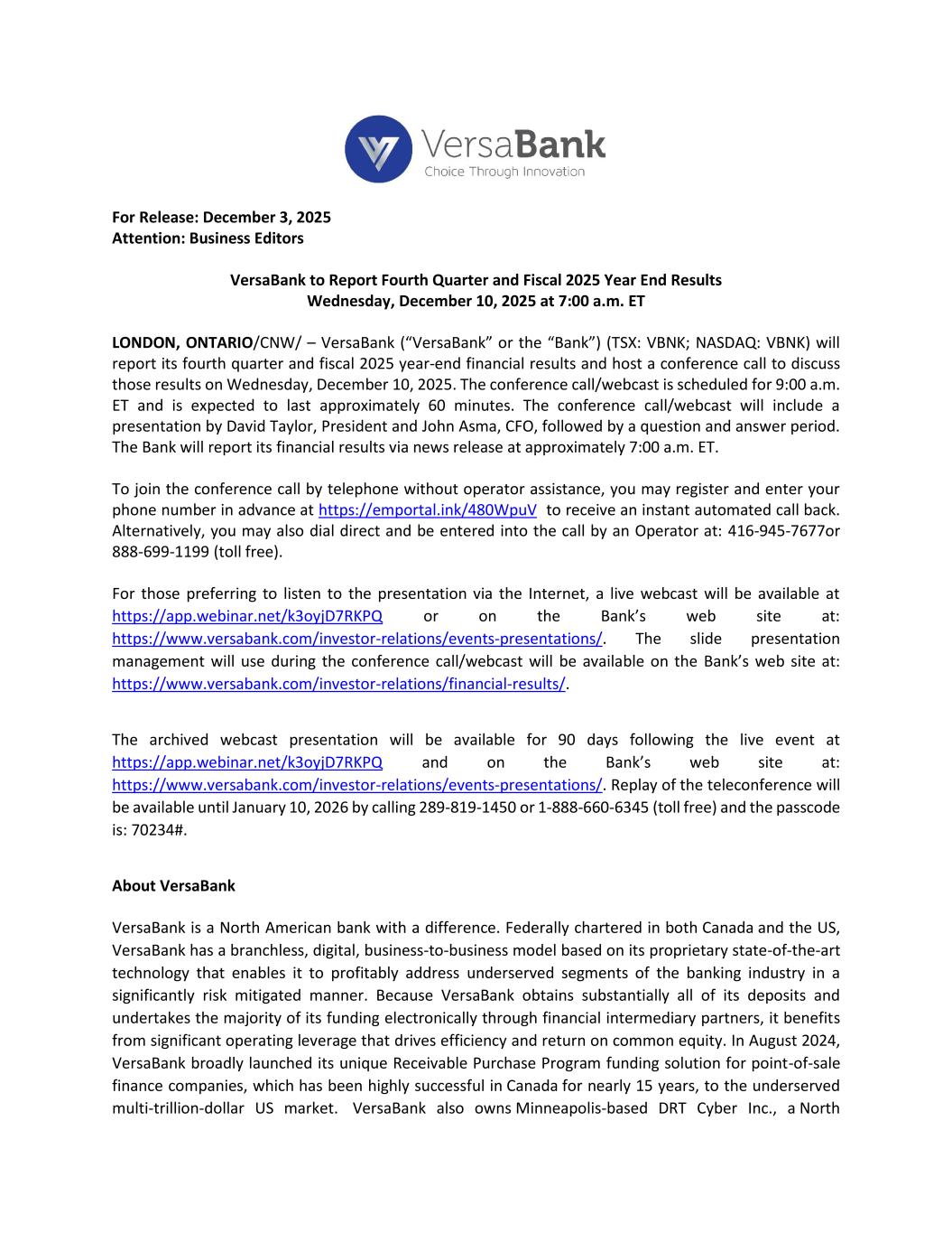 For Release: December 3, 2025 Attention: Business Editors VersaBank to Report Fourth Quarter and Fiscal 2025 Year End Results Wednesday, December 10, 2025 at 7:00 a.m. ET LONDON, ONTARIO/CNW/ – VersaBank (“VersaBank” or the “Bank”) (TSX: VBNK; NASDAQ: VBNK) will report its fourth quarter and fiscal 2025 year-end financial results and host a conference call to discuss those results on Wednesday, December 10, 2025. The conference call/webcast is scheduled for 9:00 a.m. ET and is expected to last approximately 60 minutes. The conference call/webcast will include a presentation by David Taylor, President and John Asma, CFO, followed by a question and answer period. The Bank will report its financial results via news release at approximately 7:00 a.m. ET. To join the conference call by telephone without operator assistance, you may register and enter your phone number in advance at https://emportal.ink/480WpuV to receive an instant automated call back. Alternatively, you may also dial direct and be entered into the call by an Operator at: 416-945-7677or 888-699-1199 (toll free). For those preferring to listen to the presentation via the Internet, a live webcast will be available at https://app.webinar.net/k3oyjD7RKPQ or on the Bank’s web site at: https://www.versabank.com/investor-relations/events-presentations/. The slide presentation management will use during the conference call/webcast will be available on the Bank’s web site at: https://www.versabank.com/investor-relations/financial-results/. The archived webcast presentation will be available for 90 days following the live event at https://app.webinar.net/k3oyjD7RKPQ and on the Bank’s web site at: https://www.versabank.com/investor-relations/events-presentations/. Replay of the teleconference will be available until January 10, 2026 by calling 289-819-1450 or 1-888-660-6345 (toll free) and the passcode is: 70234#. About VersaBank VersaBank is a North American bank with a difference. Federally chartered in both Canada and the US, VersaBank has a branchless, digital, business-to-business model based on its proprietary state-of-the-art technology that enables it to profitably address underserved segments of the banking industry in a significantly risk mitigated manner. Because VersaBank obtains substantially all of its deposits and undertakes the majority of its funding electronically through financial intermediary partners, it benefits from significant operating leverage that drives efficiency and return on common equity. In August 2024, VersaBank broadly launched its unique Receivable Purchase Program funding solution for point-of-sale finance companies, which has been highly successful in Canada for nearly 15 years, to the underserved multi-trillion-dollar US market. VersaBank also owns Minneapolis-based DRT Cyber Inc., a North