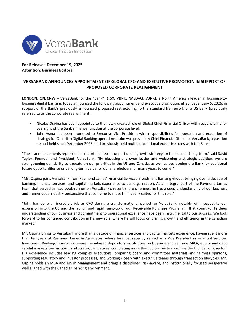 1 For Release: December 19, 2025 Attention: Business Editors VERSABANK ANNOUNCES APPOINTMENT OF GLOBAL CFO AND EXECUTIVE PROMOTION IN SUPPORT OF PROPOSED CORPORATE REALIGNMENT LONDON, ON/CNW – VersaBank (or the “Bank”) (TSX: VBNK; NASDAQ: VBNK), a North American leader in business-to- business digital banking, today announced the following appointment and executive promotion, effective January 5, 2026, in support of the Bank’s previously announced proposed restructuring to the standard framework of a US Bank (previously referred to as the corporate realignment). • Nicolas Ospina has been appointed to the newly created role of Global Chief Financial Officer with responsibility for oversight of the Bank’s finance function at the corporate level. • John Asma has been promoted to Executive Vice President with responsibilities for operation and execution of strategy for Canadian Digital Banking operations. John was previously Chief Financial Officer of VersaBank, a position he had held since December 2023, and previously held multiple additional executive roles with the Bank. “These announcements represent an important step in support of our growth strategy for the near and long-term,” said David Taylor, Founder and President, VersaBank. “By elevating a proven leader and welcoming a strategic addition, we are strengthening our ability to execute on our priorities in the US and Canada, as well as positioning the Bank for additional future opportunities to drive long-term value for our shareholders for many years to come.” “Mr. Ospina joins VersaBank from Raymond James’ Financial Services Investment Banking Group, bringing over a decade of banking, financial services, and capital markets experience to our organization. As an integral part of the Raymond James team that served as lead book-runner on VersaBank’s recent share offerings, he has a deep understanding of our business and tremendous industry perspective that combine to make him ideally suited for this role.” “John has done an incredible job as CFO during a transformational period for VersaBank, notably with respect to our expansion into the US and the launch and rapid ramp-up of our Receivable Purchase Program in that country. His deep understanding of our business and commitment to operational excellence have been instrumental to our success. We look forward to his continued contribution in his new role, where he will focus on driving growth and efficiency in the Canadian market.” Mr. Ospina brings to VersaBank more than a decade of financial services and capital markets experience, having spent more than ten years at Raymond James & Associates, where he most recently served as a Vice President in Financial Services Investment Banking. During his tenure, he advised depository institutions on buy-side and sell-side M&A, equity and debt capital markets transactions, and strategic initiatives, completing more than 50 transactions across the U.S. banking sector. His experience includes leading complex executions, preparing board and committee materials and fairness opinions, supporting regulatory and investor processes, and working closely with executive teams through transaction lifecycles. Mr. Ospina holds an MBA and MS in Management and brings a disciplined, risk-aware, and institutionally focused perspective well aligned with the Canadian banking environment.