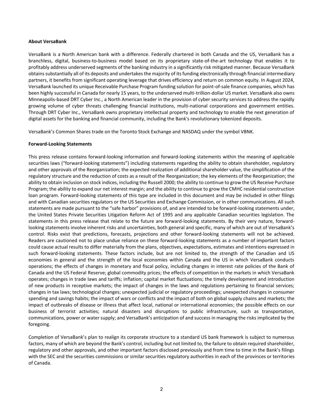 2 About VersaBank VersaBank is a North American bank with a difference. Federally chartered in both Canada and the US, VersaBank has a branchless, digital, business-to-business model based on its proprietary state-of-the-art technology that enables it to profitably address underserved segments of the banking industry in a significantly risk mitigated manner. Because VersaBank obtains substantially all of its deposits and undertakes the majority of its funding electronically through financial intermediary partners, it benefits from significant operating leverage that drives efficiency and return on common equity. In August 2024, VersaBank launched its unique Receivable Purchase Program funding solution for point-of-sale finance companies, which has been highly successful in Canada for nearly 15 years, to the underserved multi-trillion-dollar US market. VersaBank also owns Minneapolis-based DRT Cyber Inc., a North American leader in the provision of cyber security services to address the rapidly growing volume of cyber threats challenging financial institutions, multi-national corporations and government entities. Through DRT Cyber Inc., VersaBank owns proprietary intellectual property and technology to enable the next generation of digital assets for the banking and financial community, including the Bank's revolutionary tokenized deposits. VersaBank’s Common Shares trade on the Toronto Stock Exchange and NASDAQ under the symbol VBNK. Forward-Looking Statements This press release contains forward-looking information and forward-looking statements within the meaning of applicable securities laws (“forward-looking statements”) including statements regarding the ability to obtain shareholder, regulatory and other approvals of the Reorganization; the expected realization of additional shareholder value, the simplification of the regulatory structure and the reduction of costs as a result of the Reorganization; the key elements of the Reorganization; the ability to obtain inclusion on stock indices, including the Russell 2000; the ability to continue to grow the US Receive Purchase Program; the ability to expand our net interest margin; and the ability to continue to grow the CMHC residential construction loan program. Forward-looking statements of this type are included in this document and may be included in other filings and with Canadian securities regulators or the US Securities and Exchange Commission, or in other communications. All such statements are made pursuant to the “safe harbor” provisions of, and are intended to be forward-looking statements under, the United States Private Securities Litigation Reform Act of 1995 and any applicable Canadian securities legislation. The statements in this press release that relate to the future are forward-looking statements. By their very nature, forward- looking statements involve inherent risks and uncertainties, both general and specific, many of which are out of VersaBank’s control. Risks exist that predictions, forecasts, projections and other forward-looking statements will not be achieved. Readers are cautioned not to place undue reliance on these forward-looking statements as a number of important factors could cause actual results to differ materially from the plans, objectives, expectations, estimates and intentions expressed in such forward-looking statements. These factors include, but are not limited to, the strength of the Canadian and US economies in general and the strength of the local economies within Canada and the US in which VersaBank conducts operations; the effects of changes in monetary and fiscal policy, including changes in interest rate policies of the Bank of Canada and the US Federal Reserve; global commodity prices; the effects of competition in the markets in which VersaBank operates; changes in trade laws and tariffs; inflation; capital market fluctuations; the timely development and introduction of new products in receptive markets; the impact of changes in the laws and regulations pertaining to financial services; changes in tax laws; technological changes; unexpected judicial or regulatory proceedings; unexpected changes in consumer spending and savings habits; the impact of wars or conflicts and the impact of both on global supply chains and markets; the impact of outbreaks of disease or illness that affect local, national or international economies; the possible effects on our business of terrorist activities; natural disasters and disruptions to public infrastructure, such as transportation, communications, power or water supply; and VersaBank’s anticipation of and success in managing the risks implicated by the foregoing. Completion of VersaBank’s plan to realign its corporate structure to a standard US bank framework is subject to numerous factors, many of which are beyond the Bank’s control, including but not limited to, the failure to obtain required shareholder, regulatory and other approvals, and other important factors disclosed previously and from time to time in the Bank’s filings with the SEC and the securities commissions or similar securities regulatory authorities in each of the provinces or territories of Canada.