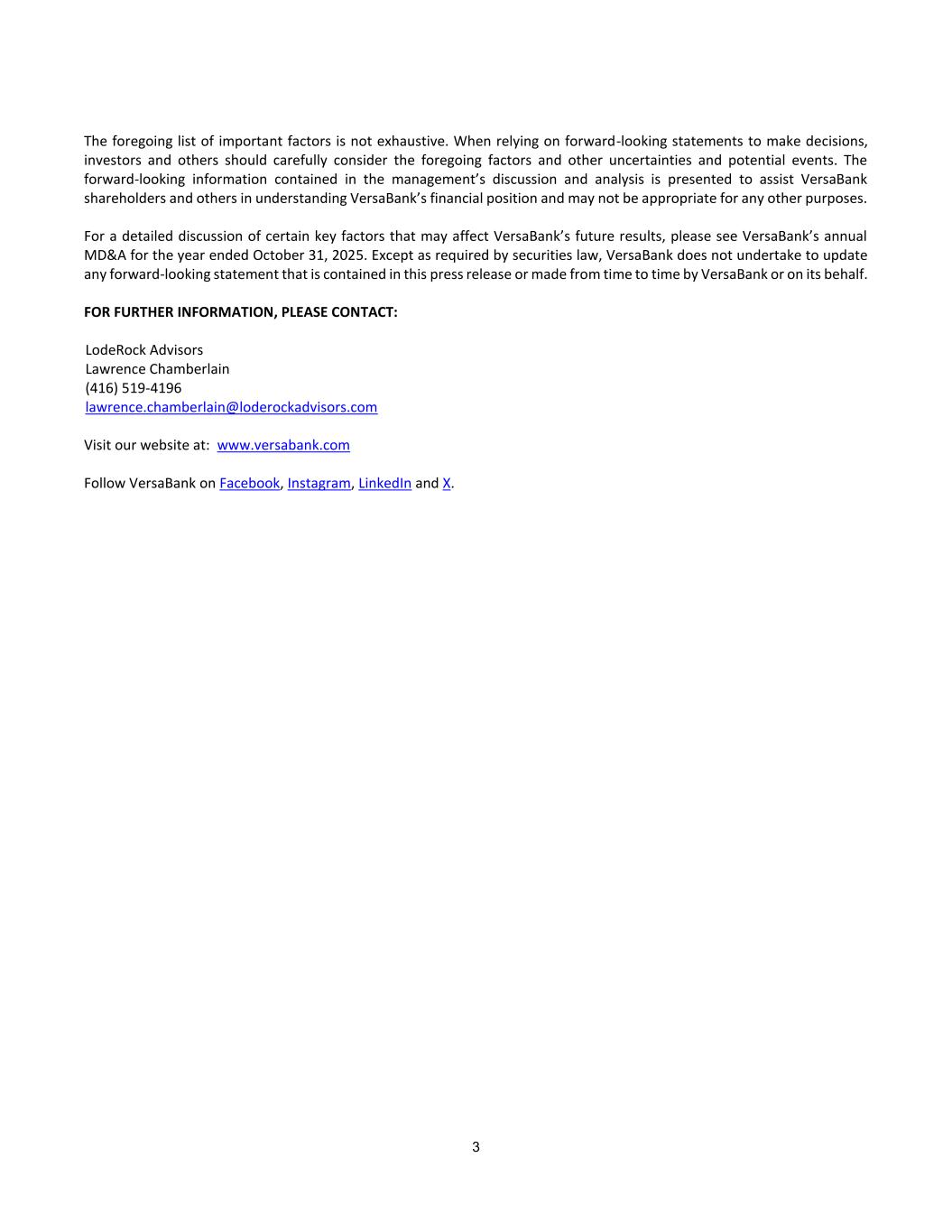 3 The foregoing list of important factors is not exhaustive. When relying on forward-looking statements to make decisions, investors and others should carefully consider the foregoing factors and other uncertainties and potential events. The forward-looking information contained in the management’s discussion and analysis is presented to assist VersaBank shareholders and others in understanding VersaBank’s financial position and may not be appropriate for any other purposes. For a detailed discussion of certain key factors that may affect VersaBank’s future results, please see VersaBank’s annual MD&A for the year ended October 31, 2025. Except as required by securities law, VersaBank does not undertake to update any forward-looking statement that is contained in this press release or made from time to time by VersaBank or on its behalf. FOR FURTHER INFORMATION, PLEASE CONTACT: LodeRock Advisors Lawrence Chamberlain (416) 519-4196 lawrence.chamberlain@loderockadvisors.com Visit our website at: www.versabank.com Follow VersaBank on Facebook, Instagram, LinkedIn and X.