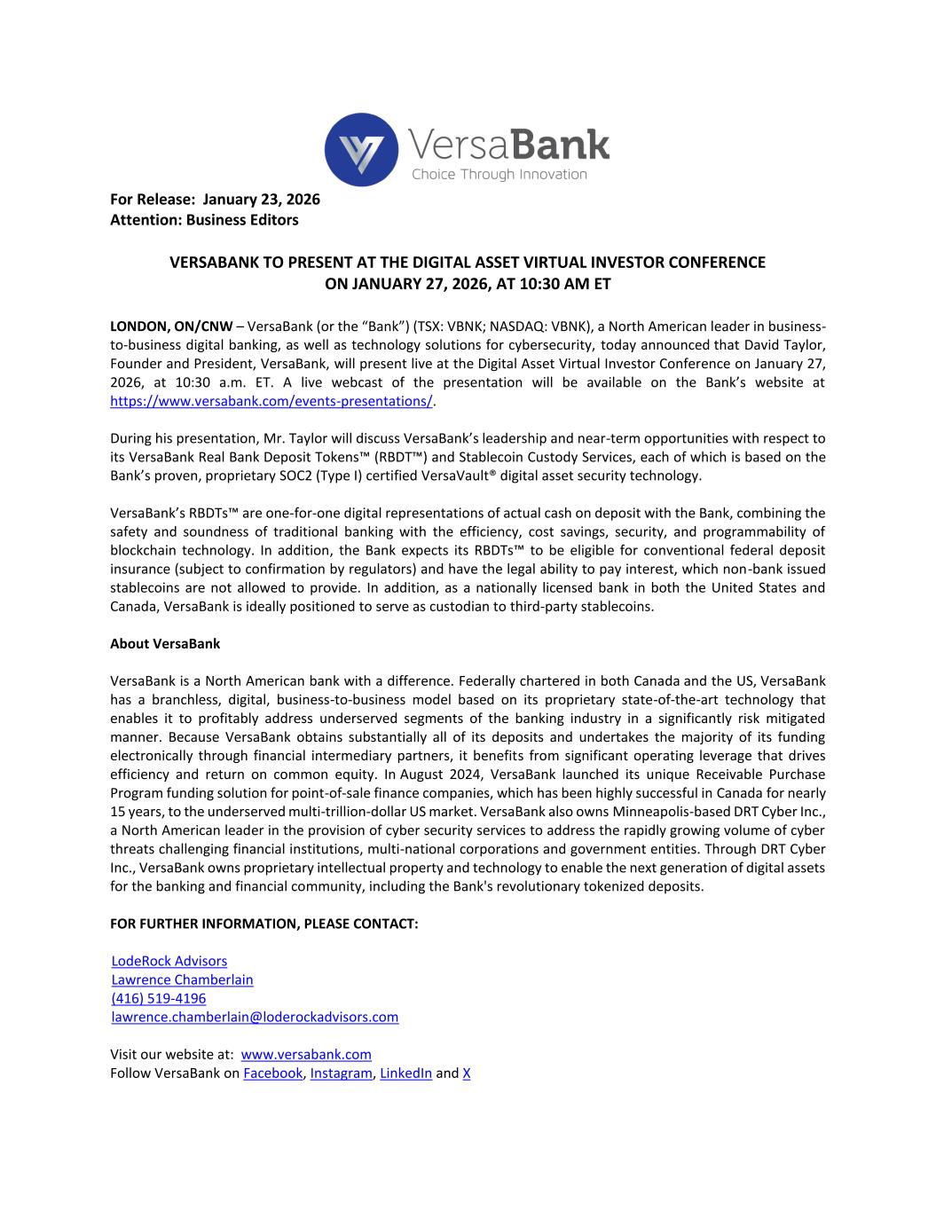 For Release: January 23, 2026 Attention: Business Editors VERSABANK TO PRESENT AT THE DIGITAL ASSET VIRTUAL INVESTOR CONFERENCE ON JANUARY 27, 2026, AT 10:30 AM ET LONDON, ON/CNW – VersaBank (or the “Bank”) (TSX: VBNK; NASDAQ: VBNK), a North American leader in business- to-business digital banking, as well as technology solutions for cybersecurity, today announced that David Taylor, Founder and President, VersaBank, will present live at the Digital Asset Virtual Investor Conference on January 27, 2026, at 10:30 a.m. ET. A live webcast of the presentation will be available on the Bank’s website at https://www.versabank.com/events-presentations/. During his presentation, Mr. Taylor will discuss VersaBank’s leadership and near-term opportunities with respect to its VersaBank Real Bank Deposit Tokens™ (RBDT™) and Stablecoin Custody Services, each of which is based on the Bank’s proven, proprietary SOC2 (Type I) certified VersaVault® digital asset security technology. VersaBank’s RBDTs™ are one-for-one digital representations of actual cash on deposit with the Bank, combining the safety and soundness of traditional banking with the efficiency, cost savings, security, and programmability of blockchain technology. In addition, the Bank expects its RBDTs™ to be eligible for conventional federal deposit insurance (subject to confirmation by regulators) and have the legal ability to pay interest, which non-bank issued stablecoins are not allowed to provide. In addition, as a nationally licensed bank in both the United States and Canada, VersaBank is ideally positioned to serve as custodian to third-party stablecoins. About VersaBank VersaBank is a North American bank with a difference. Federally chartered in both Canada and the US, VersaBank has a branchless, digital, business-to-business model based on its proprietary state-of-the-art technology that enables it to profitably address underserved segments of the banking industry in a significantly risk mitigated manner. Because VersaBank obtains substantially all of its deposits and undertakes the majority of its funding electronically through financial intermediary partners, it benefits from significant operating leverage that drives efficiency and return on common equity. In August 2024, VersaBank launched its unique Receivable Purchase Program funding solution for point-of-sale finance companies, which has been highly successful in Canada for nearly 15 years, to the underserved multi-trillion-dollar US market. VersaBank also owns Minneapolis-based DRT Cyber Inc., a North American leader in the provision of cyber security services to address the rapidly growing volume of cyber threats challenging financial institutions, multi-national corporations and government entities. Through DRT Cyber Inc., VersaBank owns proprietary intellectual property and technology to enable the next generation of digital assets for the banking and financial community, including the Bank's revolutionary tokenized deposits. FOR FURTHER INFORMATION, PLEASE CONTACT: LodeRock Advisors Lawrence Chamberlain (416) 519-4196 lawrence.chamberlain@loderockadvisors.com Visit our website at: www.versabank.com Follow VersaBank on Facebook, Instagram, LinkedIn and X