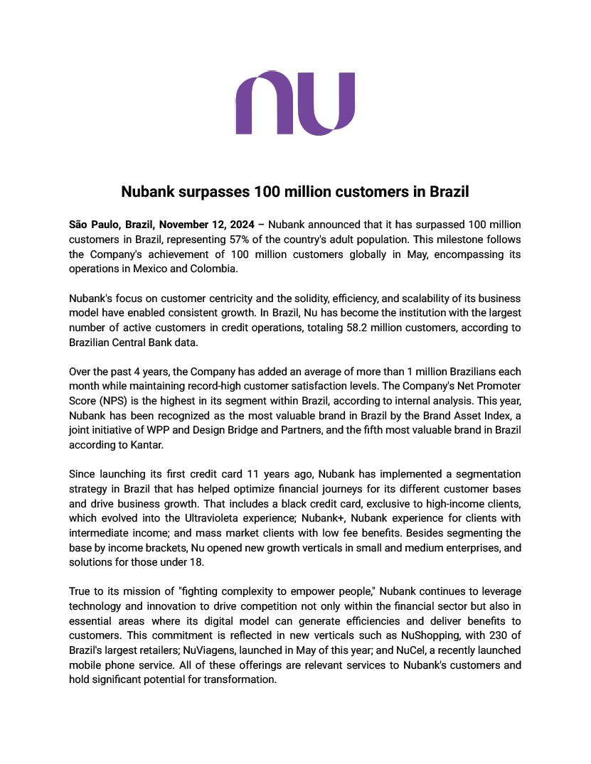 Nubank surpasses 100 million customers in Brazil São Paulo, Brazil, November 12, 2024 – Nubank announced today that it has surpassed 100 million customers in Brazil, representing 57% of the country's adult population. This milestone follows the company's achievement of 100 million customers globally in May, encompassing its operations in Mexico and Colombia. Nubank's focus on customer centricity and the solidity, effi ciency, and scalability of its business model have enabled consistent growth. In Brazil, Nu has become the institution with the largest number of active customers in credit operations, totaling 58.2 million customers, according to Brazilian Central Bank data. Over the past 4 years, the company has added an average of more than 1 million Brazilians each month while maintaining record-high customer satisfaction levels. The company's Net Promoter Score (NPS) is the highest in its segment within Brazil, according to internal analysis. This year, Nubank has been recognized as the most valuable brand in Brazil by the Brand Asset Index, a joint initiative of WPP and Design Bridge and Partners, and the fi fth most valuable brand in Brazil according to Kantar. Since launching its fi rst credit card 11 years ago, Nubank has implemented a segmentation strategy in Brazil that has helped optimize fi nancial journeys for its different customer bases and drive business growth. That includes a black credit card, exclusive to high-income clients, which evolved into the Ultravioleta experience; Nubank+, Nubank experience for clients with intermediate income; and mass market clients with low fee benefi ts. Besides segmenting the base by income brackets, Nu opened new growth verticals in small and medium enterprises, and solutions for those under 18. True to its mission of "fi ghting complexity to empower people," Nubank continues to leverage technology and innovation to drive competition not only within the fi nancial sector but also in essential areas where its digital model can generate effi ciencies and deliver benefi ts to customers. This commitment is refl ected in new verticals such as NuShopping, with 230 of Brazil's largest retailers; NuViagens, launched in May of this year; and NuCel, a recently launched mobile phone service. All of these offerings are relevant services to Nubank's customers and hold signifi cant potential for transformation. About Nu Nu is one of the world’s largest digital fi nancial services platforms, serving over 100 million customers across Brazil, Mexico, and Colombia. The company has been leading an industry transformation by leveraging data and proprietary technology to develop innovative products and services. Guided by its mission to fi ght complexity and empower people, Nu caters to customers’ complete fi nancial journey, promoting fi nancial access and advancement with responsible lending and transparency. The company is
