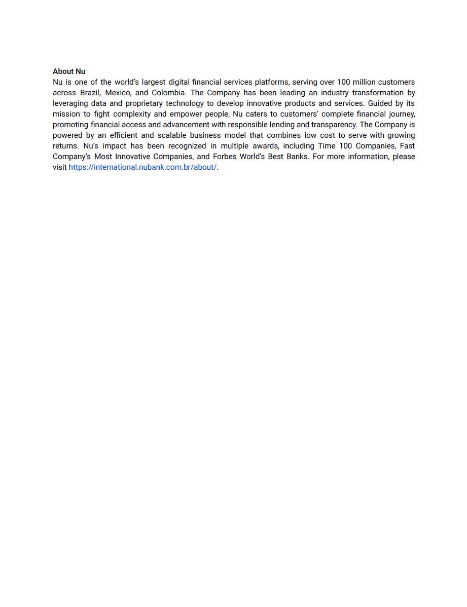powered by an efficient and scalable business model that combines low cost to serve with growing returns. Nu’s impact has been recognized in multiple awards, including Time 100 Companies, Fast Company’s Most Innovative Companies, and Forbes World’s Best Banks. For more information, please visit https://international.nubank.com.br/about/ .
