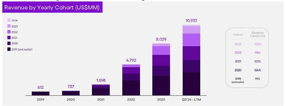 Nu’s flywheel effectively drives customer engagement, as evidenced by strong cohort performance on revenues. This consistent compound growth across all cohorts underpins Nu’s ability to cross-sell and upsell to customers.