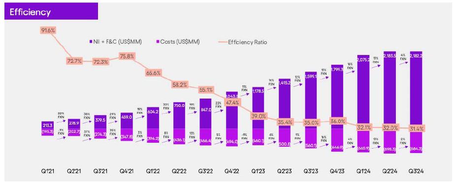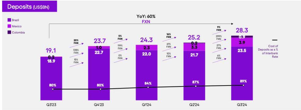 During the quarter, deposits increased 60% YoY FXN, to $28.3 billion in Q3'24, while the funding cost reached 89% of the blended interbank rates of the countries in which we operate in the quarter. The loan-to-deposit ratio (LDR) was 40%, versus 39% in the previous quarter.