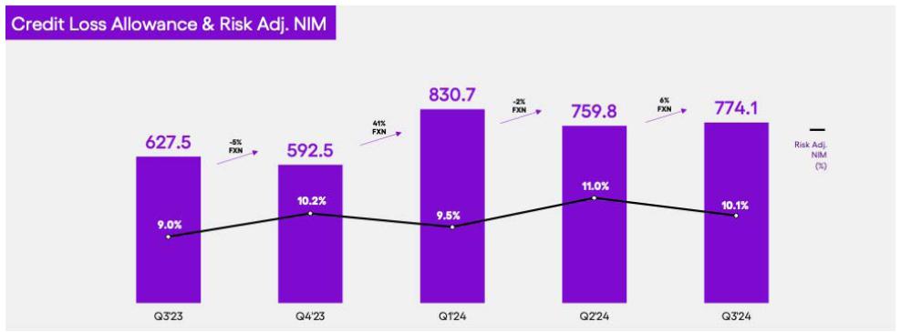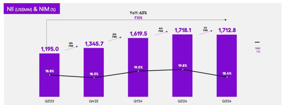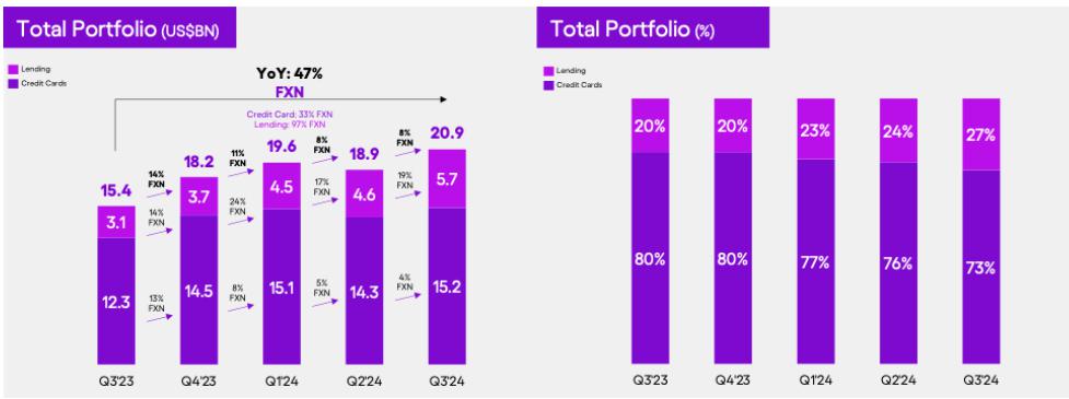 Total credit card and lending gross receivables increased 47% YoY FXN, reaching $20.9 billion in Q3'24 while the Interest Earning Portfolio (“IEP”) rose 81% YoY FXN, to $11.2 billion. Growth was mainly driven by sustained growth in credit card receivables, which were up 33% YoY FXN to $15.2 billion, and in lending, which increased 97% YoY FXN to $5.7 billion.