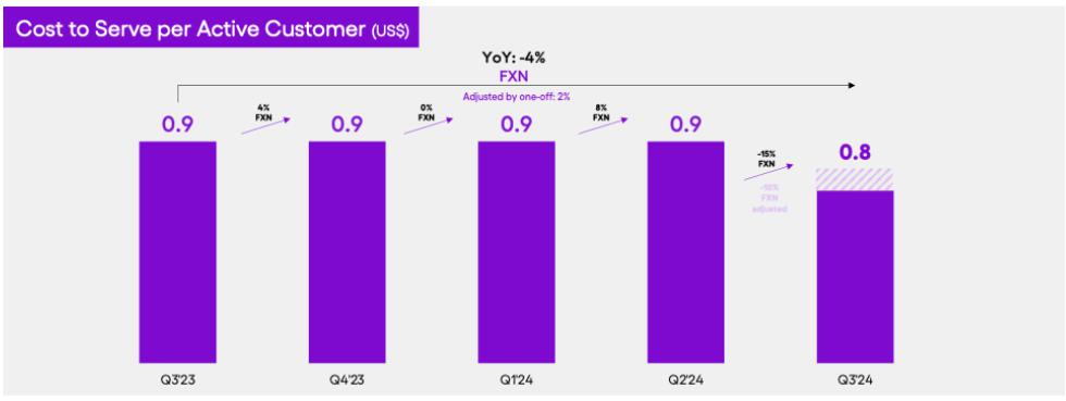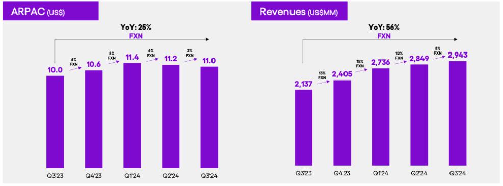 Net Income increased to $553.4 million, from $303.0 million in Q3'23, while Adjusted Net Income increased to $592.2 million, from $355.6 million in Q3'23. Revenues were up 56% YoY on an FXN basis, setting a new record at $2.9 billion. Monthly Average Revenue per Active Customer (ARPAC) increased 25% YoY FXN, to $11.0.