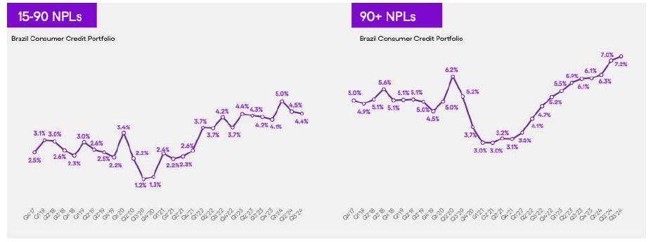 Nu's asset quality leading indicator, the 15-90 NPL ratio for the Brazil Consumer Credit Portfolio dropped 10 basis points (bp) sequentially to 4.4%3 this quarter, while the 90+ NPL ratio increased to 7.2%3, in line with expectations.