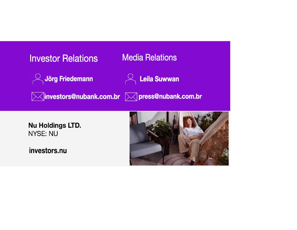 Nu is one of the world’s largest digital financial services platforms, serving more than 109 million customers across Brazil, Mexico and Colombia. Nu uses proprietary technologies and innovative business practices to create new financial solutions and experiences for individuals and SMEs that are simple, intuitive, convenient, low-cost, empowering and human. Guided by a mission to fight complexity and empower people, Nu is focused on connecting profit and purpose to create value for all stakeholders and have a positive impact on the communities it serves. Nu's shares are traded on the New York Stock Exchange (NYSE: NU). For more information, please visit www.nubank.com.br.