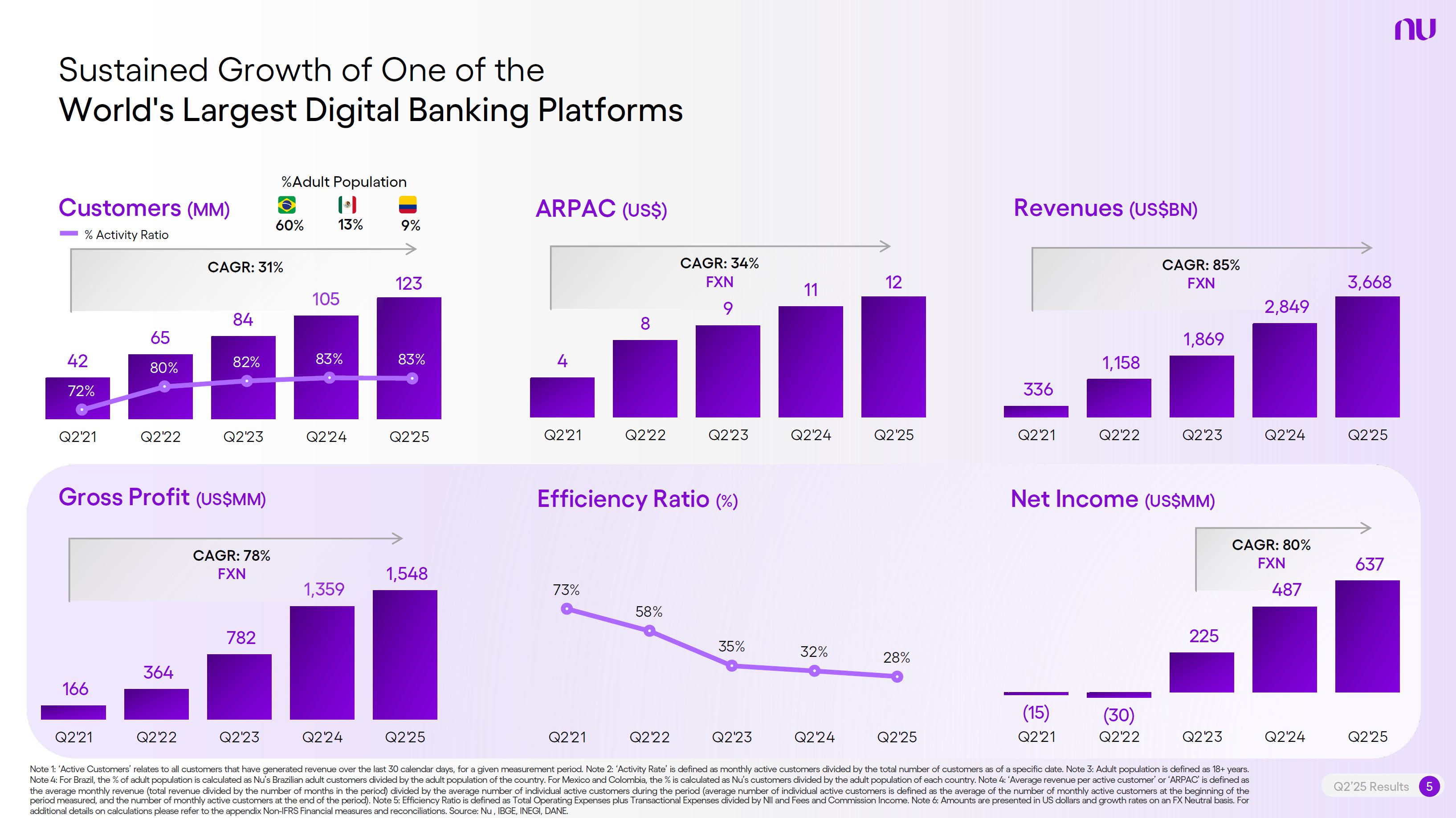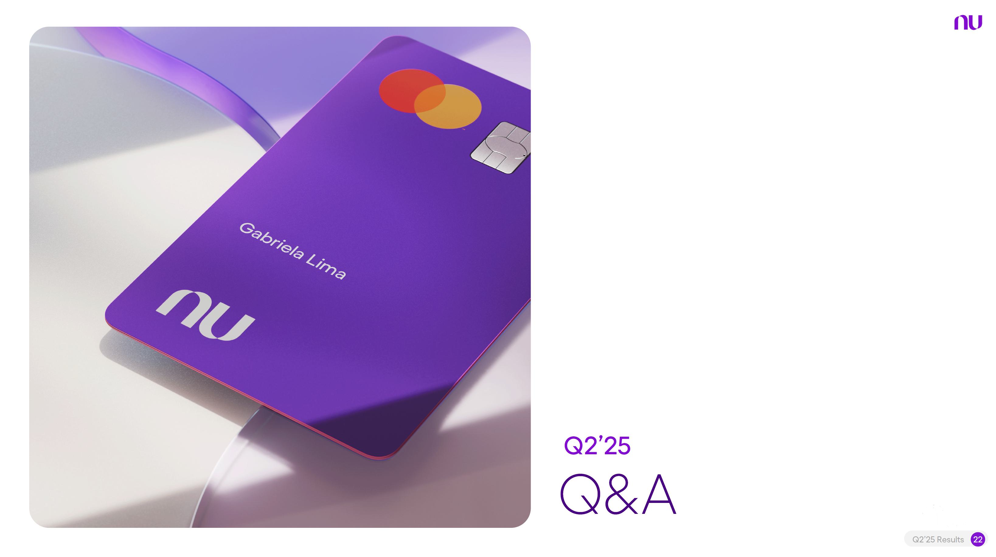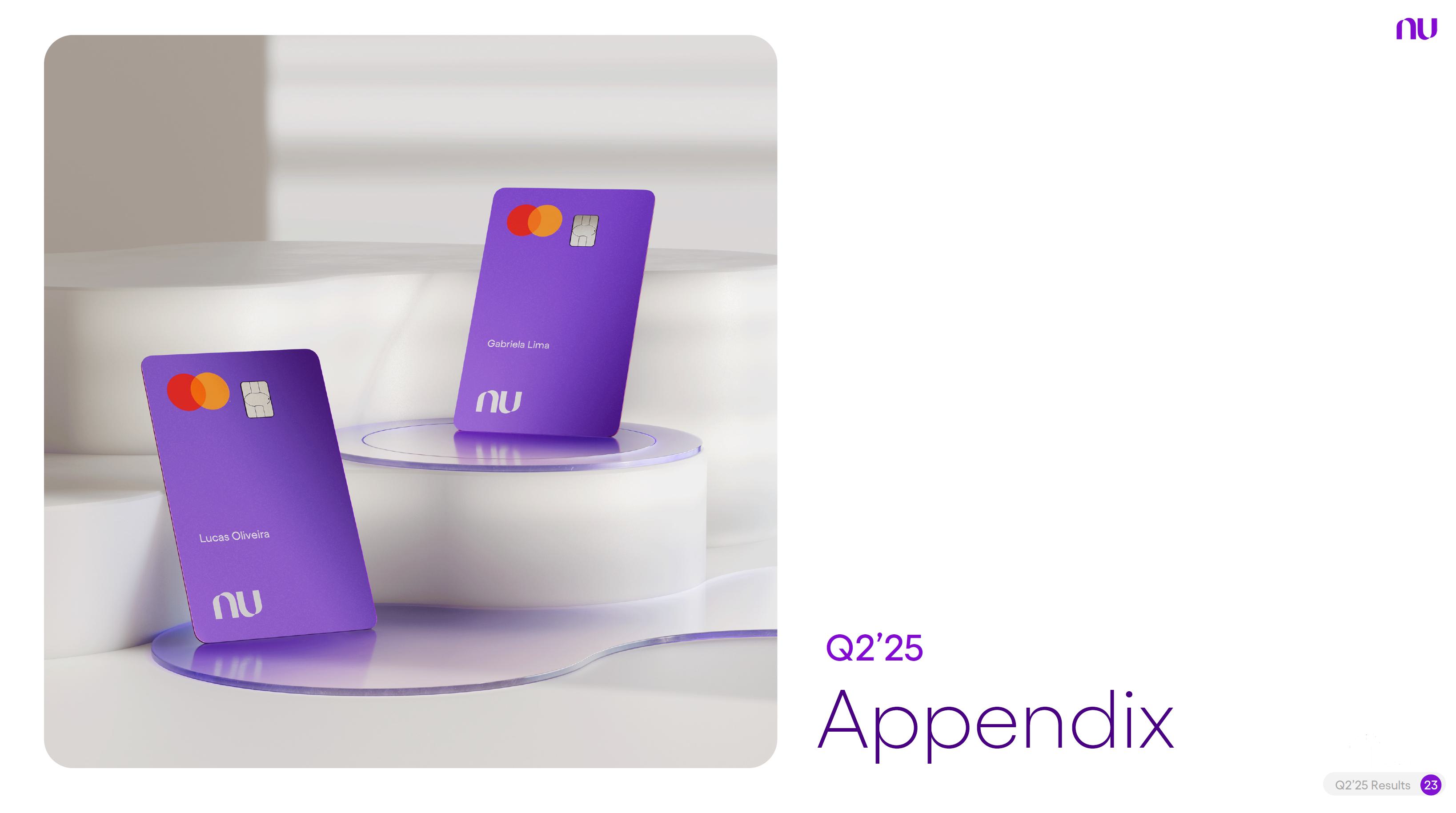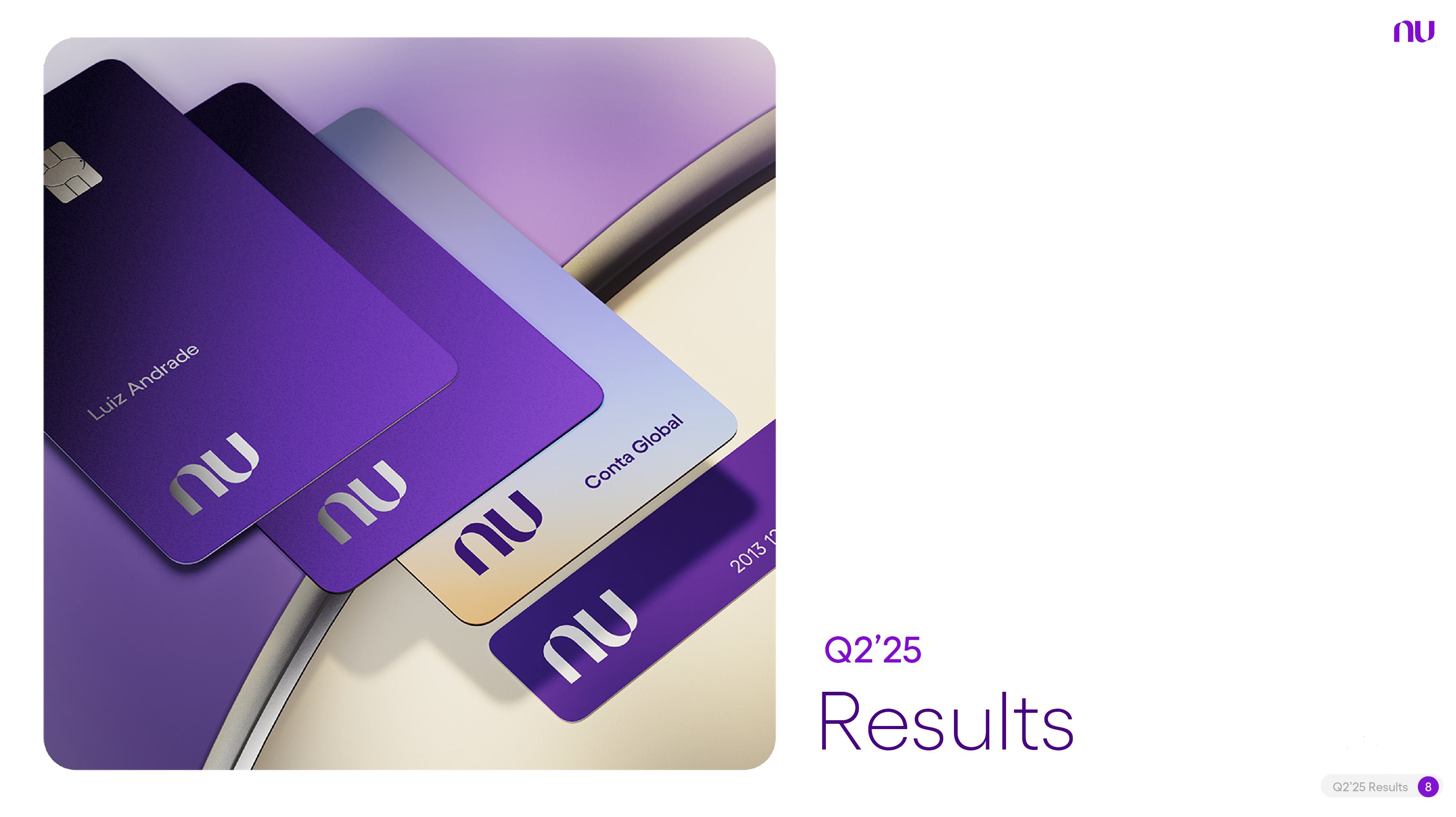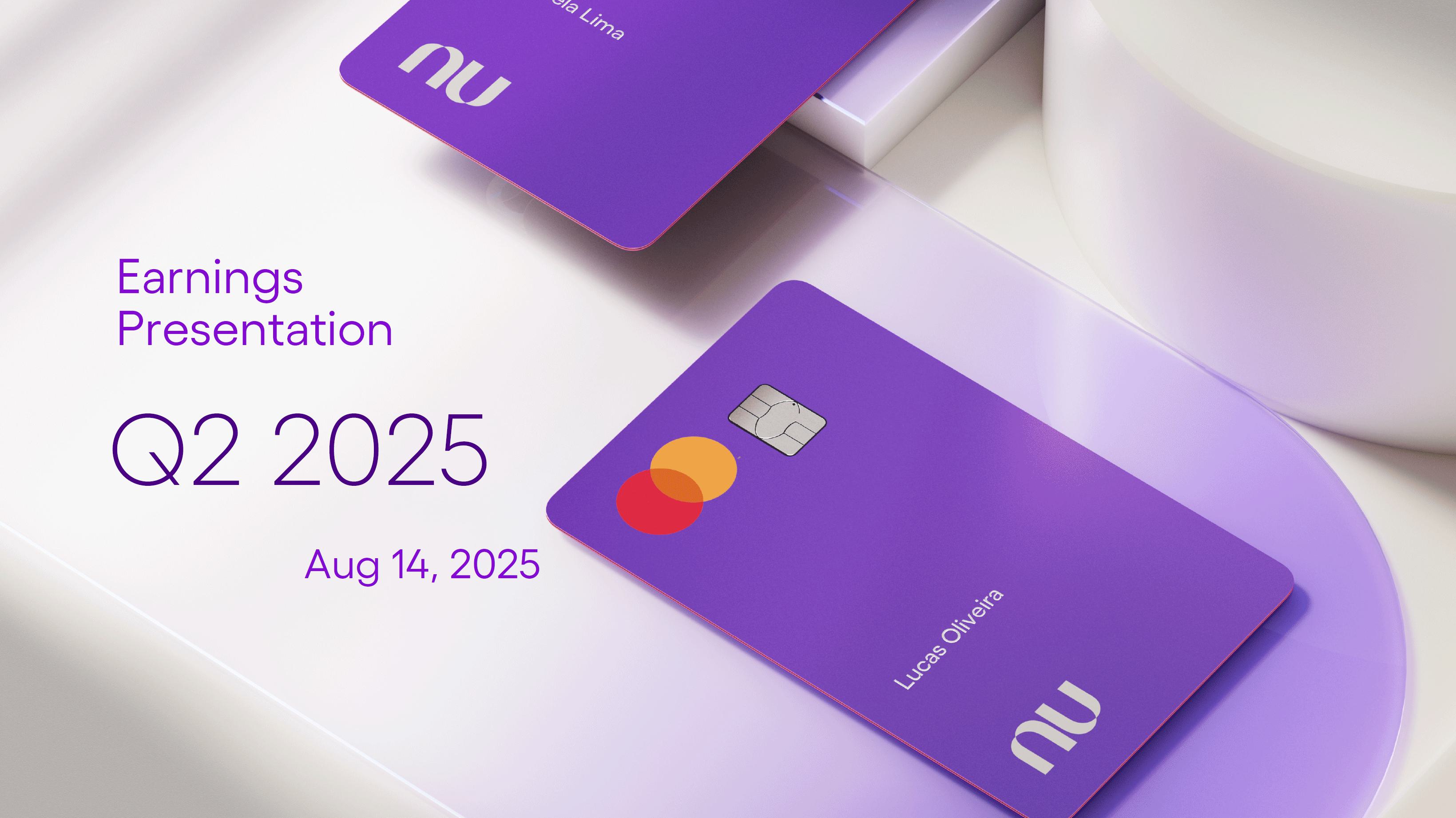 Earnings PresentationQ2 2025Aug 14, 2025  Q2’25 Results 2 Investor Relations Officer Guilherme Souto WelcomeQ2’25 Results 2 Investor Relations Officer Guilherme Souto Welcome   Guilherme LagoChief Financial OfficerDavid VélezFounder, Chief Executive Officer and ChairmanQ2’25 Results 3   DisclaimerThis presentation speaks at the date here of and the Company is under no obligation to update or keep current the information contained in this presentation. Any information expressed herein is subject to change without notice. Any market or other third-party data included in this presentation has been obtained by the Company from third-party sources. While the Company has compiled and extracted the market data, it can provide no assurances of the accuracy and completeness of such information and takes no responsibility for such data.This presentation contains forward-looking statements. All statements other than statements of historical fact contained in this presentation may be forward-looking statements and include, but are not limited to, statements regarding the Company’s intent, belief or current expectations. These forward-looking statements are subject to risks and uncertainties, and may include, among others, financial forecasts and estimates based on assumptions or statements regarding plans, objectives and expectations. Although the Company believes that these estimates and forward-looking statements are based upon reasonable assumptions, they are subject to several risks and uncertainties and are made in light of information currently available, and actual results may differ materially from those expressed or implied in the forward-looking statements due to various factors, including those risks and uncertainties included under the captions “Risk Factors” and “Management’s Discussion and Analysis of Financial Condition and Results of Operations” in the prospectus dated December 8, 2021 filed with the Securities and Exchange Commission pursuant to Rule 424(b) under the Securities Act of 1933, as amended, and in our Annual Report on Form 20-F for the year ended December 31, 2024, which was filed with the Securities and Exchange Commission on April 16, 2025.The Company, its advisers and each of their respective directors, officers and employees disclaim any obligation to update the Company’s view of such risks and uncertainties or to publicly announce the result of any revision to the forward-looking statements made herein, except where it would be required to do so under applicable law. The forward-looking statements can be identified, in certain cases, through the use of words such as “believe,” “may,” “might,” “can,” “could,” “is designed to,” “will,” “aim,” “estimate,” “continue,” “anticipate,” “intend,” “expect,” “forecast”, “plan”, “predict”, “potential”, “aspiration,” “should,” “purpose,” “belief,” and similar, or variations of, or the negative of such words and expressions. The financial information in this document includes forecasts, projections and other predictive statements that represent the Company’s assumptions and expectations in light of currently available information. These forecasts, projections and other predictive statements are based on the Company’s expectations and are subject to variables and uncertainties. The Company’s actual performance results may differ. Consequently, no guarantee is presented or implied as to the accuracy of specific forecasts, projections or predictive statements contained herein, and undue reliance should not be placed on the forward-looking statements in this presentation, which are inherently uncertain.In addition to IFRS financials, this presentation includes certain summarized, non-audited or non-IFRS financial information. These summarized, non-audited or non-IFRS financia addition to, and not a substi financial performance prepared in References in this presentati the official currency of Brazil.Q2’25 Results 4 l measures are in tute for or superior to, measures of accordance with IFRS. on to “R$” refer to the Brazilian Real,   Sustained Growth of One of theWorld's Largest Digital Banking Platforms%Adult PopulationCustomers (MM) ARPAC (US$) Revenues (US$BN)60% 13% 9%% Activity Ratio123 CAGR: 34% FXN 9 11 12 3,66884865 83%83% 1,869 42 4 1,158 33672% 105 CAGR: 31% CAGR: 85% FXN 2,849 80%82% Q2'21 Q2'22 Q2'23 Q2'24 Q2'25 Q2'21 Q2'22 Q2'23 Q2'24 Q2'25 Q2'21 Q2'22 Q2'23 Q2'24 Q2'25Gross Profit (US$MM) Efficiency Ratio (%) Net Income (US$MM)6371,54873%58%782 22535%32%28%364166(15) (30)1,359 CAGR: 78% FXN CAGR: 80% FXN 487 Q2'21 Q2'22 Q2'23 Q2'24 Q2'25 Q2'21 Q2'22 Q2'23 Q2'24 Q2'25 Q2'21 Q2'22 Q2'23 Q2'24 Q2'25Note 1: ‘Active Customers’ relates to all customers that have generated revenue over the last 30 calendar days, for a given measurement period. Note 2: ‘Activity Rate’ is defined as monthly active customers divided by the total number of customers as of a specific date. Note 3: Adult population is defined as 18+ years. Note 4: For Brazil, the % of adult population is calculated as Nu’s Brazilian adult customers divided by the adult population of the country. For Mexico and Colombia, the % is calculated as Nu’s customers divided by the adult population of each country. Note 4: ‘Average revenue per active customer’ or ‘ARPAC’ is defined as the average monthly revenue (total revenue divided by the number of months in the period) divided by the average number of individual active customers during the period (average number of individual active customers is defined as the average of the number of monthly active customers at the beginning of theperiod measured, and the number of monthly active customers at the end of the period). Note 5: Efficiency Ratio is defined as Total Operating Expenses plus Transactional Expenses divided by NII and Fees and Commission Income. Note 6: Amounts are presente