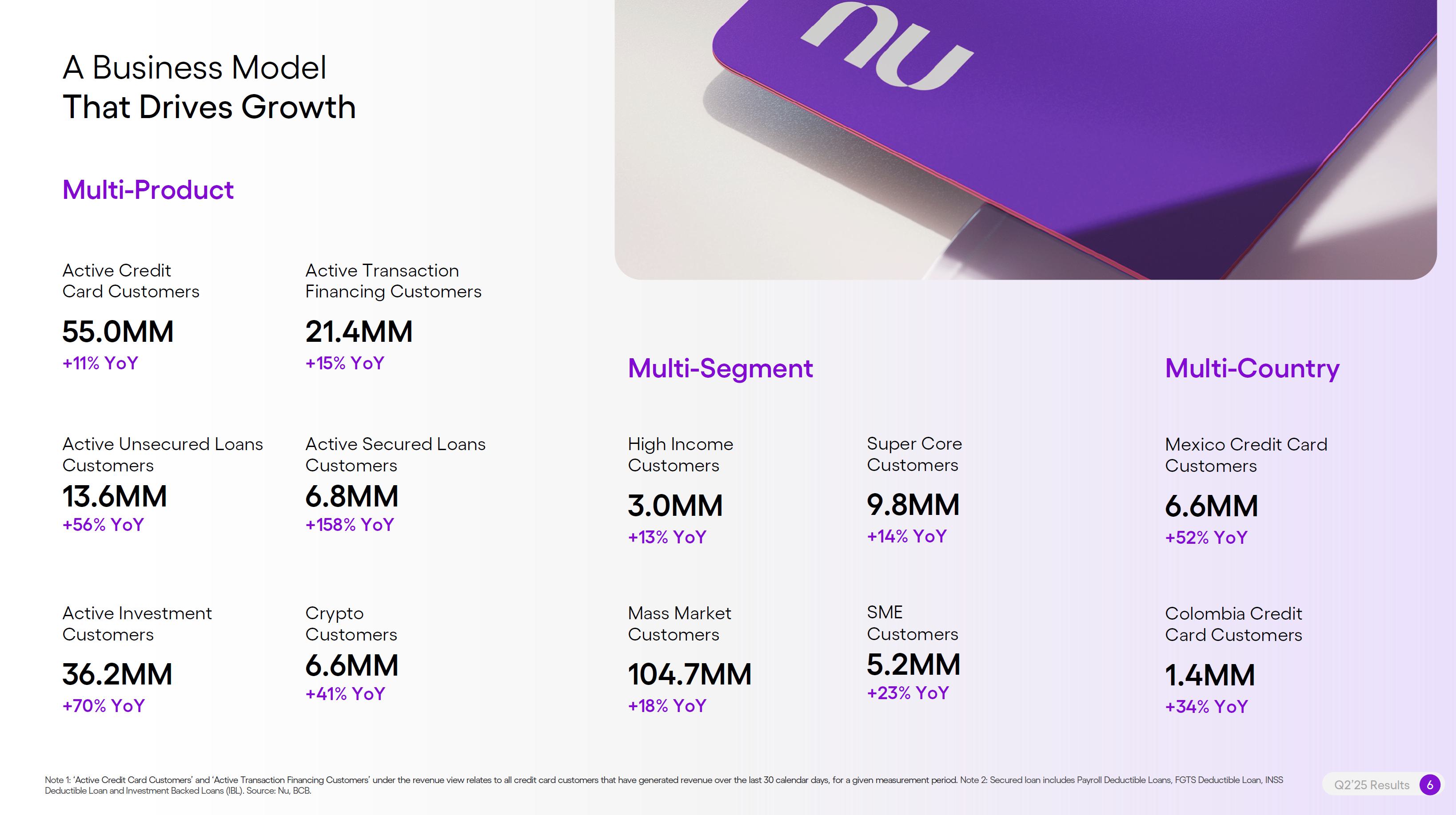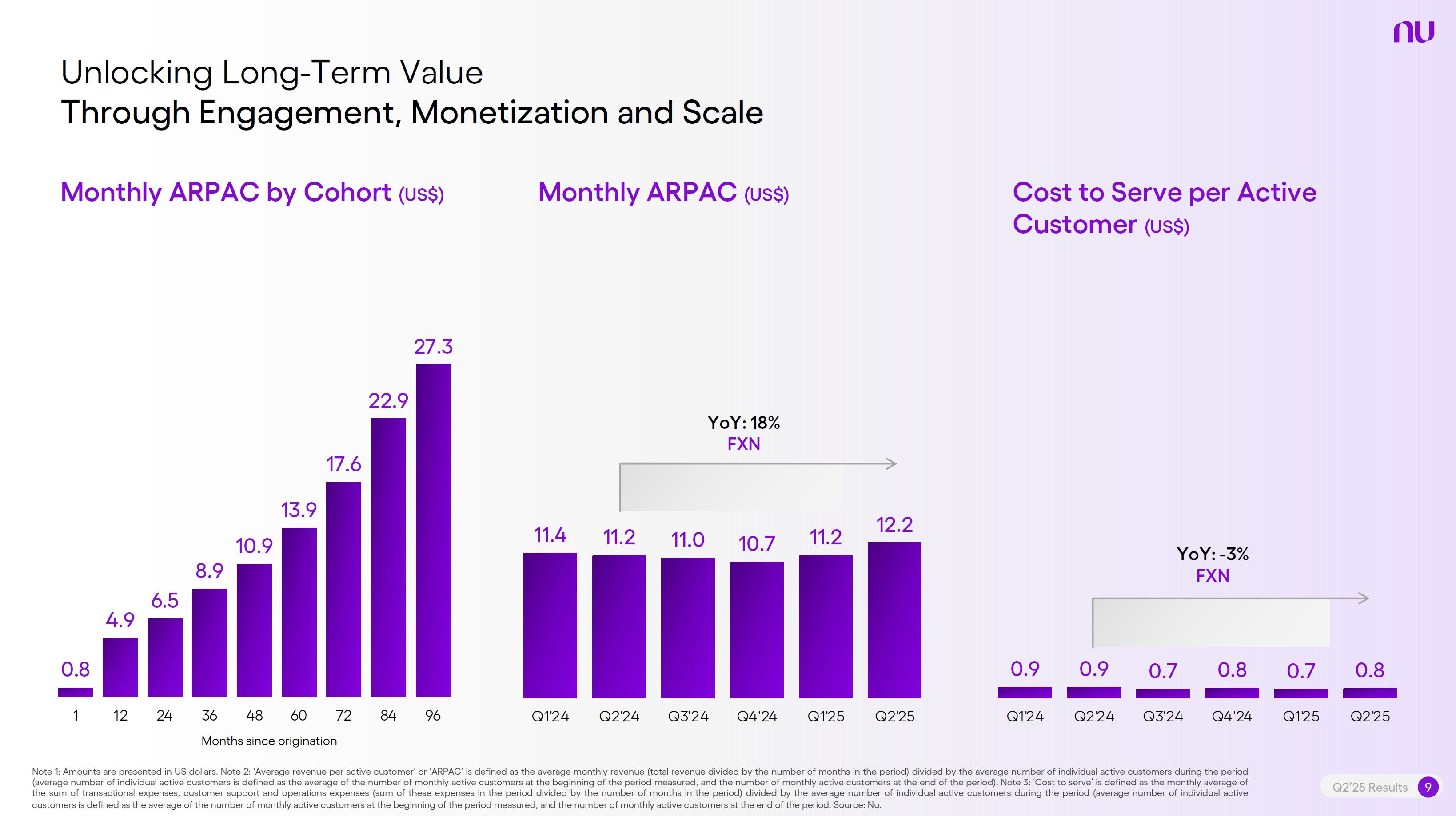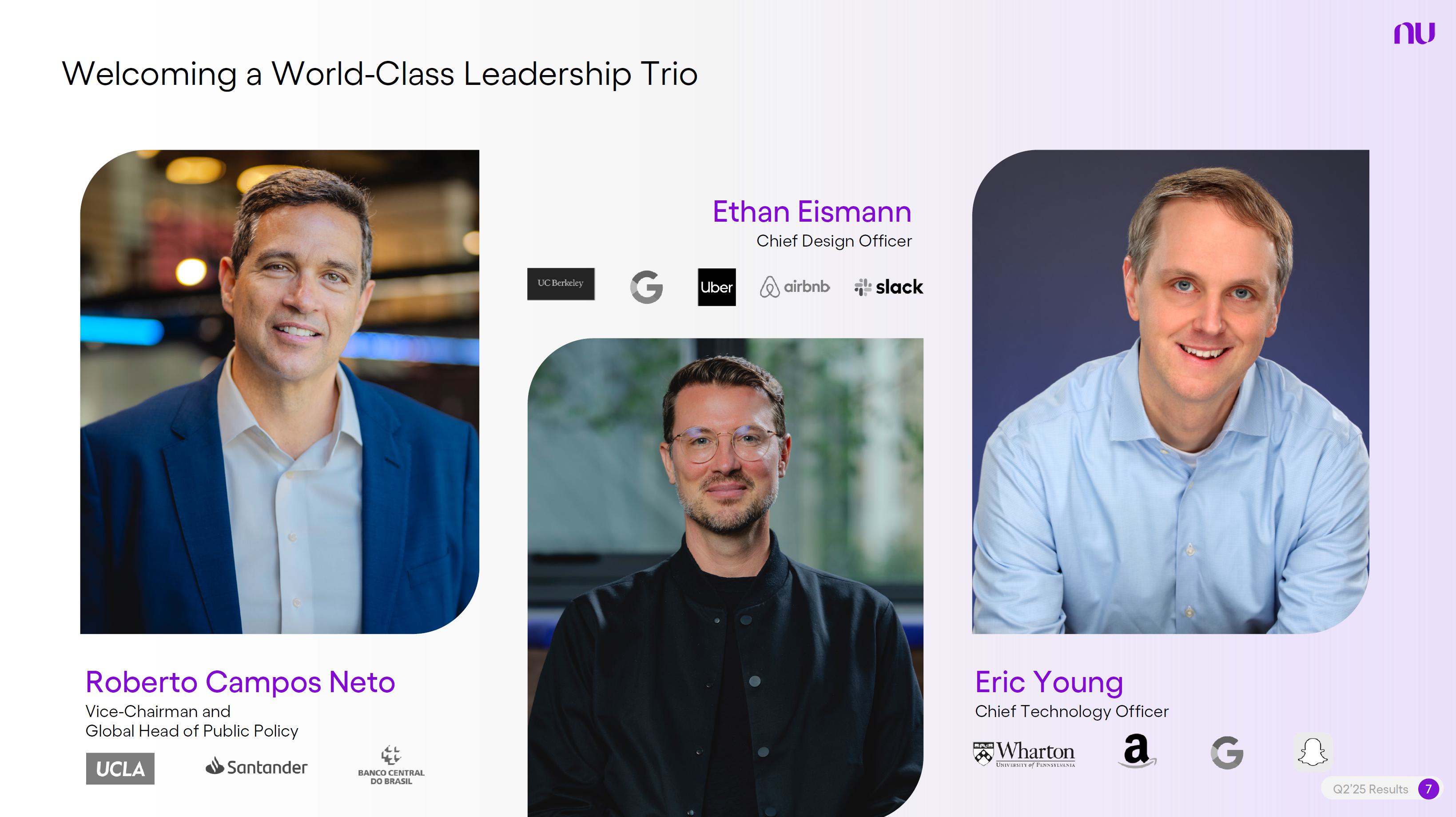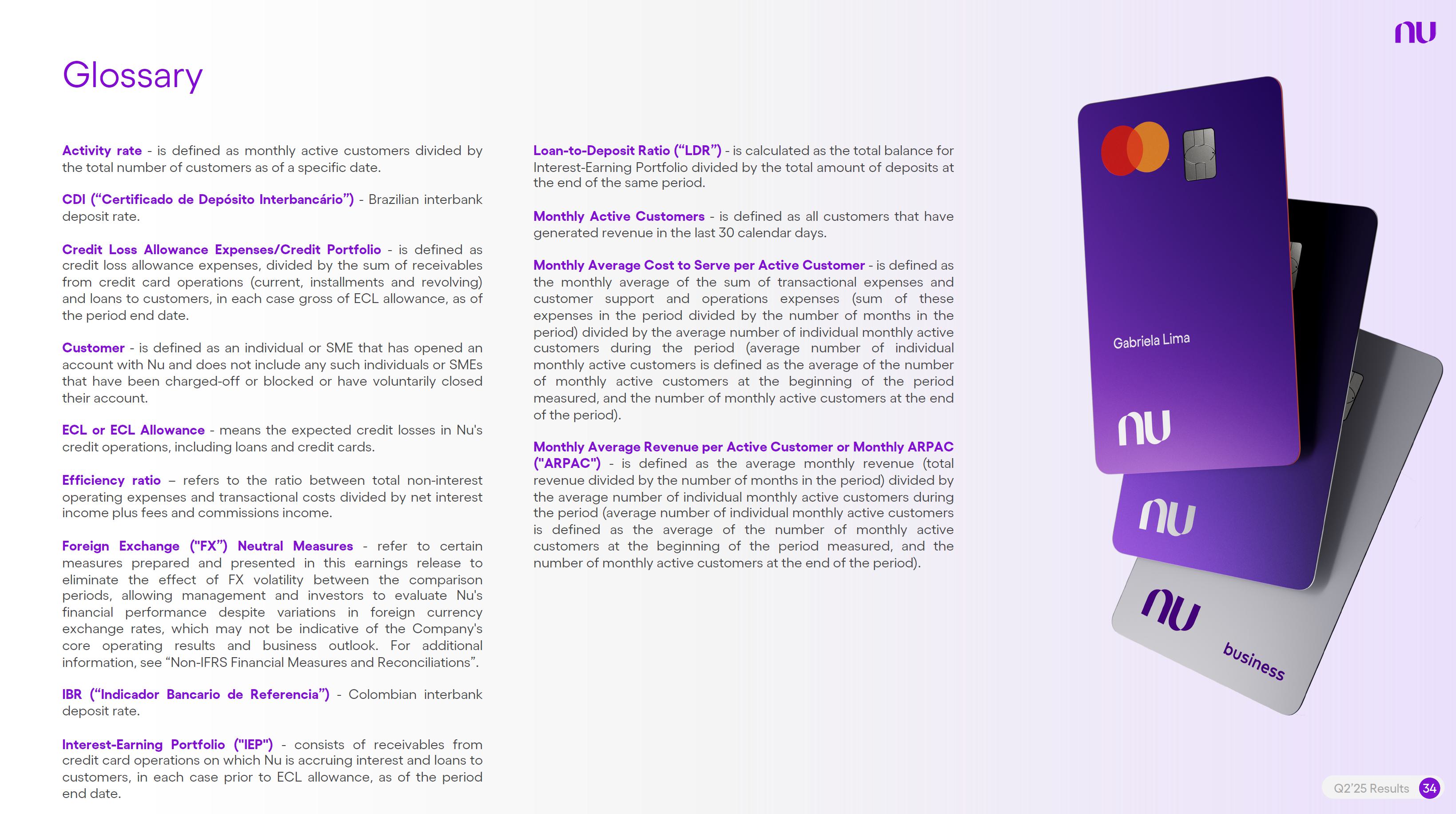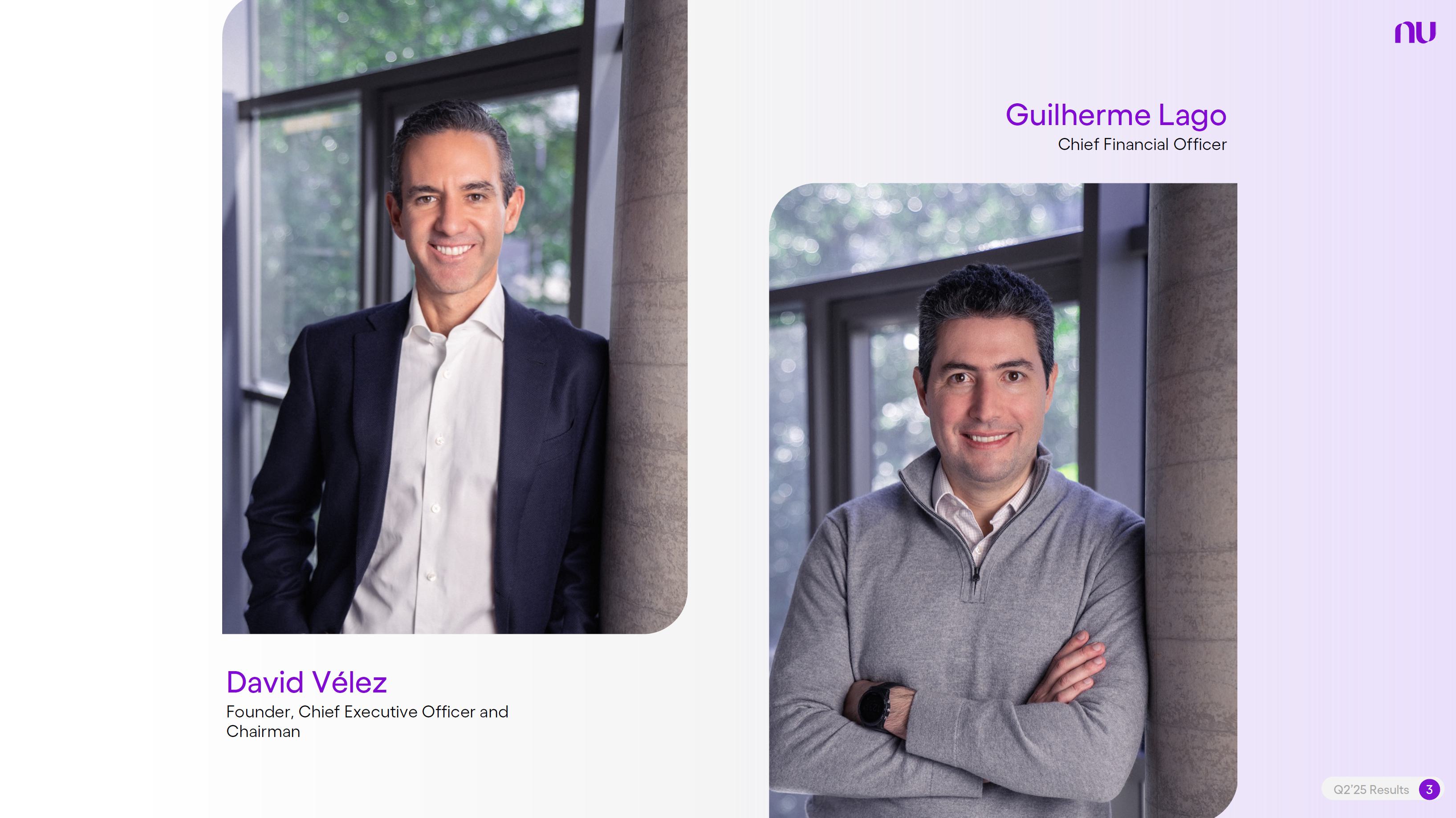 Earnings PresentationQ2 2025Aug 14, 2025  Q2’25 Results 2 Investor Relations Officer Guilherme Souto WelcomeQ2’25 Results 2 Investor Relations Officer Guilherme Souto Welcome   Guilherme LagoChief Financial OfficerDavid VélezFounder, Chief Executive Officer and ChairmanQ2’25 Results 3   DisclaimerThis presentation speaks at the date here of and the Company is under no obligation to update or keep current the information contained in this presentation. Any information expressed herein is subject to change without notice. Any market or other third-party data included in this presentation has been obtained by the Company from third-party sources. While the Company has compiled and extracted the market data, it can provide no assurances of the accuracy and completeness of such information and takes no responsibility for such data.This presentation contains forward-looking statements. All statements other than statements of historical fact contained in this presentation may be forward-looking statements and include, but are not limited to, statements regarding the Company’s intent, belief or current expectations. These forward-looking statements are subject to risks and uncertainties, and may include, among others, financial forecasts and estimates based on assumptions or statements regarding plans, objectives and expectations. Although the Company believes that these estimates and forward-looking statements are based upon reasonable assumptions, they are subject to several risks and uncertainties and are made in light of information currently available, and actual results may differ materially from those expressed or implied in the forward-looking statements due to various factors, including those risks and uncertainties included under the captions “Risk Factors” and “Management’s Discussion and Analysis of Financial Condition and Results of Operations” in the prospectus dated December 8, 2021 filed with the Securities and Exchange Commission pursuant to Rule 424(b) under the Securities Act of 1933, as amended, and in our Annual Report on Form 20-F for the year ended December 31, 2024, which was filed with the Securities and Exchange Commission on April 16, 2025.The Company, its advisers and each of their respective directors, officers and employees disclaim any obligation to update the Company’s view of such risks and uncertainties or to publicly announce the result of any revision to the forward-looking statements made herein, except where it would be required to do so under applicable law. The forward-looking statements can be identified, in certain cases, through the use of words such as “believe,” “may,” “might,” “can,” “could,” “is designed to,” “will,” “aim,” “estimate,” “continue,” “anticipate,” “intend,” “expect,” “forecast”, “plan”, “predict”, “potential”, “aspiration,” “should,” “purpose,” “belief,” and similar, or variations of, or the negative of such words and expressions. The financial information in this document includes forecasts, projections and other predictive statements that represent the Company’s assumptions and expectations in light of currently available information. These forecasts, projections and other predictive statements are based on the Company’s expectations and are subject to variables and uncertainties. The Company’s actual performance results may differ. Consequently, no guarantee is presented or implied as to the accuracy of specific forecasts, projections or predictive statements contained herein, and undue reliance should not be placed on the forward-looking statements in this presentation, which are inherently uncertain.In addition to IFRS financials, this presentation includes certain summarized, non-audited or non-IFRS financial information. These summarized, non-audited or non-IFRS financia addition to, and not a substi financial performance prepared in References in this presentati the official currency of Brazil.Q2’25 Results 4 l measures are in tute for or superior to, measures of accordance with IFRS. on to “R$” refer to the Brazilian Real,   Sustained Growth of One of theWorld's Largest Digital Banking Platforms%Adult PopulationCustomers (MM) ARPAC (US$) Revenues (US$BN)60% 13% 9%% Activity Ratio123 CAGR: 34% FXN 9 11 12 3,66884865 83%83% 1,869 42 4 1,158 33672% 105 CAGR: 31% CAGR: 85% FXN 2,849 80%82% Q2'21 Q2'22 Q2'23 Q2'24 Q2'25 Q2'21 Q2'22 Q2'23 Q2'24 Q2'25 Q2'21 Q2'22 Q2'23 Q2'24 Q2'25Gross Profit (US$MM) Efficiency Ratio (%) Net Income (US$MM)6371,54873%58%782 22535%32%28%364166(15) (30)1,359 CAGR: 78% FXN CAGR: 80% FXN 487 Q2'21 Q2'22 Q2'23 Q2'24 Q2'25 Q2'21 Q2'22 Q2'23 Q2'24 Q2'25 Q2'21 Q2'22 Q2'23 Q2'24 Q2'25Note 1: ‘Active Customers’ relates to all customers that have generated revenue over the last 30 calendar days, for a given measurement period. Note 2: ‘Activity Rate’ is defined as monthly active customers divided by the total number of customers as of a specific date. Note 3: Adult population is defined as 18+ years. Note 4: For Brazil, the % of adult population is calculated as Nu’s Brazilian adult customers divided by the adult population of the country. For Mexico and Colombia, the % is calculated as Nu’s customers divided by the adult population of each country. Note 4: ‘Average revenue per active customer’ or ‘ARPAC’ is defined as the average monthly revenue (total revenue divided by the number of months in the period) divided by the average number of individual active customers during the period (average number of individual active customers is defined as the average of the number of monthly active customers at the beginning of theperiod measured, and the number of monthly active customers at the end of the period). Note 5: Efficiency Ratio is defined as Total Operating Expenses plus Transactional Expenses divided by NII and Fees and Commission Income. Note 6: Amounts are presente