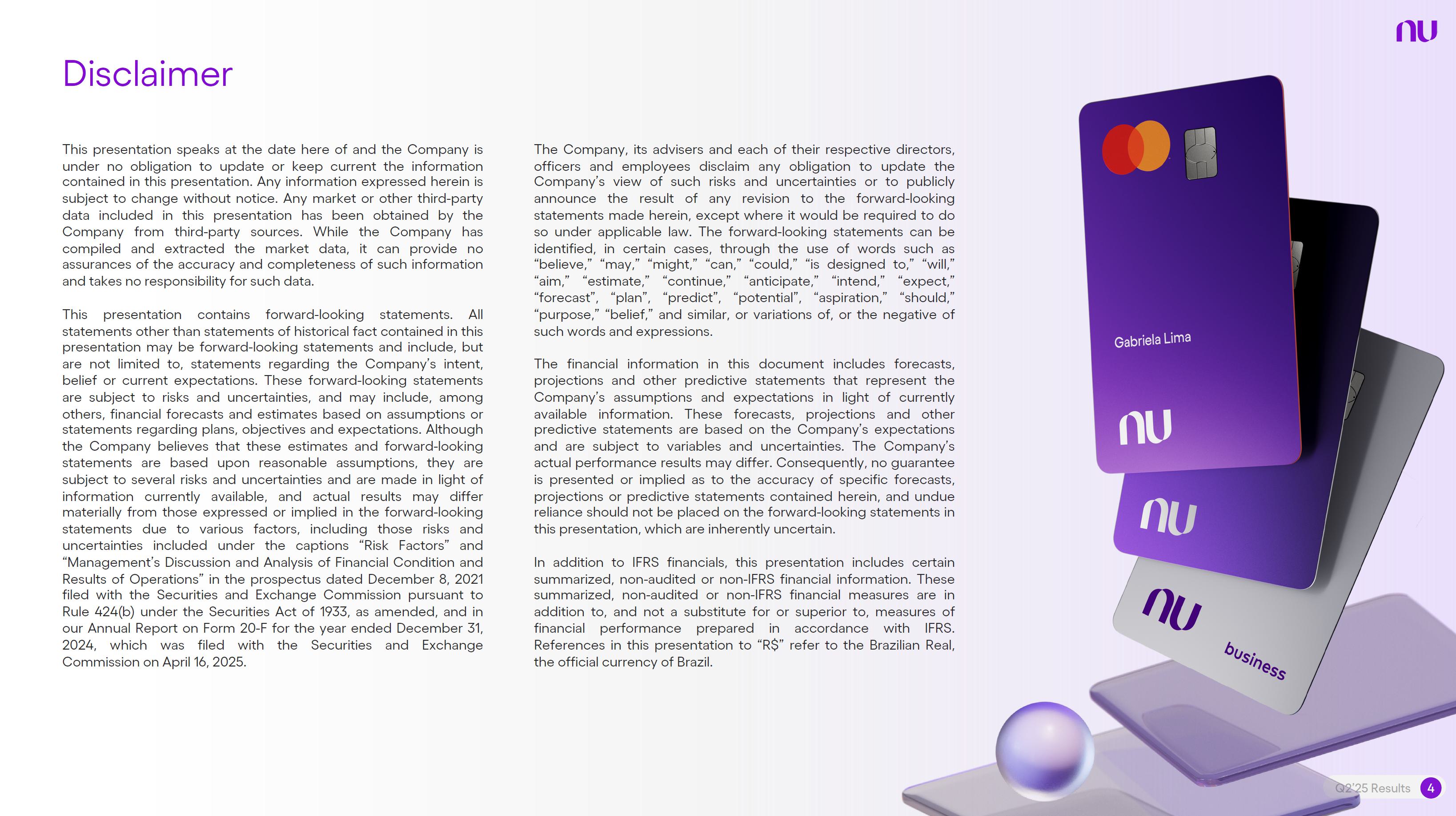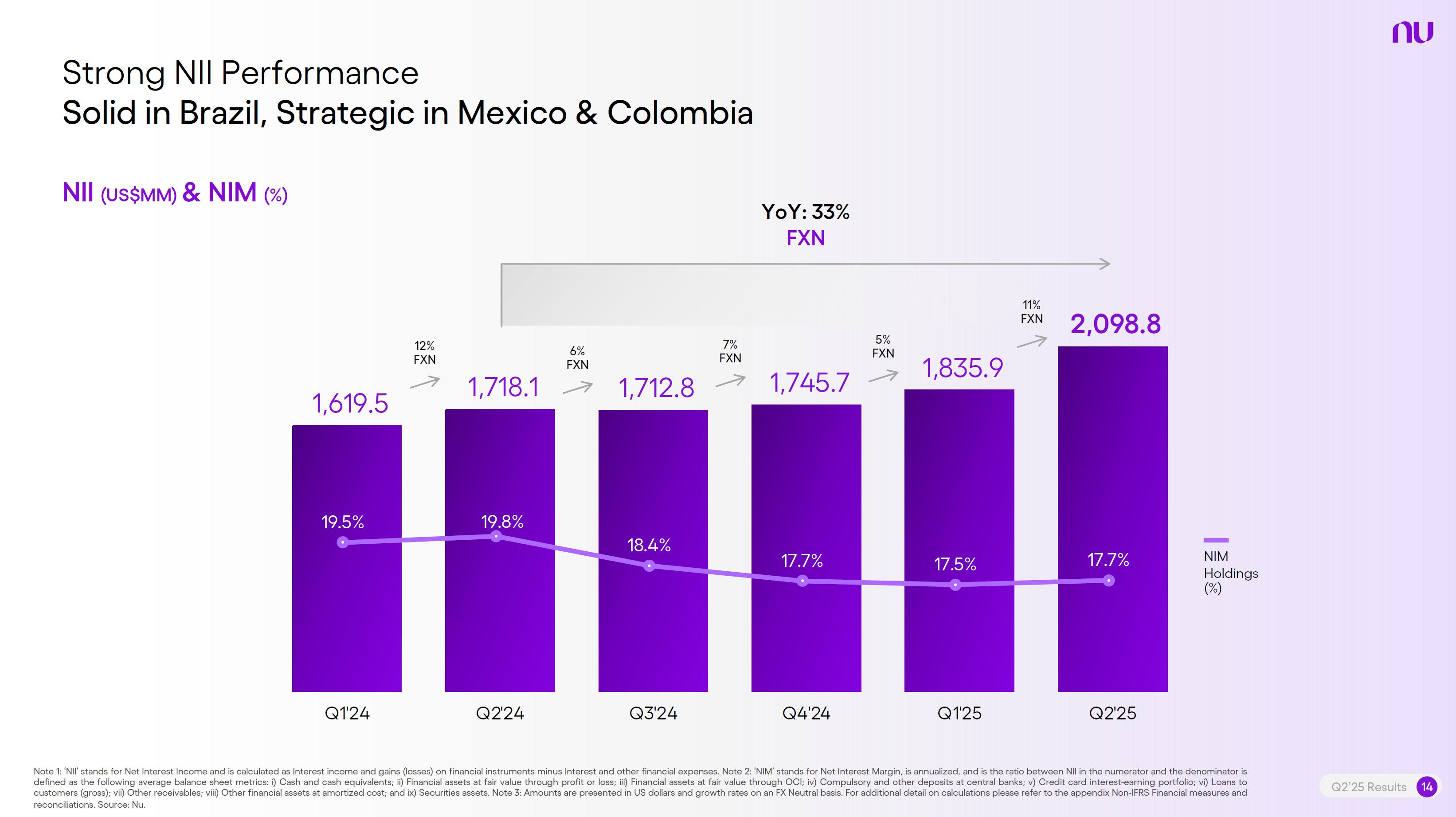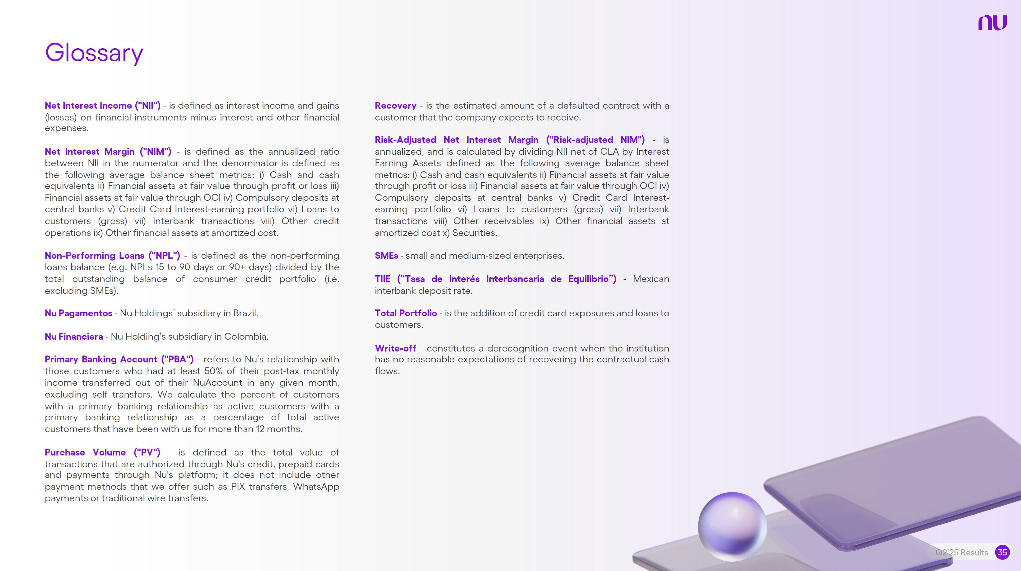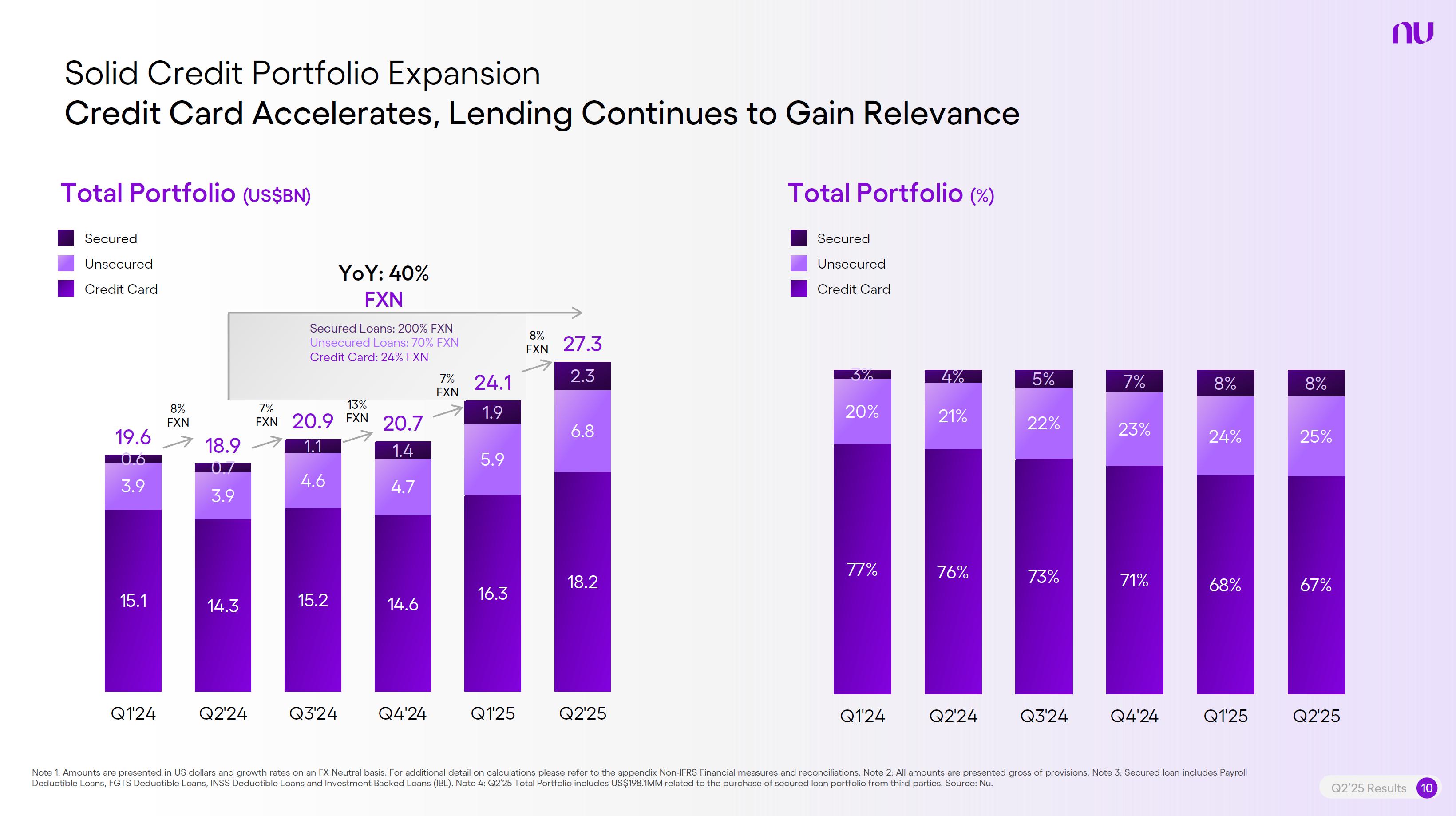 Earnings PresentationQ2 2025Aug 14, 2025  Q2’25 Results 2 Investor Relations Officer Guilherme Souto WelcomeQ2’25 Results 2 Investor Relations Officer Guilherme Souto Welcome   Guilherme LagoChief Financial OfficerDavid VélezFounder, Chief Executive Officer and ChairmanQ2’25 Results 3   DisclaimerThis presentation speaks at the date here of and the Company is under no obligation to update or keep current the information contained in this presentation. Any information expressed herein is subject to change without notice. Any market or other third-party data included in this presentation has been obtained by the Company from third-party sources. While the Company has compiled and extracted the market data, it can provide no assurances of the accuracy and completeness of such information and takes no responsibility for such data.This presentation contains forward-looking statements. All statements other than statements of historical fact contained in this presentation may be forward-looking statements and include, but are not limited to, statements regarding the Company’s intent, belief or current expectations. These forward-looking statements are subject to risks and uncertainties, and may include, among others, financial forecasts and estimates based on assumptions or statements regarding plans, objectives and expectations. Although the Company believes that these estimates and forward-looking statements are based upon reasonable assumptions, they are subject to several risks and uncertainties and are made in light of information currently available, and actual results may differ materially from those expressed or implied in the forward-looking statements due to various factors, including those risks and uncertainties included under the captions “Risk Factors” and “Management’s Discussion and Analysis of Financial Condition and Results of Operations” in the prospectus dated December 8, 2021 filed with the Securities and Exchange Commission pursuant to Rule 424(b) under the Securities Act of 1933, as amended, and in our Annual Report on Form 20-F for the year ended December 31, 2024, which was filed with the Securities and Exchange Commission on April 16, 2025.The Company, its advisers and each of their respective directors, officers and employees disclaim any obligation to update the Company’s view of such risks and uncertainties or to publicly announce the result of any revision to the forward-looking statements made herein, except where it would be required to do so under applicable law. The forward-looking statements can be identified, in certain cases, through the use of words such as “believe,” “may,” “might,” “can,” “could,” “is designed to,” “will,” “aim,” “estimate,” “continue,” “anticipate,” “intend,” “expect,” “forecast”, “plan”, “predict”, “potential”, “aspiration,” “should,” “purpose,” “belief,” and similar, or variations of, or the negative of such words and expressions. The financial information in this document includes forecasts, projections and other predictive statements that represent the Company’s assumptions and expectations in light of currently available information. These forecasts, projections and other predictive statements are based on the Company’s expectations and are subject to variables and uncertainties. The Company’s actual performance results may differ. Consequently, no guarantee is presented or implied as to the accuracy of specific forecasts, projections or predictive statements contained herein, and undue reliance should not be placed on the forward-looking statements in this presentation, which are inherently uncertain.In addition to IFRS financials, this presentation includes certain summarized, non-audited or non-IFRS financial information. These summarized, non-audited or non-IFRS financia addition to, and not a substi financial performance prepared in References in this presentati the official currency of Brazil.Q2’25 Results 4 l measures are in tute for or superior to, measures of accordance with IFRS. on to “R$” refer to the Brazilian Real,   Sustained Growth of One of theWorld's Largest Digital Banking Platforms%Adult PopulationCustomers (MM) ARPAC (US$) Revenues (US$BN)60% 13% 9%% Activity Ratio123 CAGR: 34% FXN 9 11 12 3,66884865 83%83% 1,869 42 4 1,158 33672% 105 CAGR: 31% CAGR: 85% FXN 2,849 80%82% Q2'21 Q2'22 Q2'23 Q2'24 Q2'25 Q2'21 Q2'22 Q2'23 Q2'24 Q2'25 Q2'21 Q2'22 Q2'23 Q2'24 Q2'25Gross Profit (US$MM) Efficiency Ratio (%) Net Income (US$MM)6371,54873%58%782 22535%32%28%364166(15) (30)1,359 CAGR: 78% FXN CAGR: 80% FXN 487 Q2'21 Q2'22 Q2'23 Q2'24 Q2'25 Q2'21 Q2'22 Q2'23 Q2'24 Q2'25 Q2'21 Q2'22 Q2'23 Q2'24 Q2'25Note 1: ‘Active Customers’ relates to all customers that have generated revenue over the last 30 calendar days, for a given measurement period. Note 2: ‘Activity Rate’ is defined as monthly active customers divided by the total number of customers as of a specific date. Note 3: Adult population is defined as 18+ years. Note 4: For Brazil, the % of adult population is calculated as Nu’s Brazilian adult customers divided by the adult population of the country. For Mexico and Colombia, the % is calculated as Nu’s customers divided by the adult population of each country. Note 4: ‘Average revenue per active customer’ or ‘ARPAC’ is defined as the average monthly revenue (total revenue divided by the number of months in the period) divided by the average number of individual active customers during the period (average number of individual active customers is defined as the average of the number of monthly active customers at the beginning of theperiod measured, and the number of monthly active customers at the end of the period). Note 5: Efficiency Ratio is defined as Total Operating Expenses plus Transactional Expenses divided by NII and Fees and Commission Income. Note 6: Amounts are presente