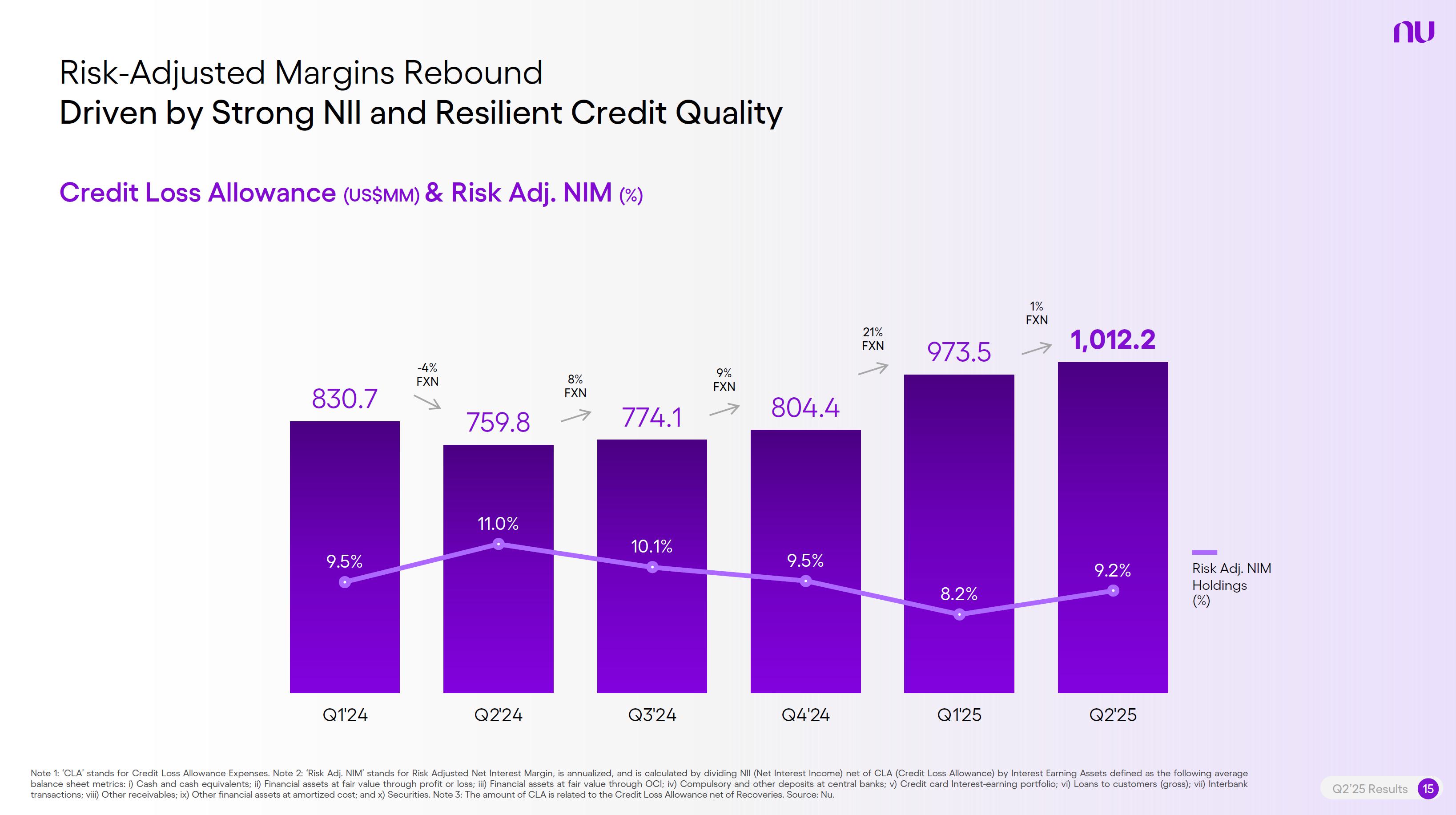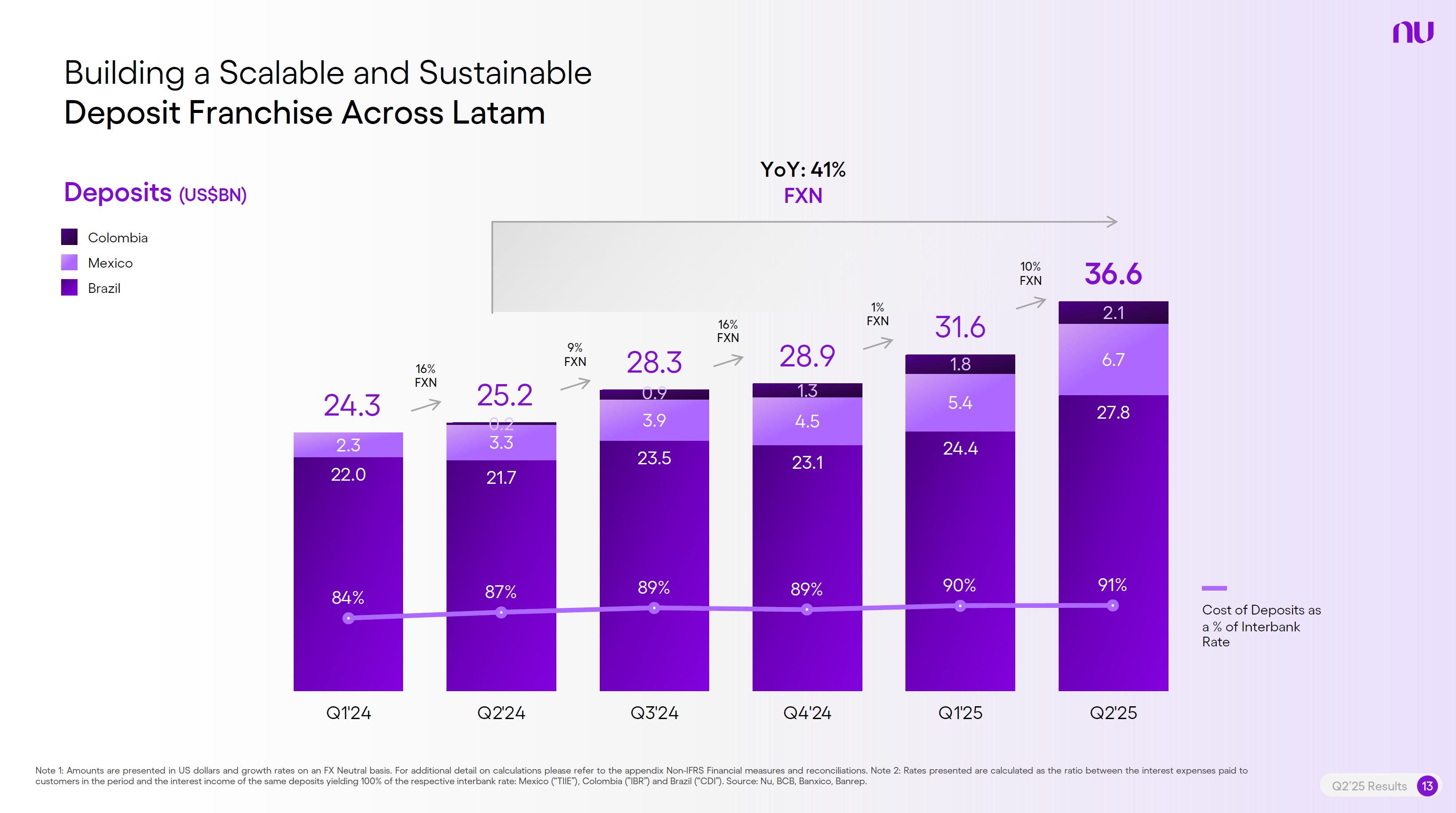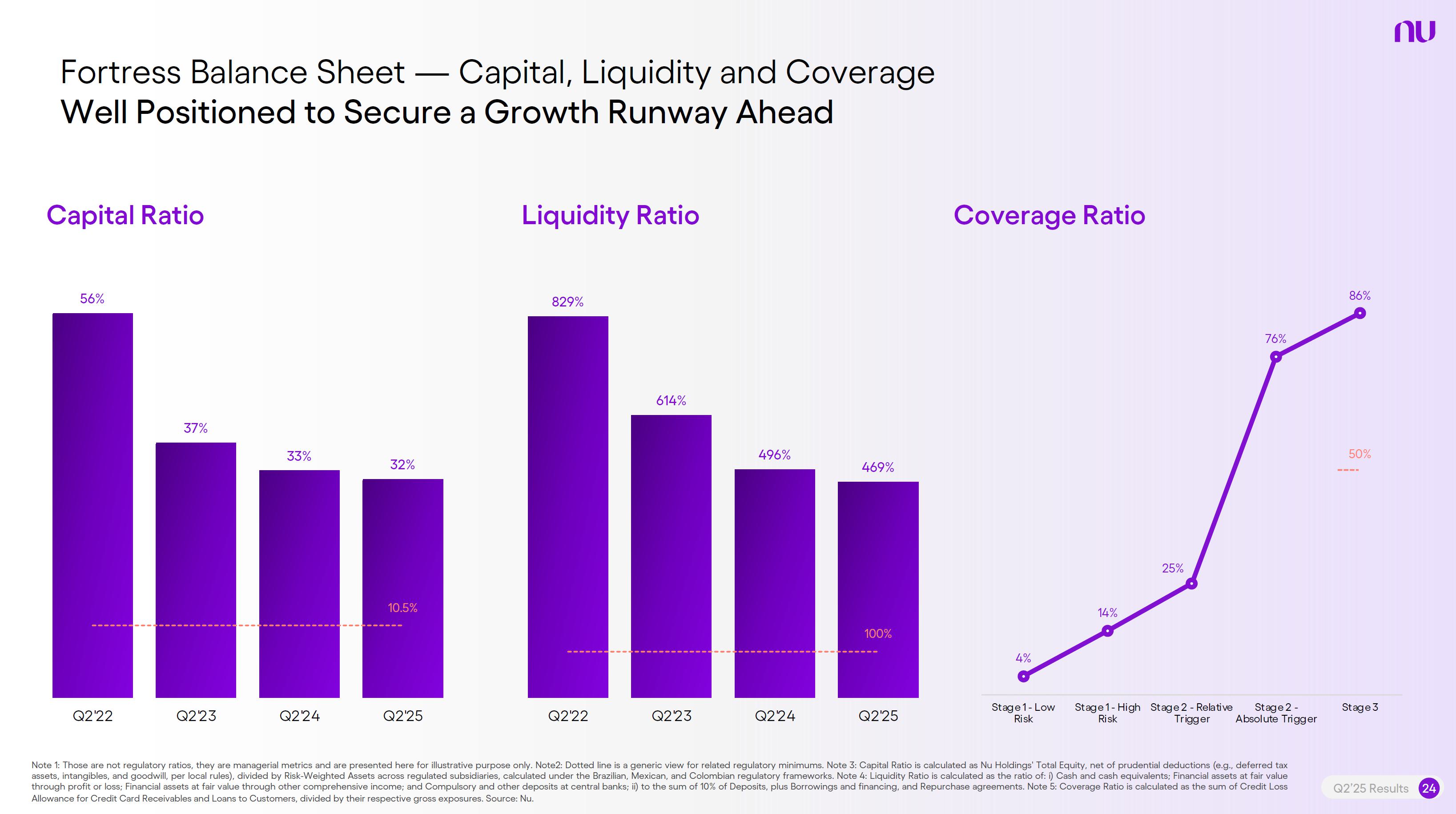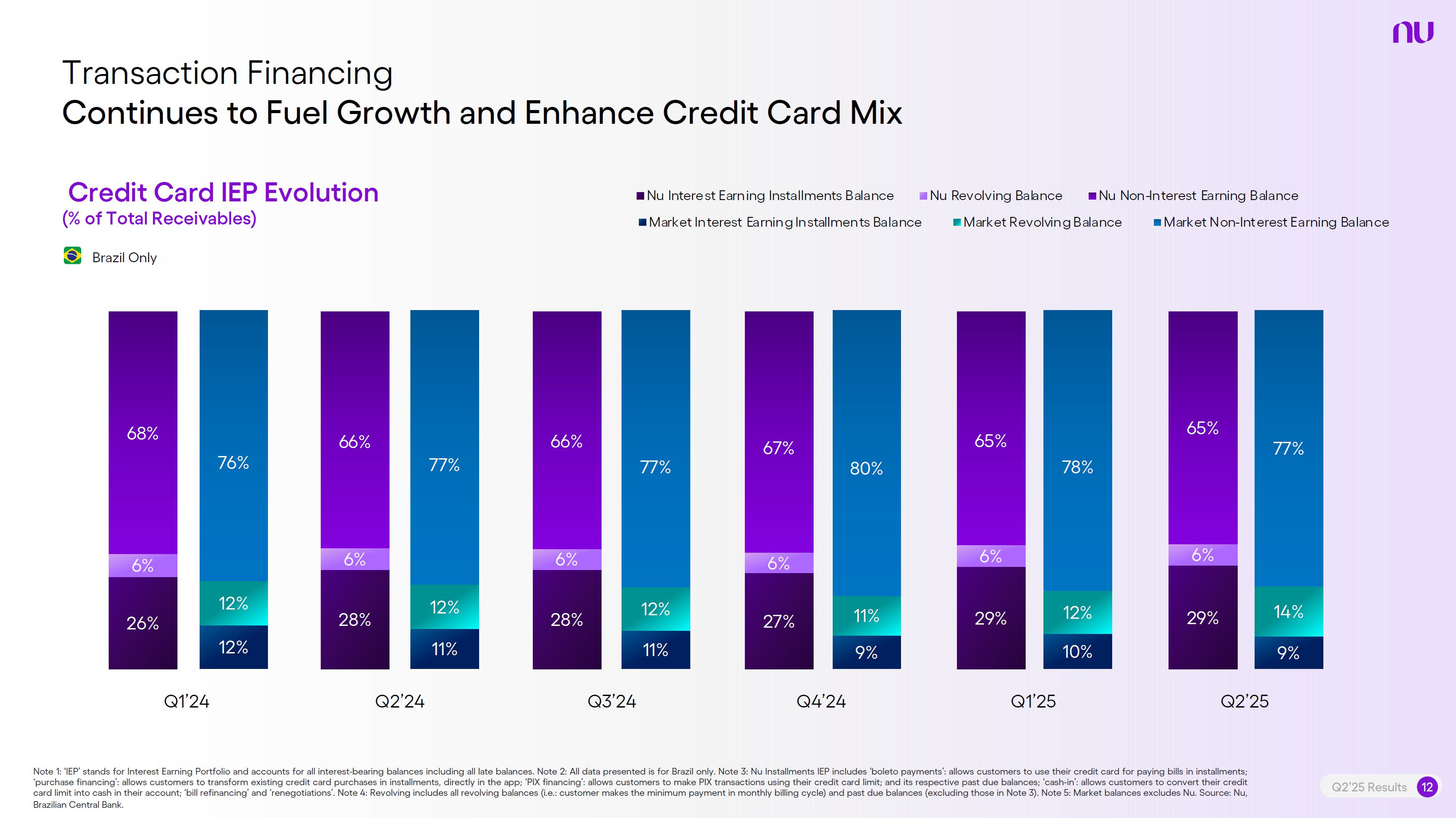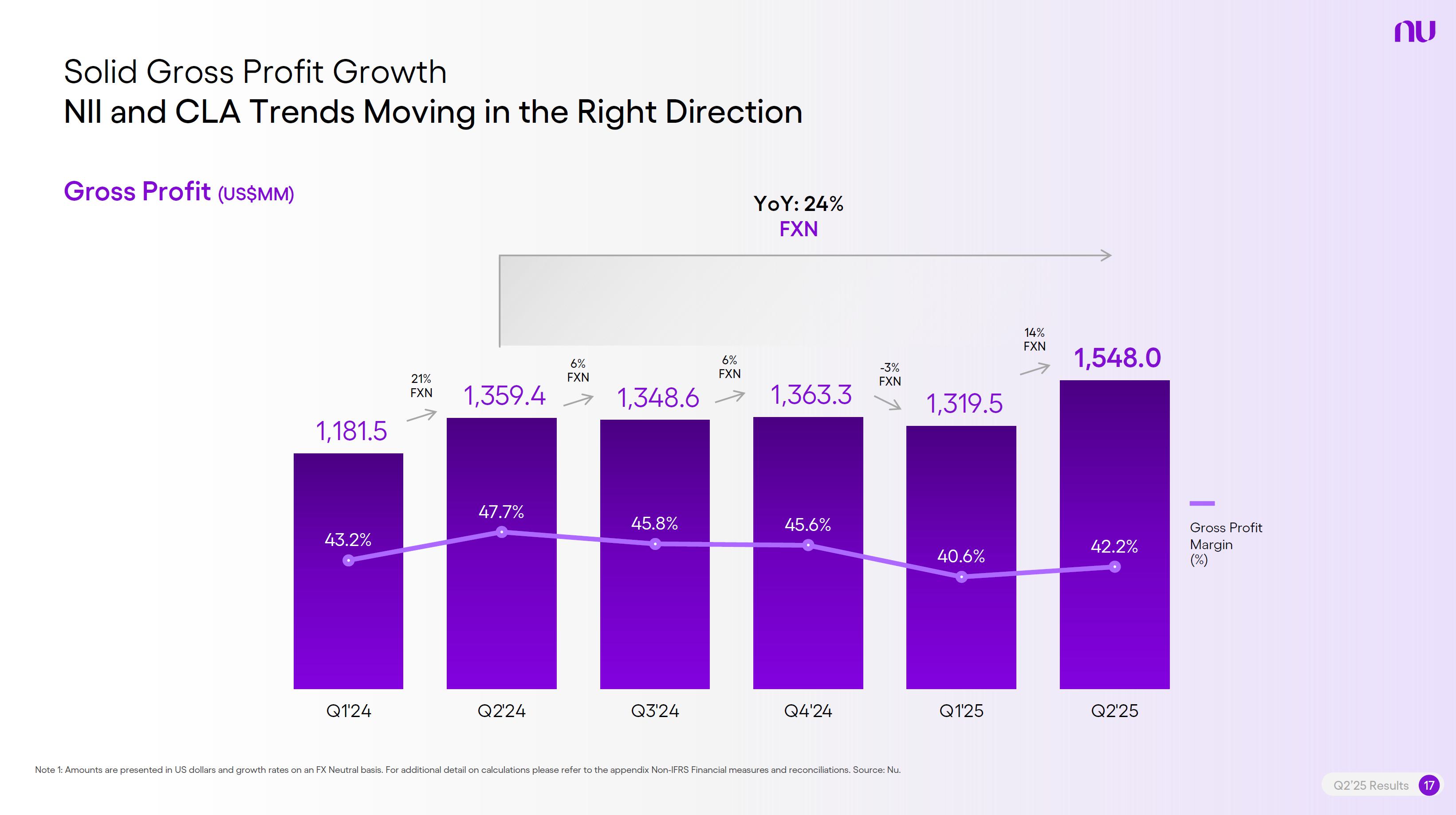 Earnings PresentationQ2 2025Aug 14, 2025  Q2’25 Results 2 Investor Relations Officer Guilherme Souto WelcomeQ2’25 Results 2 Investor Relations Officer Guilherme Souto Welcome   Guilherme LagoChief Financial OfficerDavid VélezFounder, Chief Executive Officer and ChairmanQ2’25 Results 3   DisclaimerThis presentation speaks at the date here of and the Company is under no obligation to update or keep current the information contained in this presentation. Any information expressed herein is subject to change without notice. Any market or other third-party data included in this presentation has been obtained by the Company from third-party sources. While the Company has compiled and extracted the market data, it can provide no assurances of the accuracy and completeness of such information and takes no responsibility for such data.This presentation contains forward-looking statements. All statements other than statements of historical fact contained in this presentation may be forward-looking statements and include, but are not limited to, statements regarding the Company’s intent, belief or current expectations. These forward-looking statements are subject to risks and uncertainties, and may include, among others, financial forecasts and estimates based on assumptions or statements regarding plans, objectives and expectations. Although the Company believes that these estimates and forward-looking statements are based upon reasonable assumptions, they are subject to several risks and uncertainties and are made in light of information currently available, and actual results may differ materially from those expressed or implied in the forward-looking statements due to various factors, including those risks and uncertainties included under the captions “Risk Factors” and “Management’s Discussion and Analysis of Financial Condition and Results of Operations” in the prospectus dated December 8, 2021 filed with the Securities and Exchange Commission pursuant to Rule 424(b) under the Securities Act of 1933, as amended, and in our Annual Report on Form 20-F for the year ended December 31, 2024, which was filed with the Securities and Exchange Commission on April 16, 2025.The Company, its advisers and each of their respective directors, officers and employees disclaim any obligation to update the Company’s view of such risks and uncertainties or to publicly announce the result of any revision to the forward-looking statements made herein, except where it would be required to do so under applicable law. The forward-looking statements can be identified, in certain cases, through the use of words such as “believe,” “may,” “might,” “can,” “could,” “is designed to,” “will,” “aim,” “estimate,” “continue,” “anticipate,” “intend,” “expect,” “forecast”, “plan”, “predict”, “potential”, “aspiration,” “should,” “purpose,” “belief,” and similar, or variations of, or the negative of such words and expressions. The financial information in this document includes forecasts, projections and other predictive statements that represent the Company’s assumptions and expectations in light of currently available information. These forecasts, projections and other predictive statements are based on the Company’s expectations and are subject to variables and uncertainties. The Company’s actual performance results may differ. Consequently, no guarantee is presented or implied as to the accuracy of specific forecasts, projections or predictive statements contained herein, and undue reliance should not be placed on the forward-looking statements in this presentation, which are inherently uncertain.In addition to IFRS financials, this presentation includes certain summarized, non-audited or non-IFRS financial information. These summarized, non-audited or non-IFRS financia addition to, and not a substi financial performance prepared in References in this presentati the official currency of Brazil.Q2’25 Results 4 l measures are in tute for or superior to, measures of accordance with IFRS. on to “R$” refer to the Brazilian Real,   Sustained Growth of One of theWorld's Largest Digital Banking Platforms%Adult PopulationCustomers (MM) ARPAC (US$) Revenues (US$BN)60% 13% 9%% Activity Ratio123 CAGR: 34% FXN 9 11 12 3,66884865 83%83% 1,869 42 4 1,158 33672% 105 CAGR: 31% CAGR: 85% FXN 2,849 80%82% Q2'21 Q2'22 Q2'23 Q2'24 Q2'25 Q2'21 Q2'22 Q2'23 Q2'24 Q2'25 Q2'21 Q2'22 Q2'23 Q2'24 Q2'25Gross Profit (US$MM) Efficiency Ratio (%) Net Income (US$MM)6371,54873%58%782 22535%32%28%364166(15) (30)1,359 CAGR: 78% FXN CAGR: 80% FXN 487 Q2'21 Q2'22 Q2'23 Q2'24 Q2'25 Q2'21 Q2'22 Q2'23 Q2'24 Q2'25 Q2'21 Q2'22 Q2'23 Q2'24 Q2'25Note 1: ‘Active Customers’ relates to all customers that have generated revenue over the last 30 calendar days, for a given measurement period. Note 2: ‘Activity Rate’ is defined as monthly active customers divided by the total number of customers as of a specific date. Note 3: Adult population is defined as 18+ years. Note 4: For Brazil, the % of adult population is calculated as Nu’s Brazilian adult customers divided by the adult population of the country. For Mexico and Colombia, the % is calculated as Nu’s customers divided by the adult population of each country. Note 4: ‘Average revenue per active customer’ or ‘ARPAC’ is defined as the average monthly revenue (total revenue divided by the number of months in the period) divided by the average number of individual active customers during the period (average number of individual active customers is defined as the average of the number of monthly active customers at the beginning of theperiod measured, and the number of monthly active customers at the end of the period). Note 5: Efficiency Ratio is defined as Total Operating Expenses plus Transactional Expenses divided by NII and Fees and Commission Income. Note 6: Amounts are presente