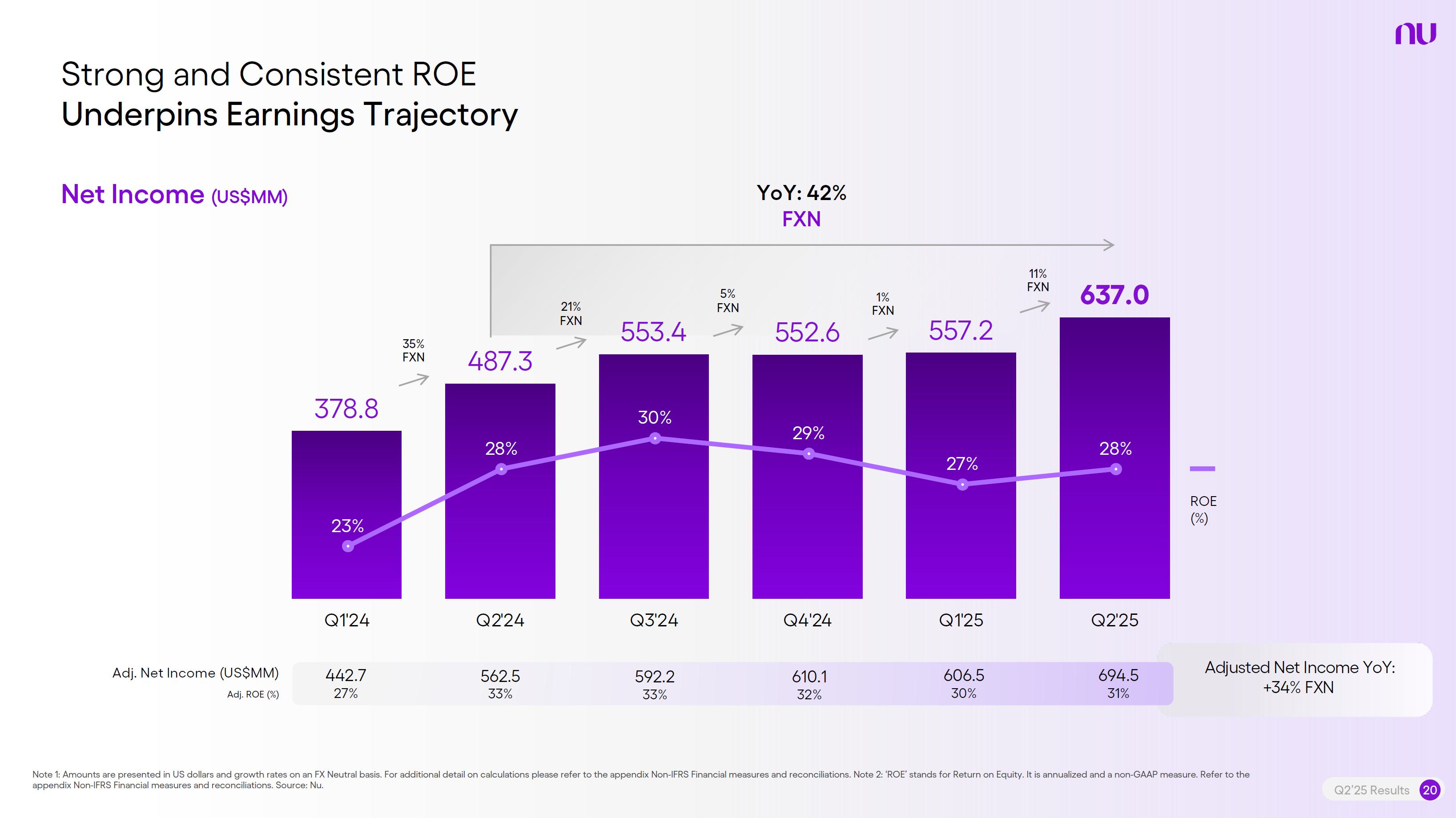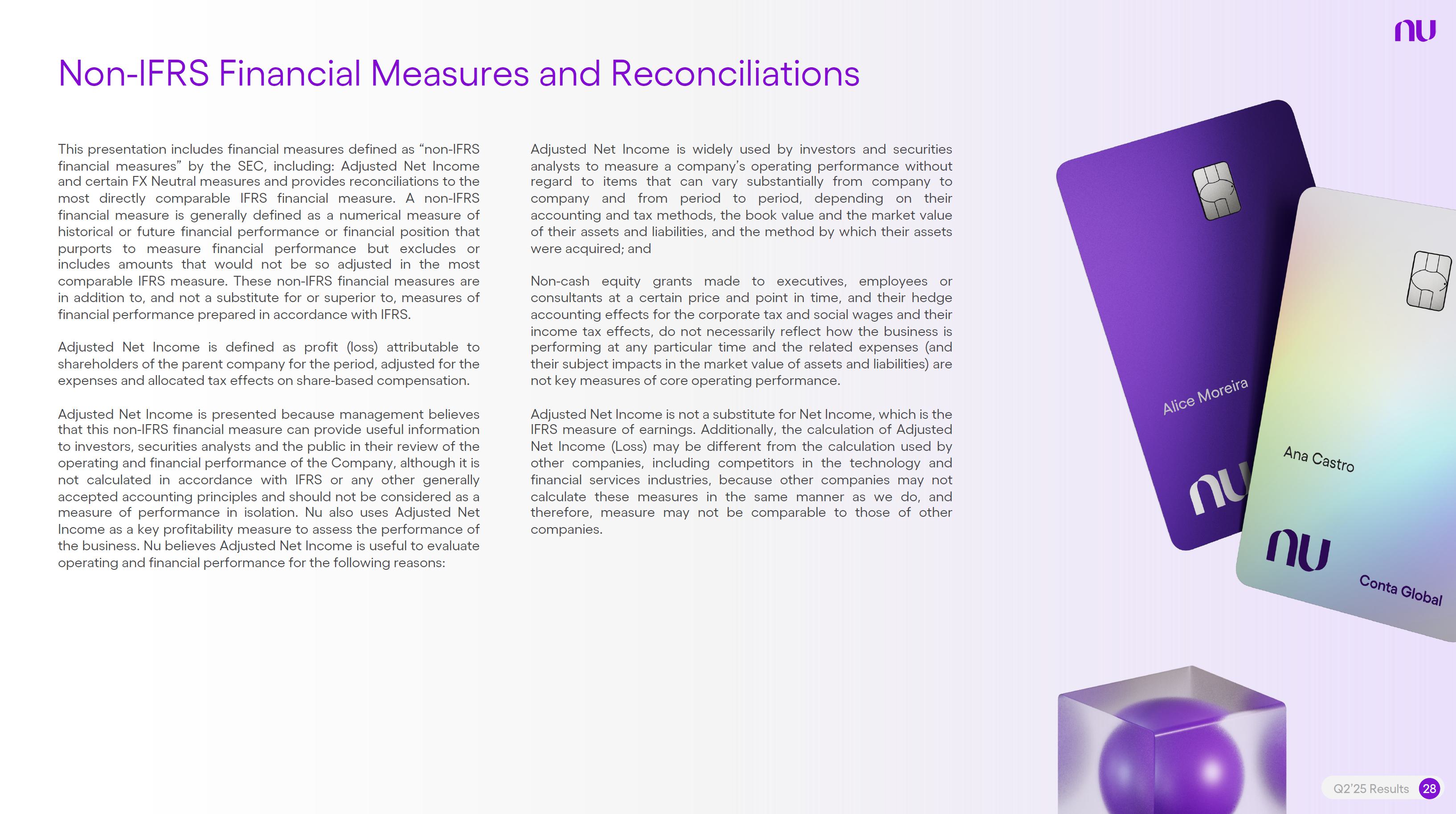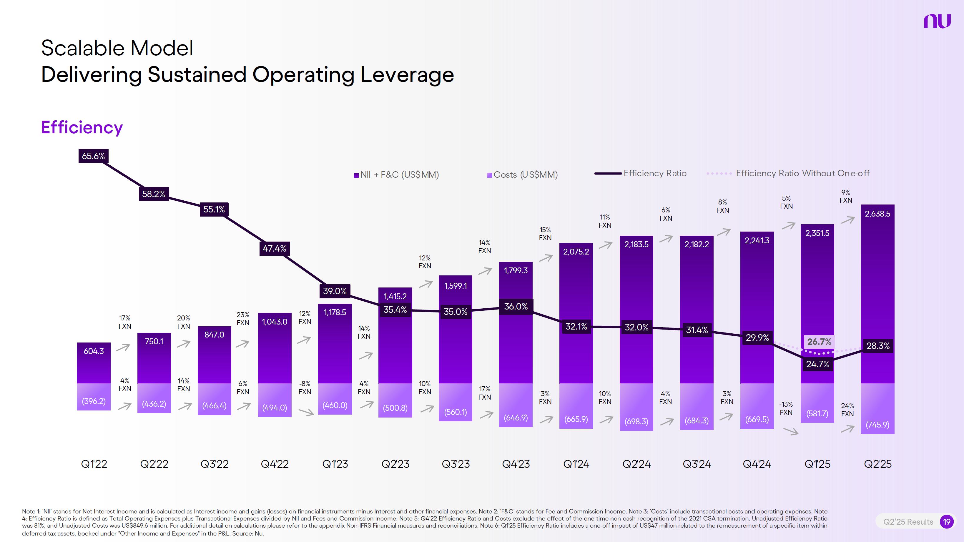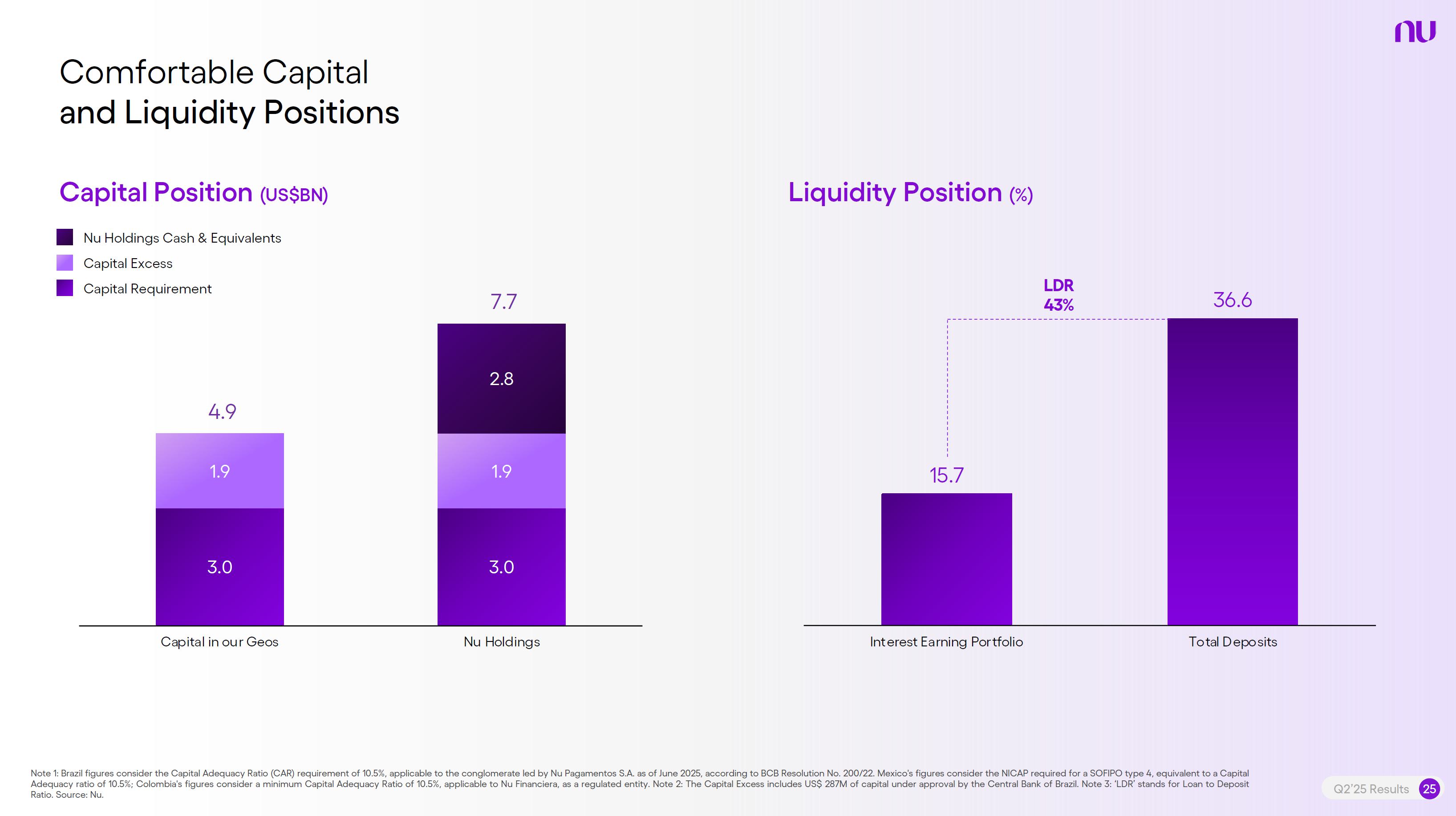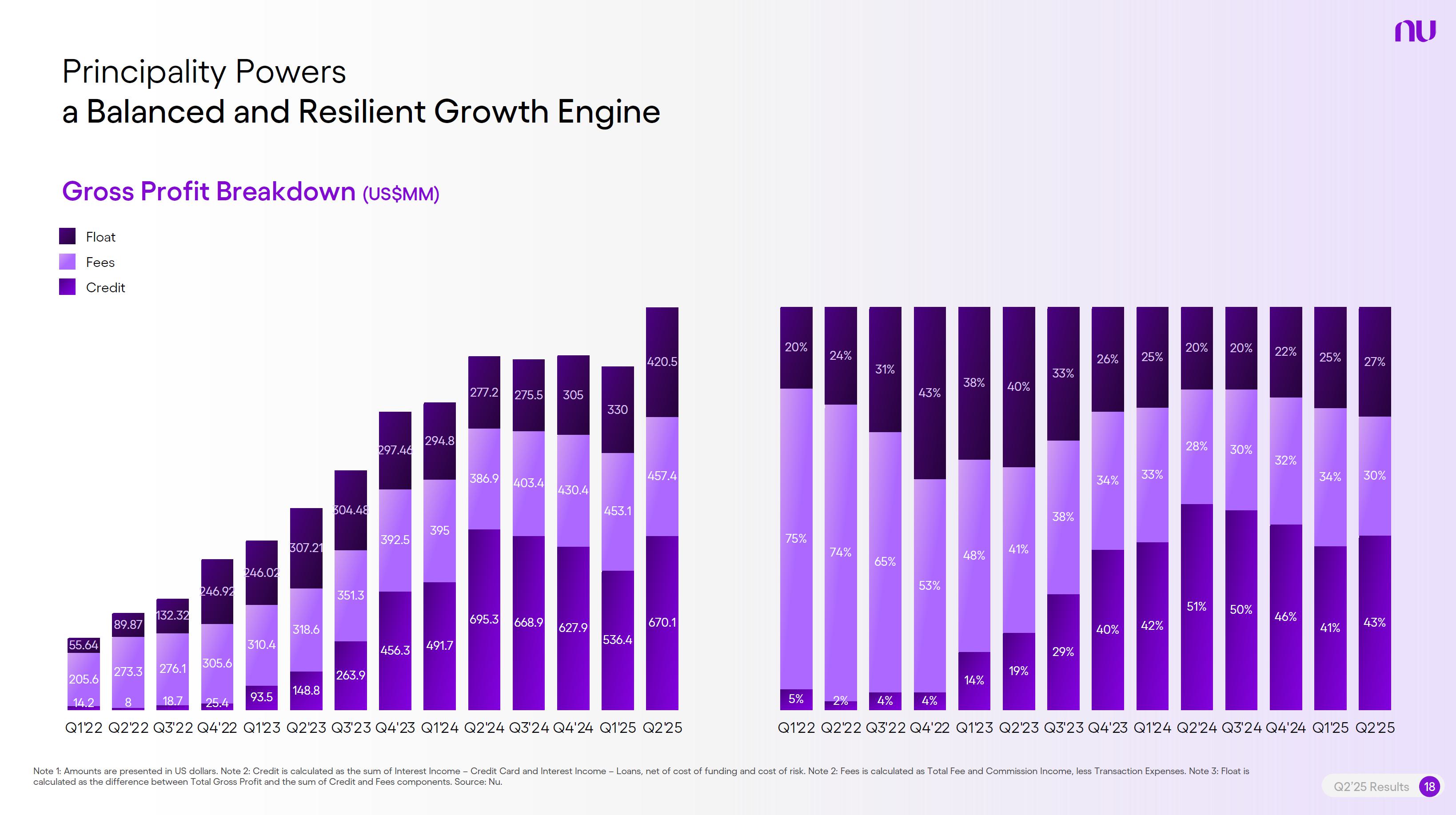 Earnings PresentationQ2 2025Aug 14, 2025  Q2’25 Results 2 Investor Relations Officer Guilherme Souto WelcomeQ2’25 Results 2 Investor Relations Officer Guilherme Souto Welcome   Guilherme LagoChief Financial OfficerDavid VélezFounder, Chief Executive Officer and ChairmanQ2’25 Results 3   DisclaimerThis presentation speaks at the date here of and the Company is under no obligation to update or keep current the information contained in this presentation. Any information expressed herein is subject to change without notice. Any market or other third-party data included in this presentation has been obtained by the Company from third-party sources. While the Company has compiled and extracted the market data, it can provide no assurances of the accuracy and completeness of such information and takes no responsibility for such data.This presentation contains forward-looking statements. All statements other than statements of historical fact contained in this presentation may be forward-looking statements and include, but are not limited to, statements regarding the Company’s intent, belief or current expectations. These forward-looking statements are subject to risks and uncertainties, and may include, among others, financial forecasts and estimates based on assumptions or statements regarding plans, objectives and expectations. Although the Company believes that these estimates and forward-looking statements are based upon reasonable assumptions, they are subject to several risks and uncertainties and are made in light of information currently available, and actual results may differ materially from those expressed or implied in the forward-looking statements due to various factors, including those risks and uncertainties included under the captions “Risk Factors” and “Management’s Discussion and Analysis of Financial Condition and Results of Operations” in the prospectus dated December 8, 2021 filed with the Securities and Exchange Commission pursuant to Rule 424(b) under the Securities Act of 1933, as amended, and in our Annual Report on Form 20-F for the year ended December 31, 2024, which was filed with the Securities and Exchange Commission on April 16, 2025.The Company, its advisers and each of their respective directors, officers and employees disclaim any obligation to update the Company’s view of such risks and uncertainties or to publicly announce the result of any revision to the forward-looking statements made herein, except where it would be required to do so under applicable law. The forward-looking statements can be identified, in certain cases, through the use of words such as “believe,” “may,” “might,” “can,” “could,” “is designed to,” “will,” “aim,” “estimate,” “continue,” “anticipate,” “intend,” “expect,” “forecast”, “plan”, “predict”, “potential”, “aspiration,” “should,” “purpose,” “belief,” and similar, or variations of, or the negative of such words and expressions. The financial information in this document includes forecasts, projections and other predictive statements that represent the Company’s assumptions and expectations in light of currently available information. These forecasts, projections and other predictive statements are based on the Company’s expectations and are subject to variables and uncertainties. The Company’s actual performance results may differ. Consequently, no guarantee is presented or implied as to the accuracy of specific forecasts, projections or predictive statements contained herein, and undue reliance should not be placed on the forward-looking statements in this presentation, which are inherently uncertain.In addition to IFRS financials, this presentation includes certain summarized, non-audited or non-IFRS financial information. These summarized, non-audited or non-IFRS financia addition to, and not a substi financial performance prepared in References in this presentati the official currency of Brazil.Q2’25 Results 4 l measures are in tute for or superior to, measures of accordance with IFRS. on to “R$” refer to the Brazilian Real,   Sustained Growth of One of theWorld's Largest Digital Banking Platforms%Adult PopulationCustomers (MM) ARPAC (US$) Revenues (US$BN)60% 13% 9%% Activity Ratio123 CAGR: 34% FXN 9 11 12 3,66884865 83%83% 1,869 42 4 1,158 33672% 105 CAGR: 31% CAGR: 85% FXN 2,849 80%82% Q2'21 Q2'22 Q2'23 Q2'24 Q2'25 Q2'21 Q2'22 Q2'23 Q2'24 Q2'25 Q2'21 Q2'22 Q2'23 Q2'24 Q2'25Gross Profit (US$MM) Efficiency Ratio (%) Net Income (US$MM)6371,54873%58%782 22535%32%28%364166(15) (30)1,359 CAGR: 78% FXN CAGR: 80% FXN 487 Q2'21 Q2'22 Q2'23 Q2'24 Q2'25 Q2'21 Q2'22 Q2'23 Q2'24 Q2'25 Q2'21 Q2'22 Q2'23 Q2'24 Q2'25Note 1: ‘Active Customers’ relates to all customers that have generated revenue over the last 30 calendar days, for a given measurement period. Note 2: ‘Activity Rate’ is defined as monthly active customers divided by the total number of customers as of a specific date. Note 3: Adult population is defined as 18+ years. Note 4: For Brazil, the % of adult population is calculated as Nu’s Brazilian adult customers divided by the adult population of the country. For Mexico and Colombia, the % is calculated as Nu’s customers divided by the adult population of each country. Note 4: ‘Average revenue per active customer’ or ‘ARPAC’ is defined as the average monthly revenue (total revenue divided by the number of months in the period) divided by the average number of individual active customers during the period (average number of individual active customers is defined as the average of the number of monthly active customers at the beginning of theperiod measured, and the number of monthly active customers at the end of the period). Note 5: Efficiency Ratio is defined as Total Operating Expenses plus Transactional Expenses divided by NII and Fees and Commission Income. Note 6: Amounts are presente